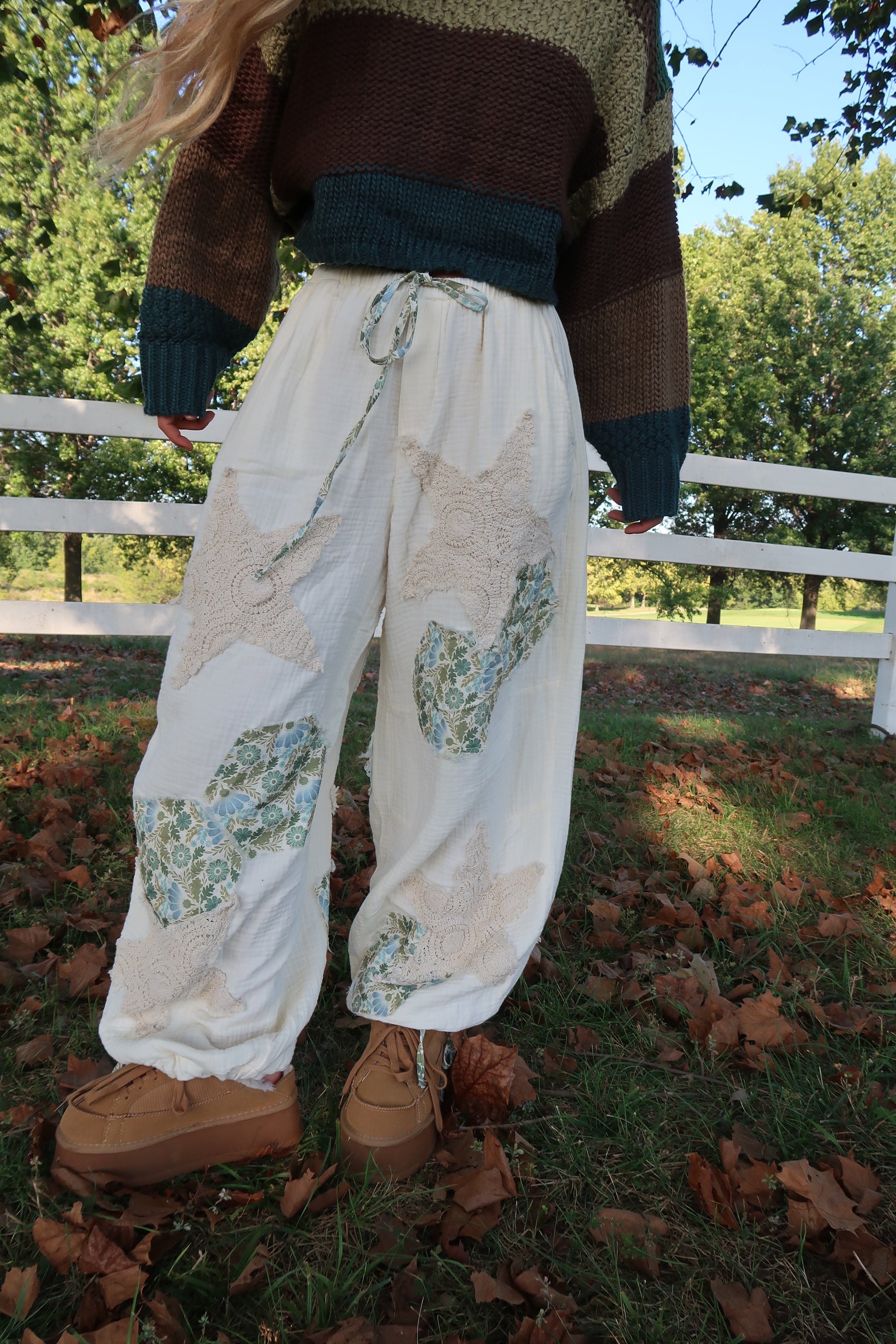 Get ready to elevate your jogger game with our Boho Breeze Patchwork Jogger! Made from cream cotton gauze, these joggers feature beautiful green and teal floral patchwork with crochet details. You'll love the adjustable tie waist and tie ankle details - perfect for a unique and stylish look.