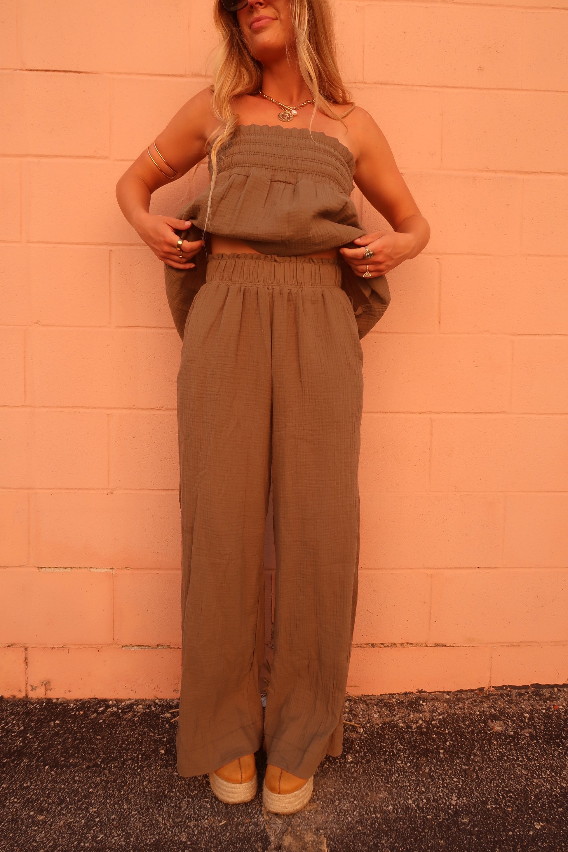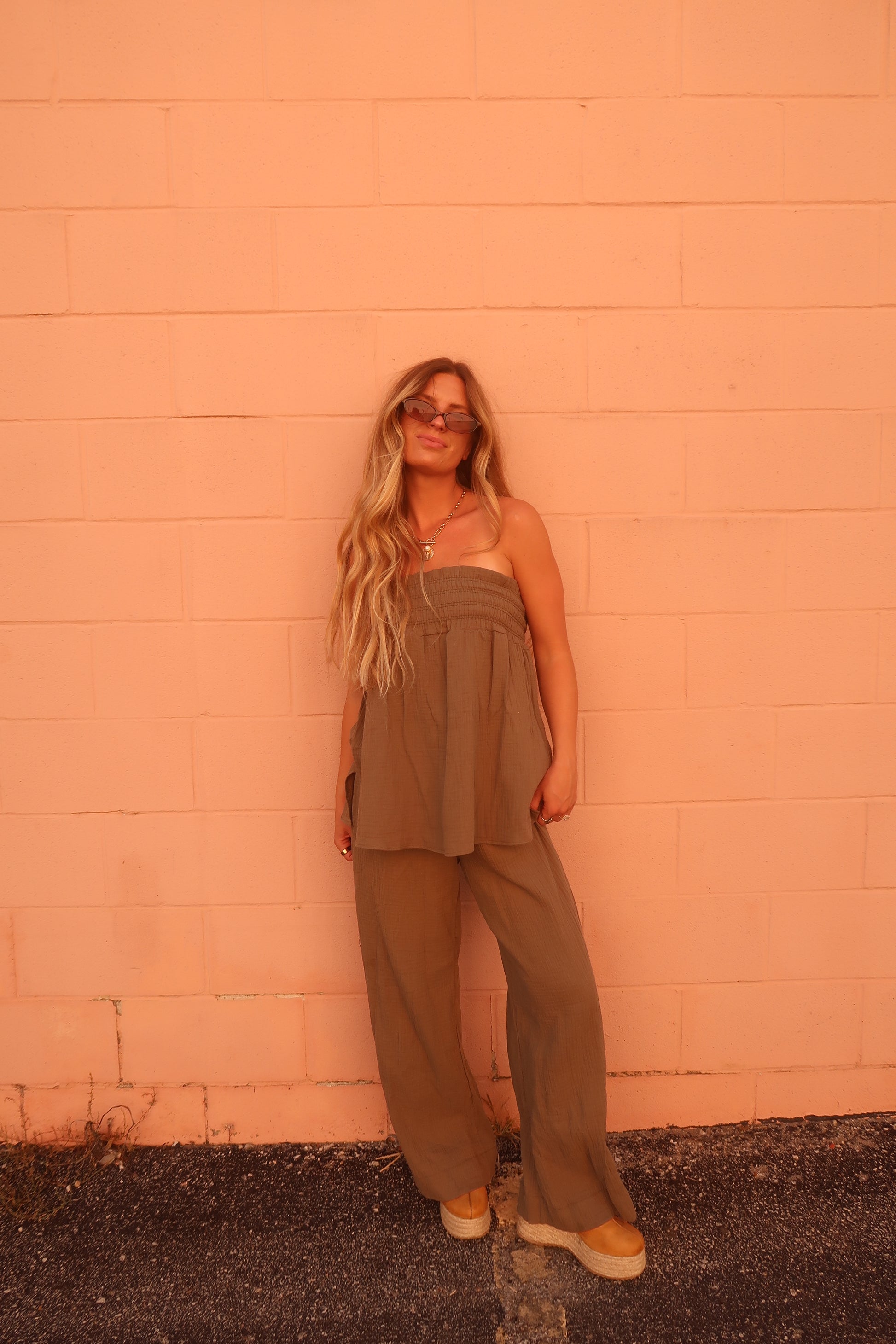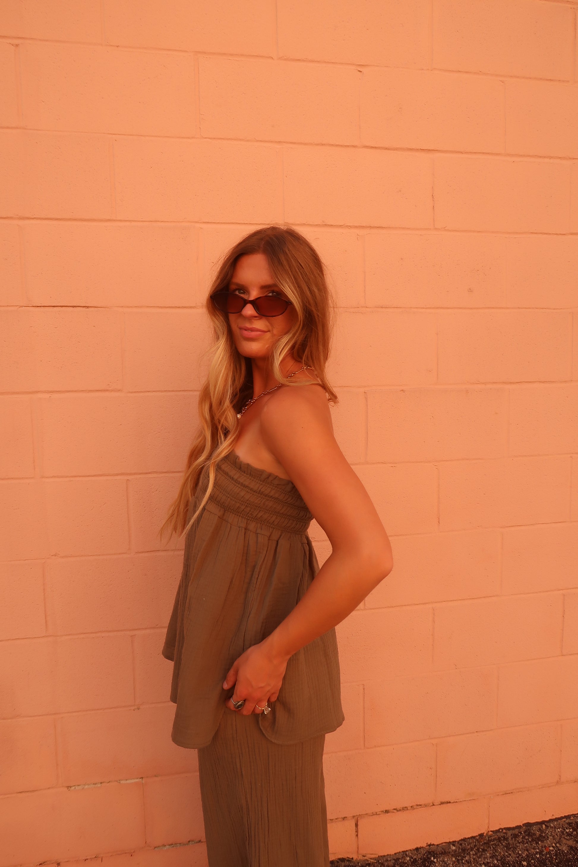 Get ready to look and feel effortlessly cool in our boho & fall Set! This two-piece duo in dreamy olive green cotton gauze features a strapless elastic band top and matching straight leg pants with pockets. Perfect for summer days, this flowy and easy outfit will have you feeling breezy.