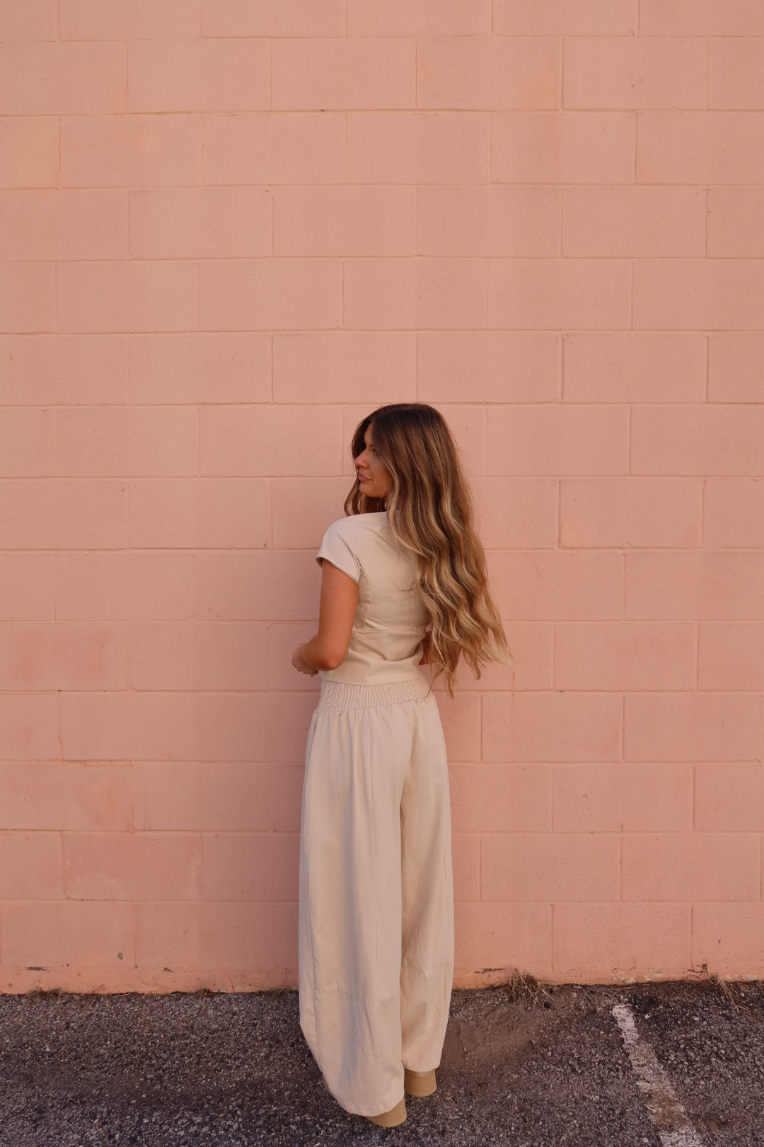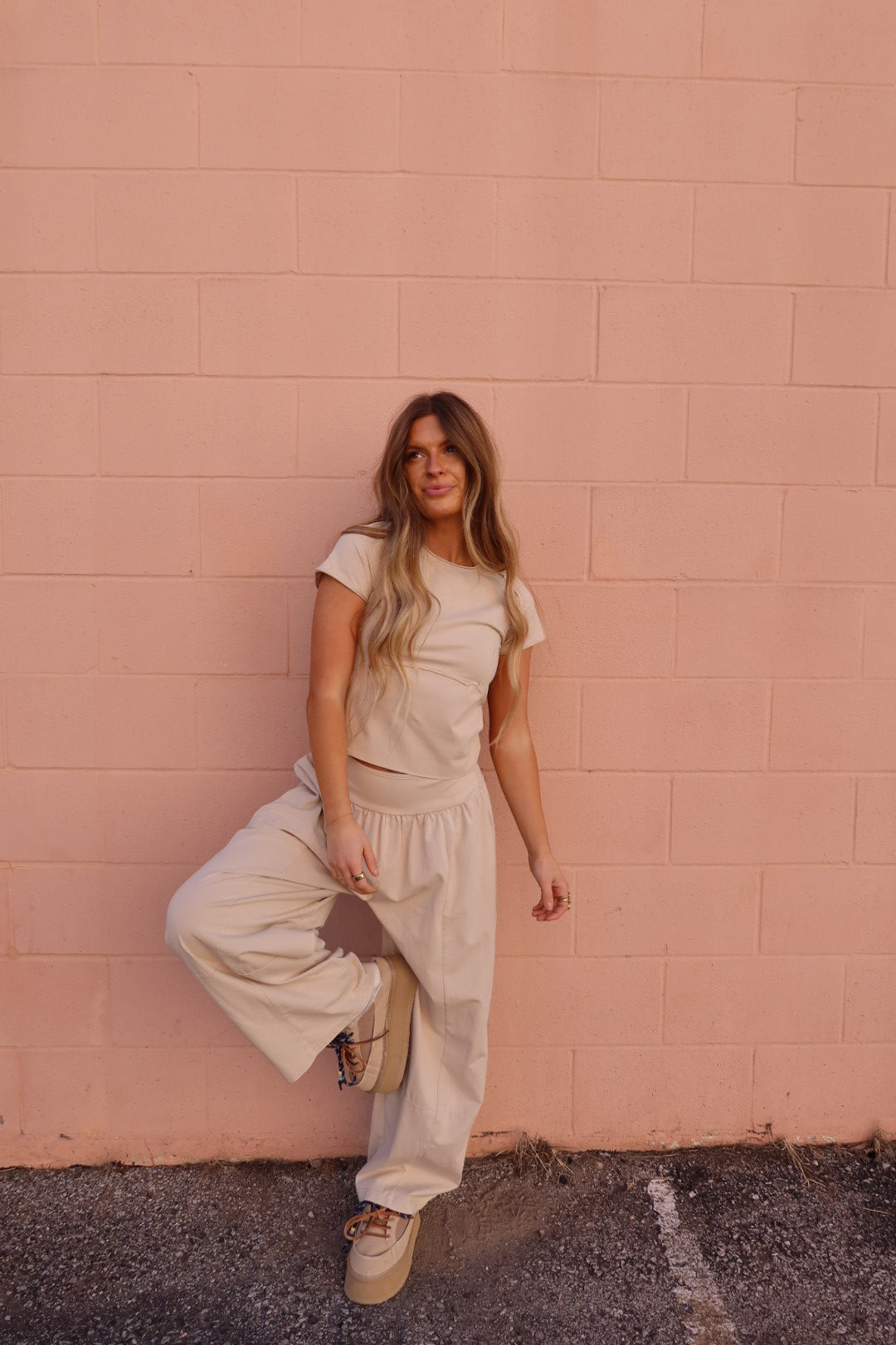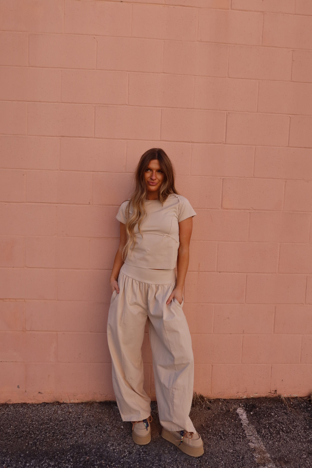 Elevate your casual style with our cream On the go Set! These mineral-washed red barrel leg pants feature solid pockets and a comfy elastic waistband, paired perfectly with a flirty short-sleeve cropped top. The ultimate combo for looking put-together while feeling oh-so-relaxed – whether you're dashing through airports or lounging at home!