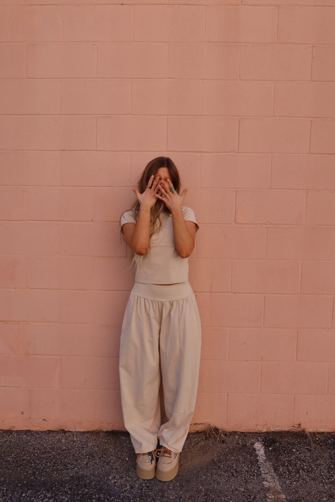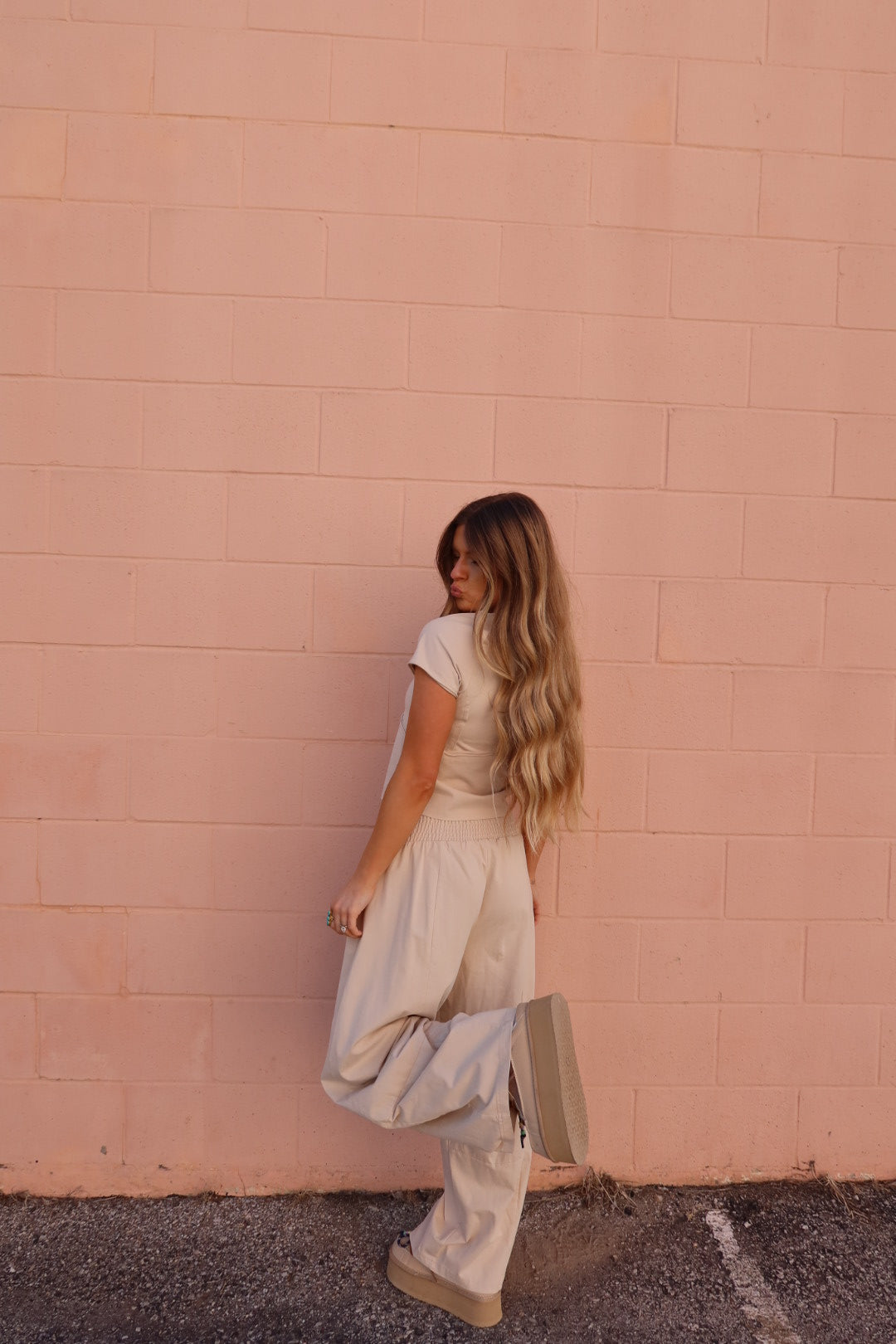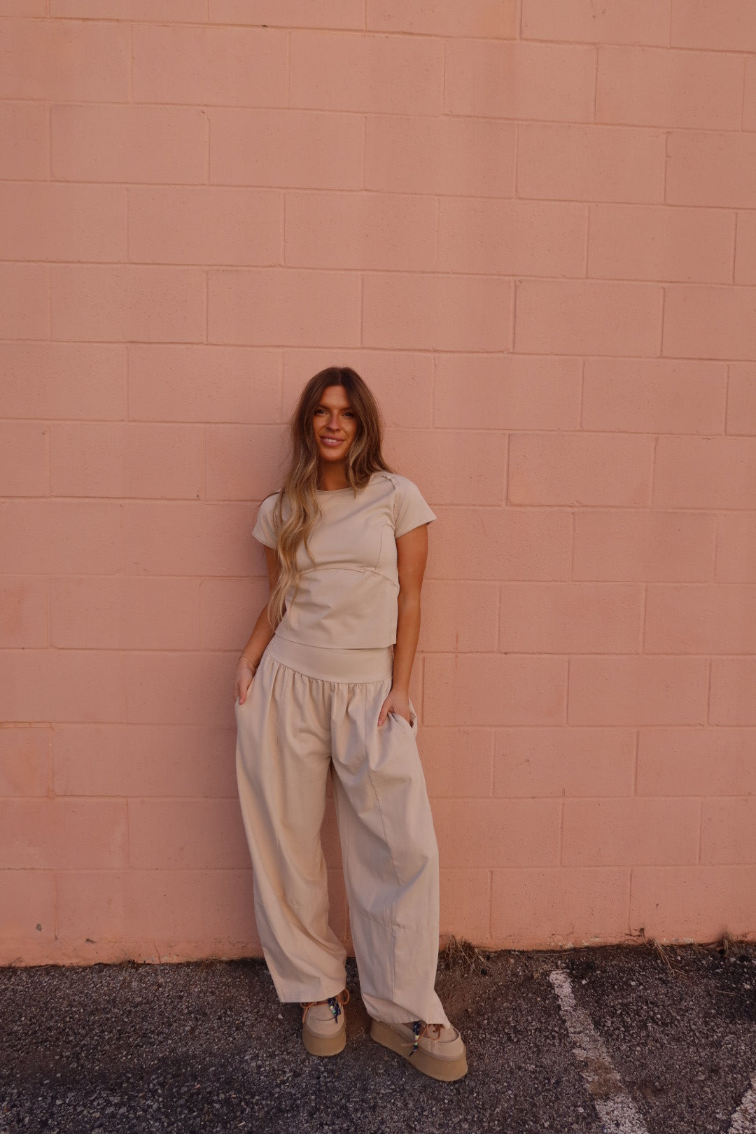 Elevate your casual style with our cream On the go Set! These mineral-washed red barrel leg pants feature solid pockets and a comfy elastic waistband, paired perfectly with a flirty short-sleeve cropped top. The ultimate combo for looking put-together while feeling oh-so-relaxed – whether you're dashing through airports or lounging at home!