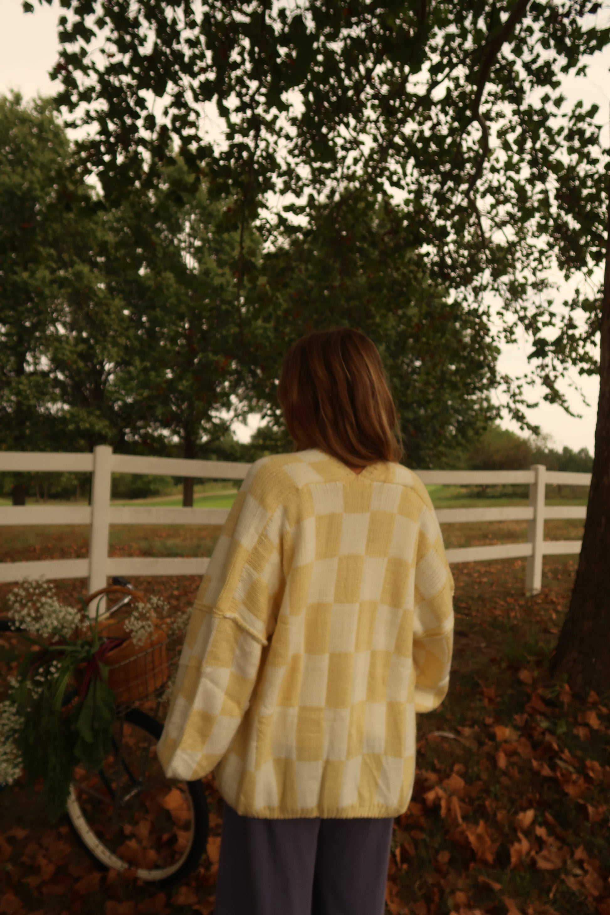 Get ready to cozy up in style with our butter yellow Check Cardigan! This oversized, slouchy cardigan features a charming light yellow and cream checker print, perfect for adding some playful pattern to your wardrobe. Embrace the cozy vibes and stay warm and stylish all winter long.