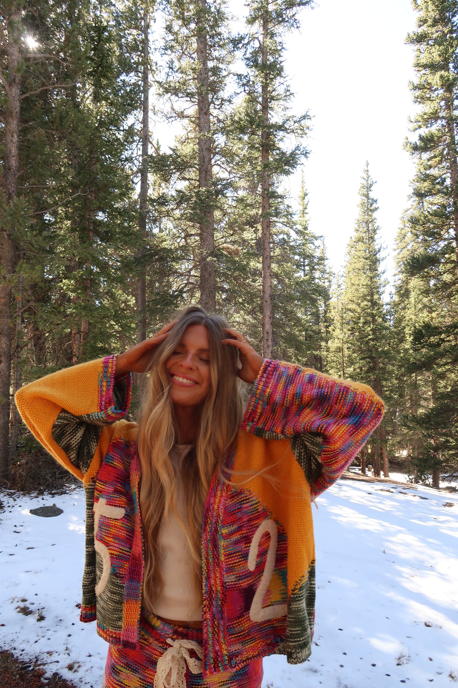 Wrap yourself in cosmic vibes with this one-of-a-kind cardigan featuring a mesmerizing multi-color space dye design. The back showcases an embroidered "peaceful day" message to remind you to slow down, while a bold "52" adorns the front for that quirky, conversation-starting edge. Perfect for anyone who loves funky fashion with a laid-back attitude, this piece brings playful personality to your everyday wardrobe. Cozy, colorful, and unapologetically fun.