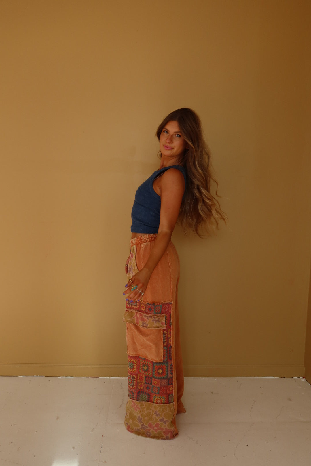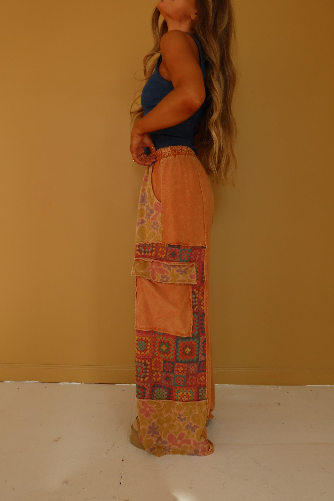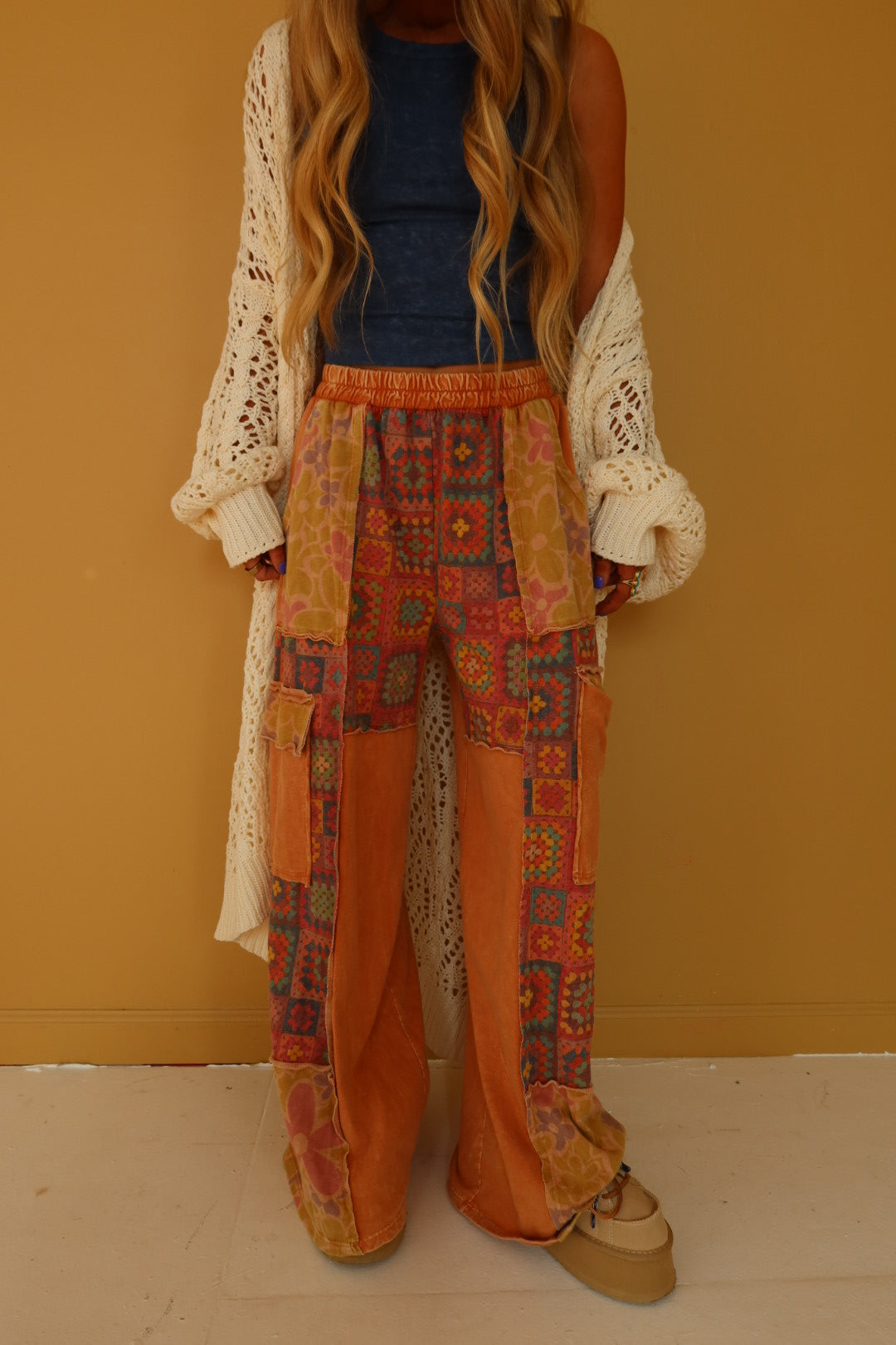 Embrace your inner free spirit in these Caught a Vibe Pants—a playful take on comfort wear. Featuring a vibrant mineral wash orange base paired with a groovy multi-color granny square print, these wide-leg beauties deliver major retro-cool energy. The elastic waist keeps things relaxed and easy, perfect for those days when you want to look effortlessly fun without sacrificing comfort. Whether you're channeling '70s nostalgia or just vibing with bold, eclectic style, these pants are your new go-to for turning heads and spreading good energy.