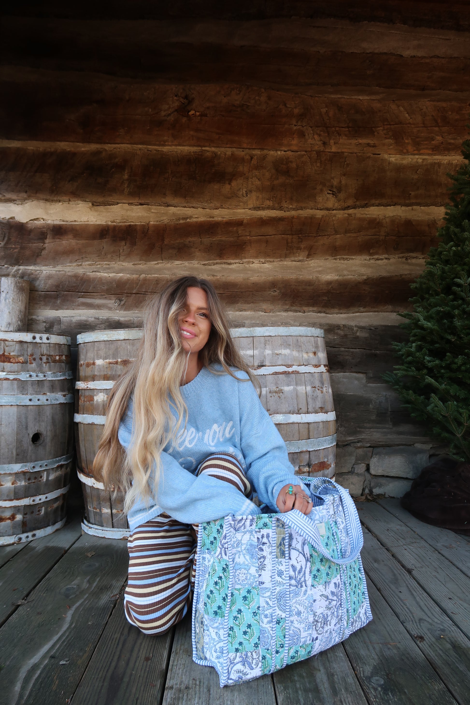 Our Cove Quilted Tote Bag light blue, teal and sage green multi color patchwork print with a beautiful teal stripe contrast inside. Each bag is handmade in India and no two are the same! Each piece of the Quilted Club are designed by and for MJ. All of our quilted bags are lightweight but structured. The tote bag has a pocket on the inside.