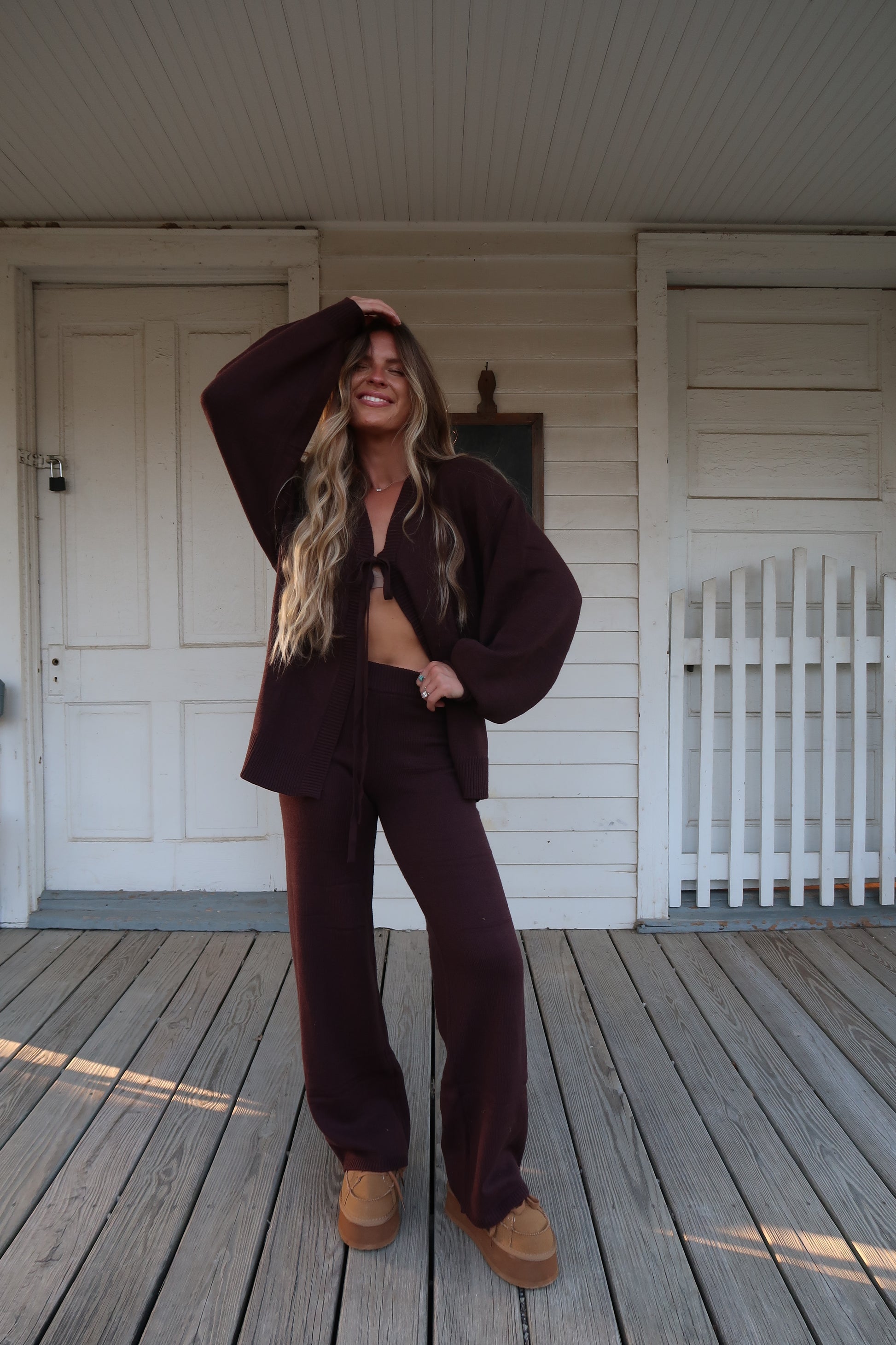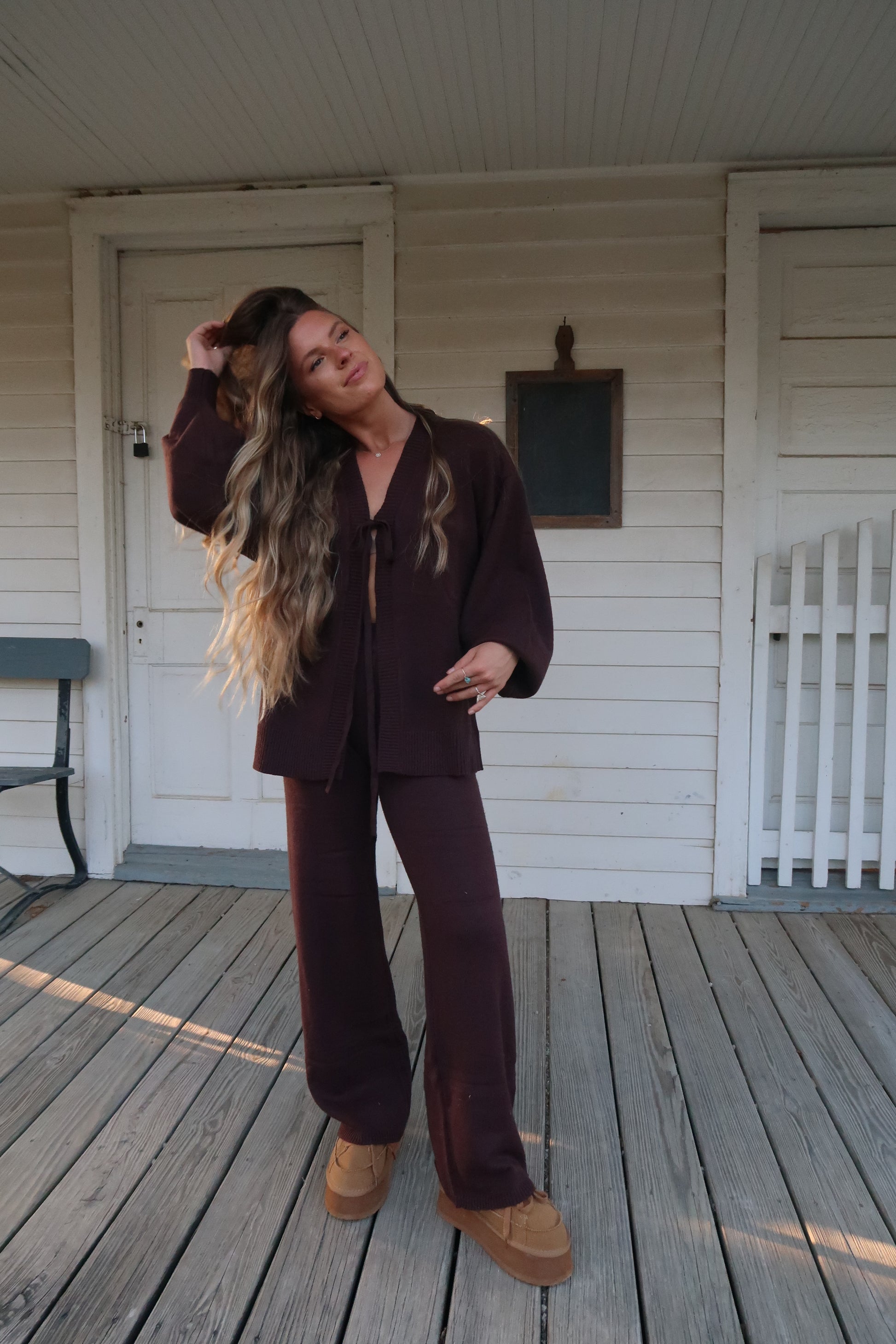 Get ready to cozy up in style with our Cozy Brown Sweater Set! This set includes a dark brown, tie front sweater top paired with long pants and long sleeves for the ultimate comfort. Plus, with the option to mix and match, you'll have endless transitional outfit possibilities. Stay extra cozy this season with our sweater set!
