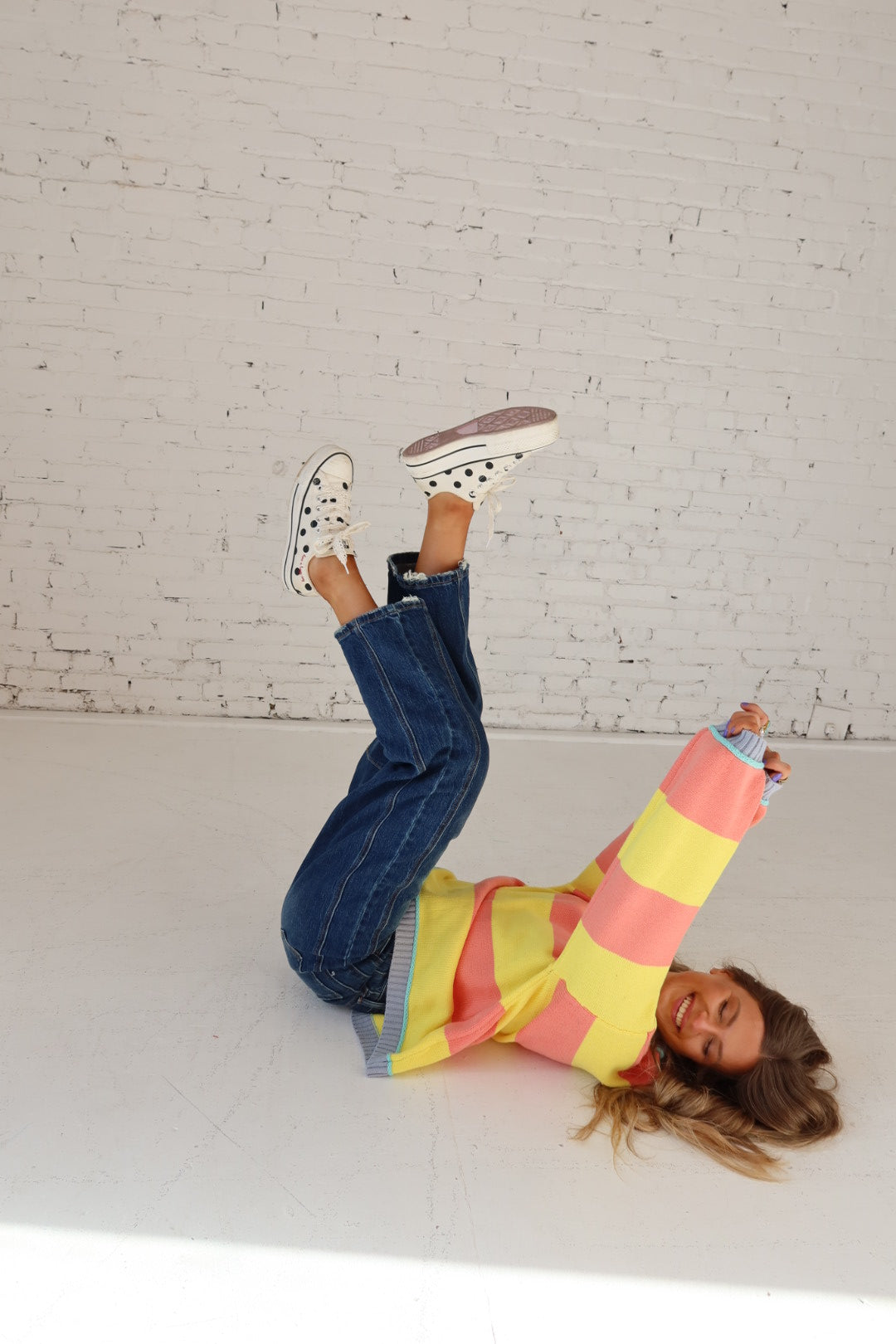 Wrap yourself in pure joy with the Daydream Stripe Sweater—an oversized knit that celebrates color in the most delightful way. Featuring a dreamy blend of peachy tones, sunny yellows, cool teals, and soft lavender stripes, this feel-good piece brings instant happiness to your everyday rotation. The relaxed, roomy fit makes it perfect for cozy days, lazy weekends, or whenever you need a mood boost. Unexpected, unapologetically cheerful, and impossibly comfortable—this sweater is your new favorite excuse to smile.