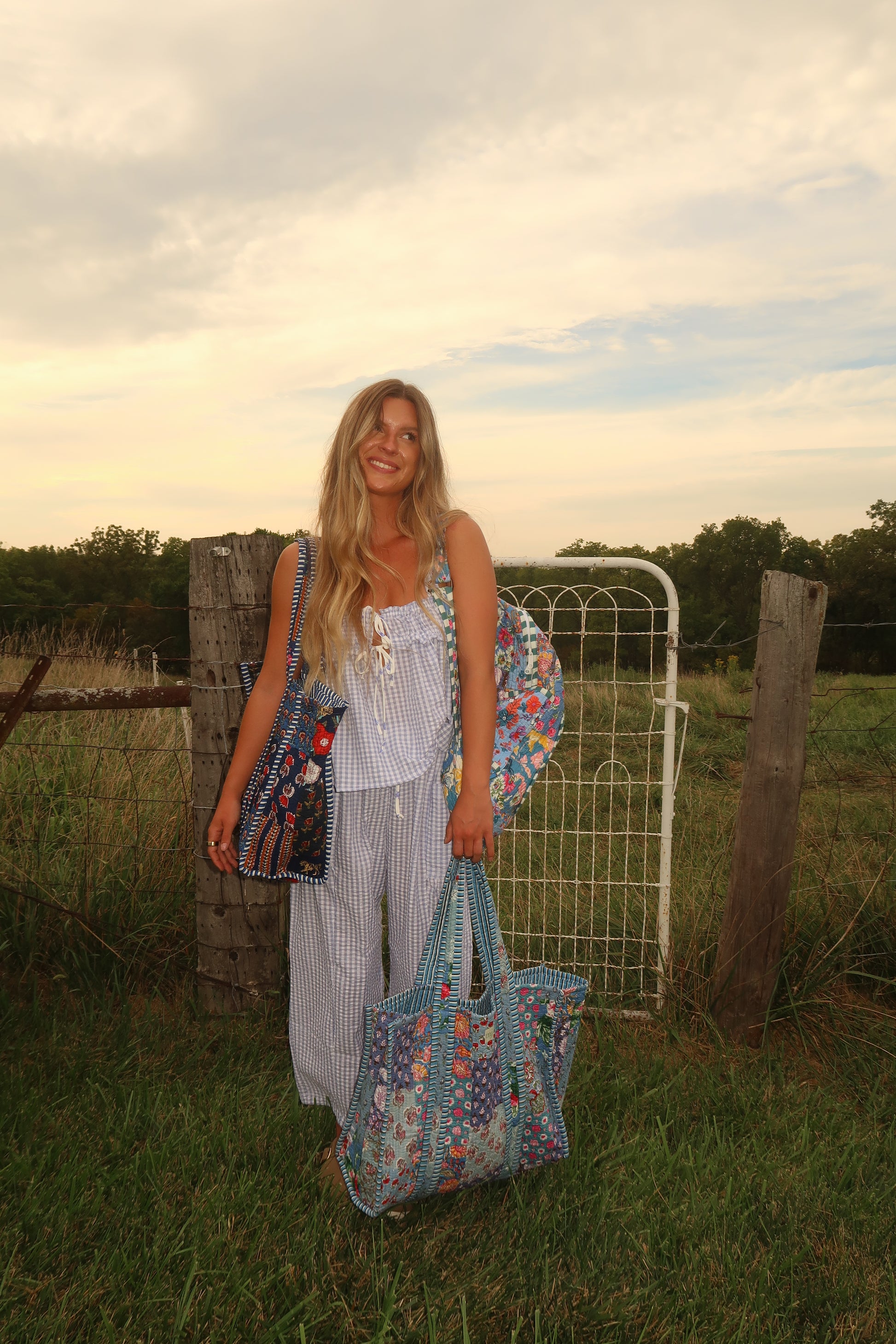Our Loretta Quilted Tote Bag is a unique blue patchwork with a beautiful contrast inside. Each bag is handmade in India and no two are the same! Each piece of the Quilted Club are designed by and for MJ. All of our quilted bags are lightweight but structured. The tote bag has a pocket on the inside.