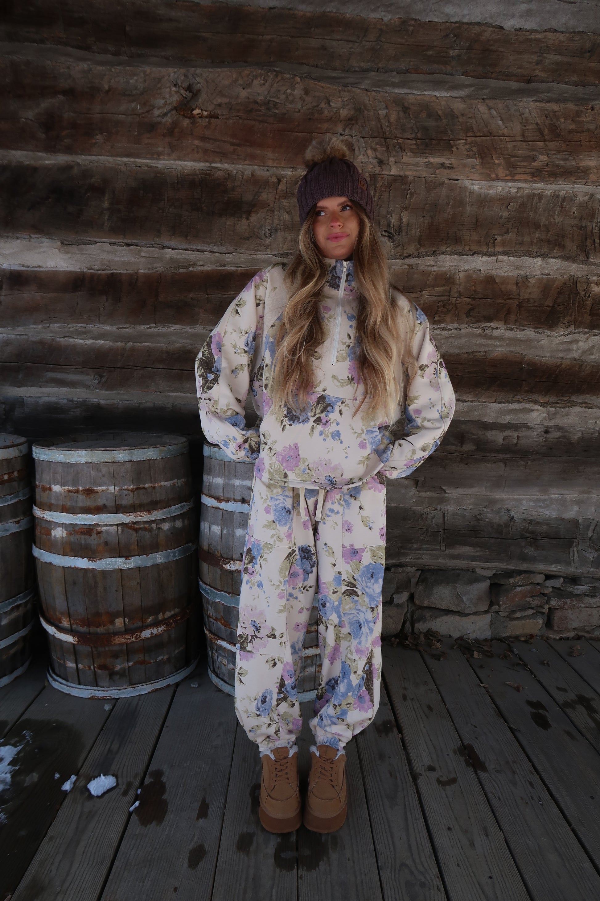 Cozy up in effortless style with the Flora Sweat Set—a dreamy cream and floral print ensemble that's basically a hug you can wear. This three-piece set features a soft terri knit sweatshirt with a quarter-zip for easy layering, matching joggers with a comfy elastic waist, and all the comfort vibes you need for lounging or running errands. Perfect for those days when you want to look put-together without trying too hard.