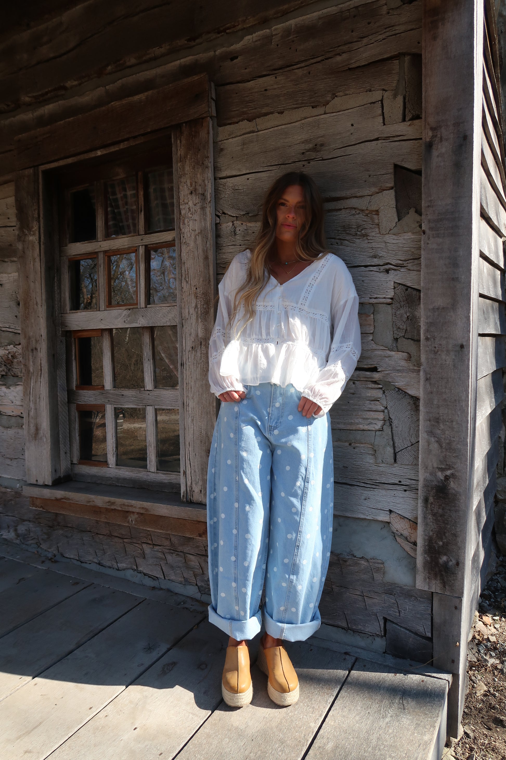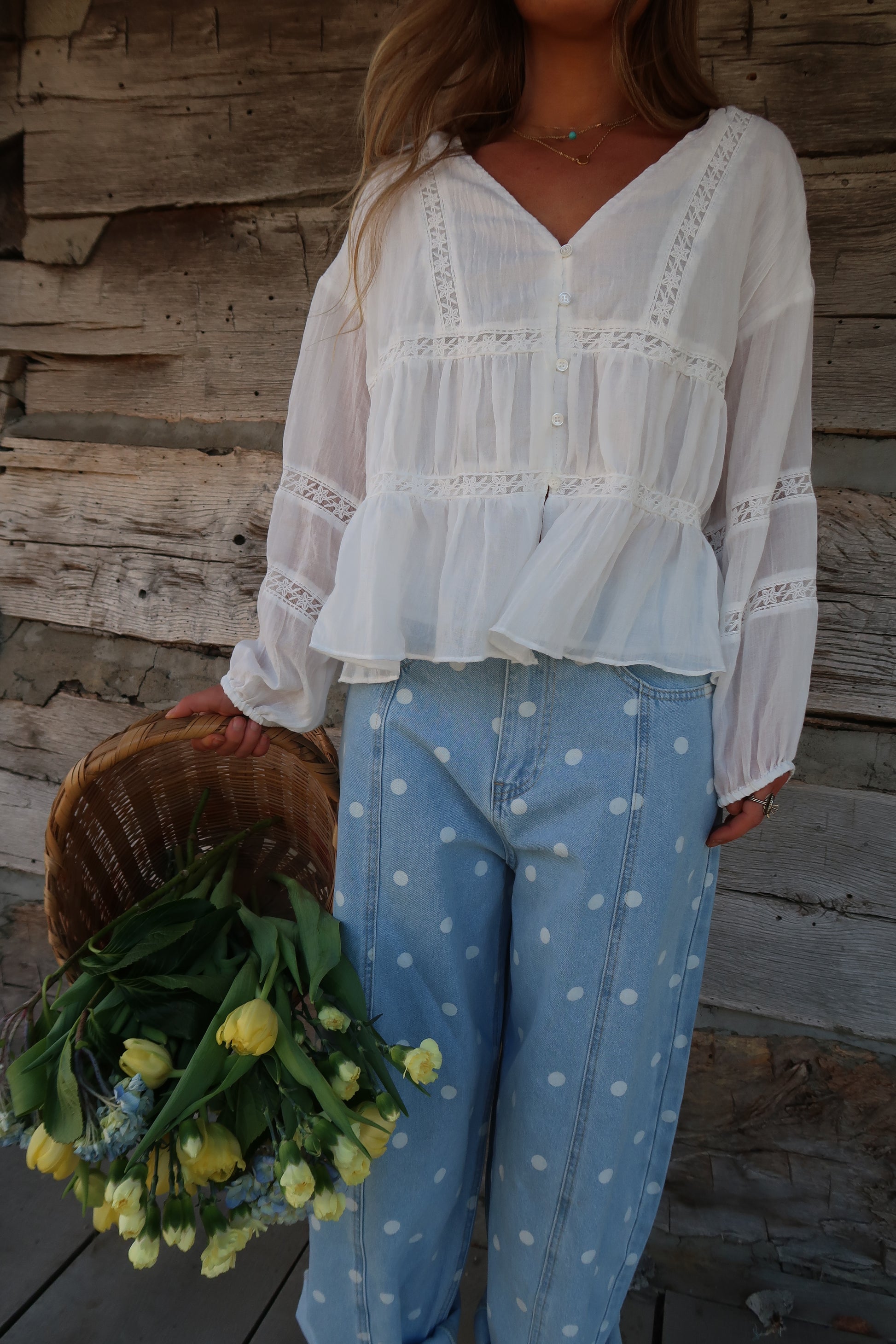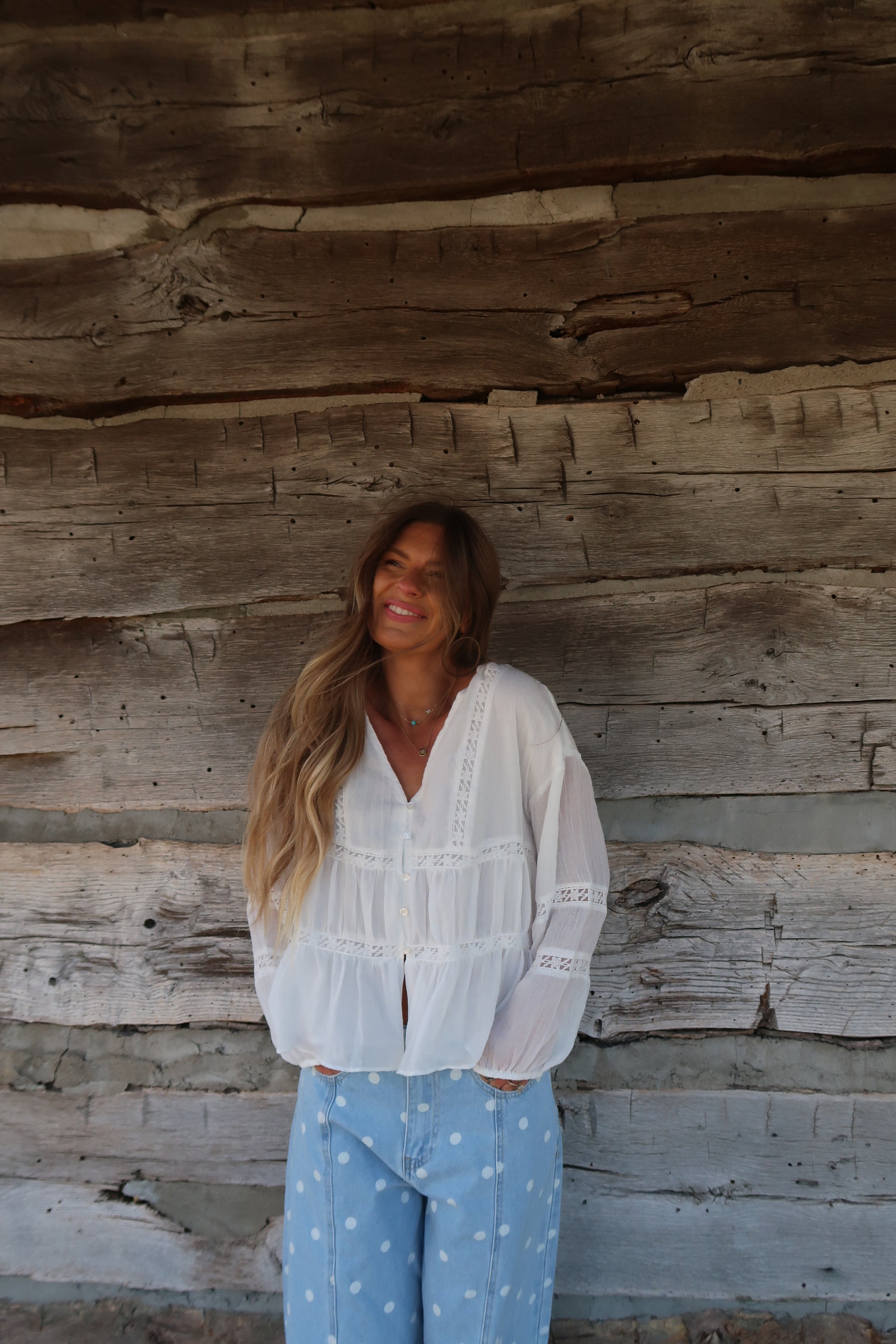 The Franny Top combines timeless elegance with modern charm. This babydoll-style top features a flattering v-neck and convenient button-front closure for easy styling. Delicate lace details and crisp white fabric create a romantic, feminine look perfect for layering or wearing solo. Whether you're dressing up for a night out or keeping it casual, this versatile piece adds effortless sophistication to any wardrobe.
