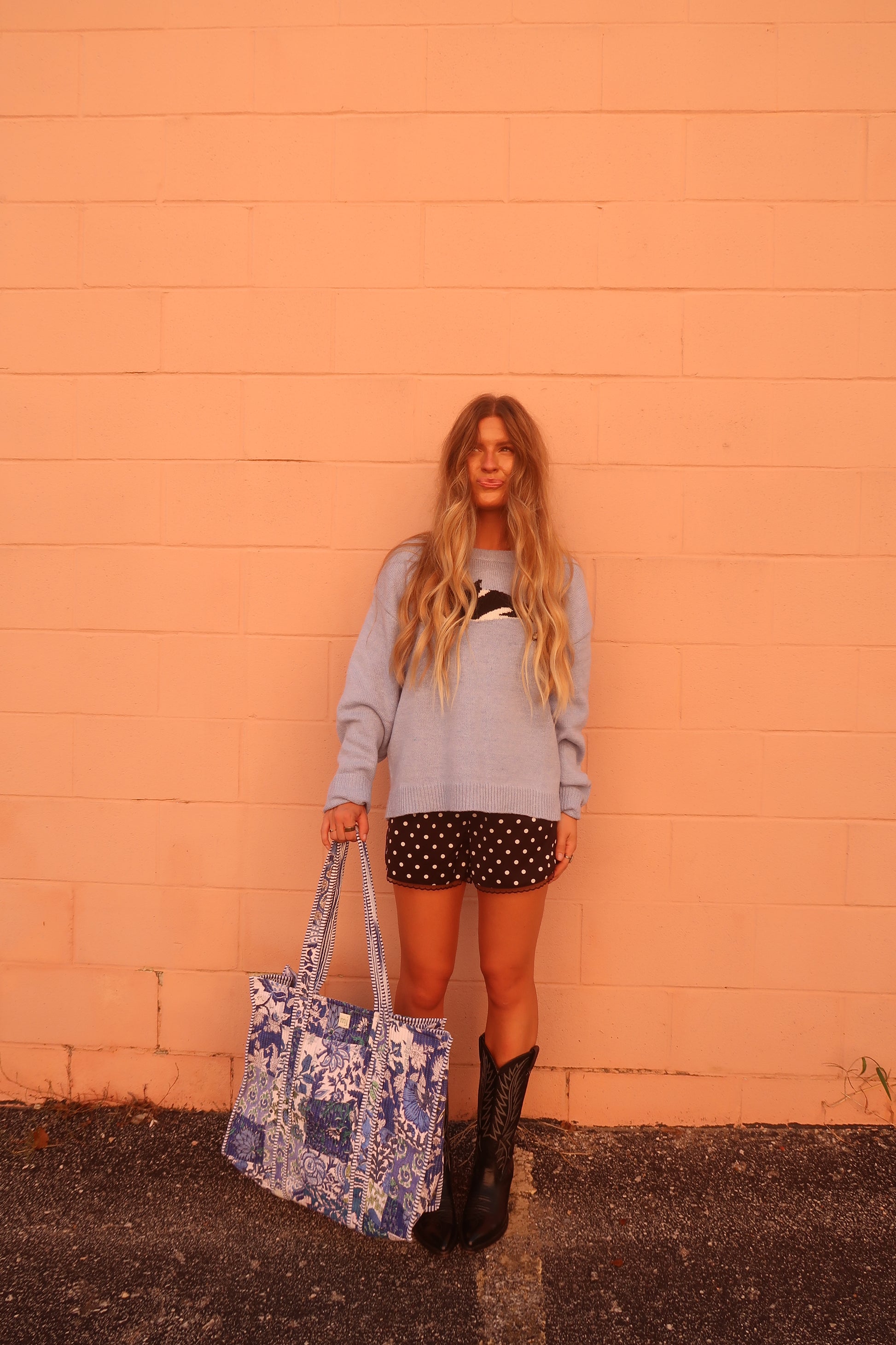 Stay cozy and playful in the Free Willy Sweater. This light blue knit features a cheeky black and white whale on the front, adding a fun splash of personality to your look. Its slightly oversized fit makes it perfect for relaxed days and effortless comfort. Dive into warmth and style with this charming, ocean-inspired knit.