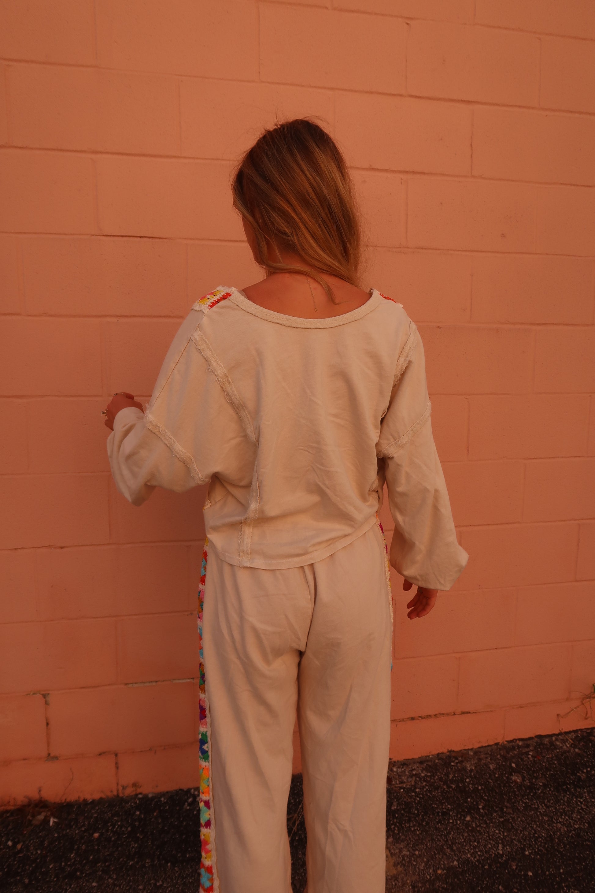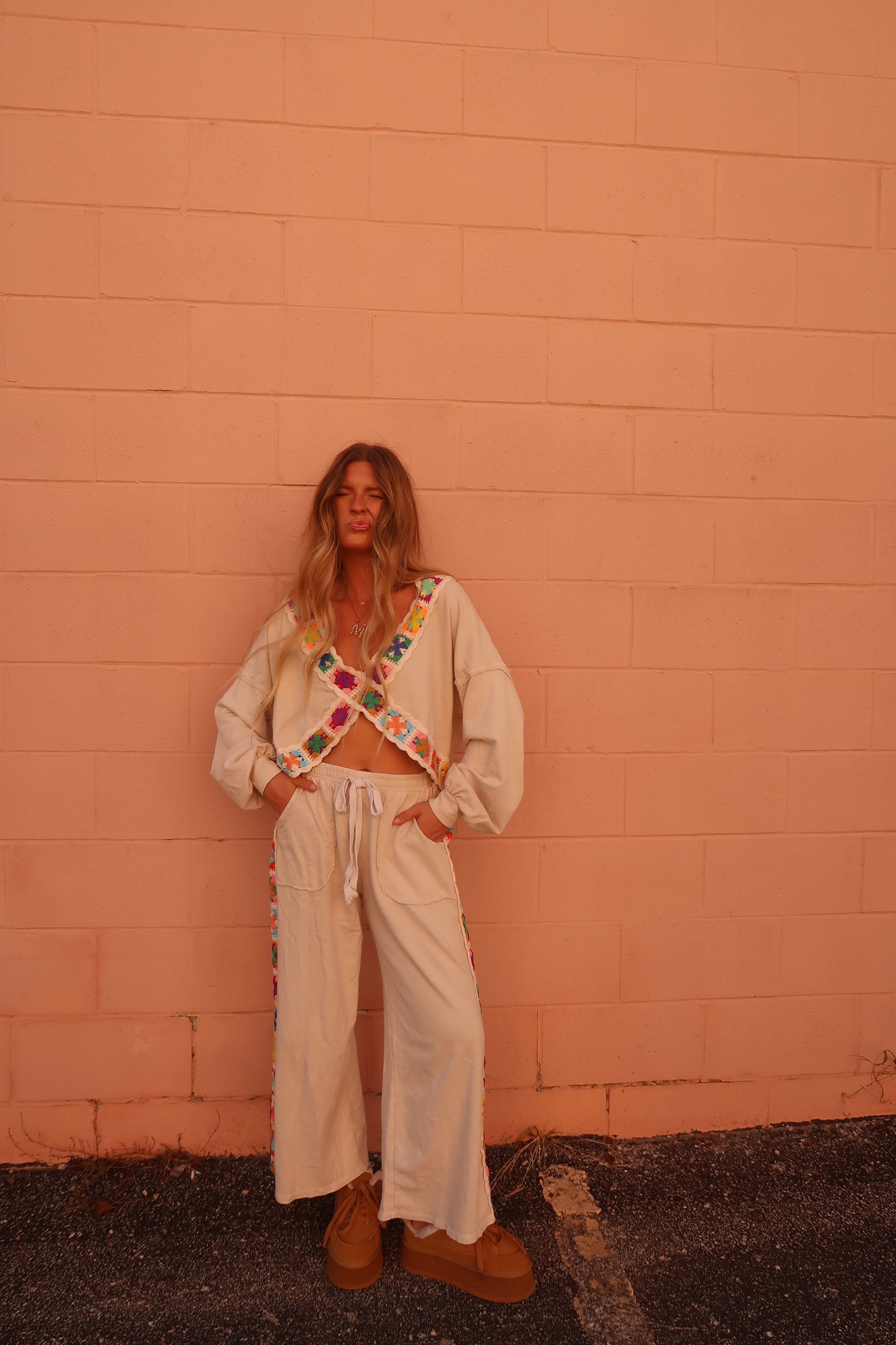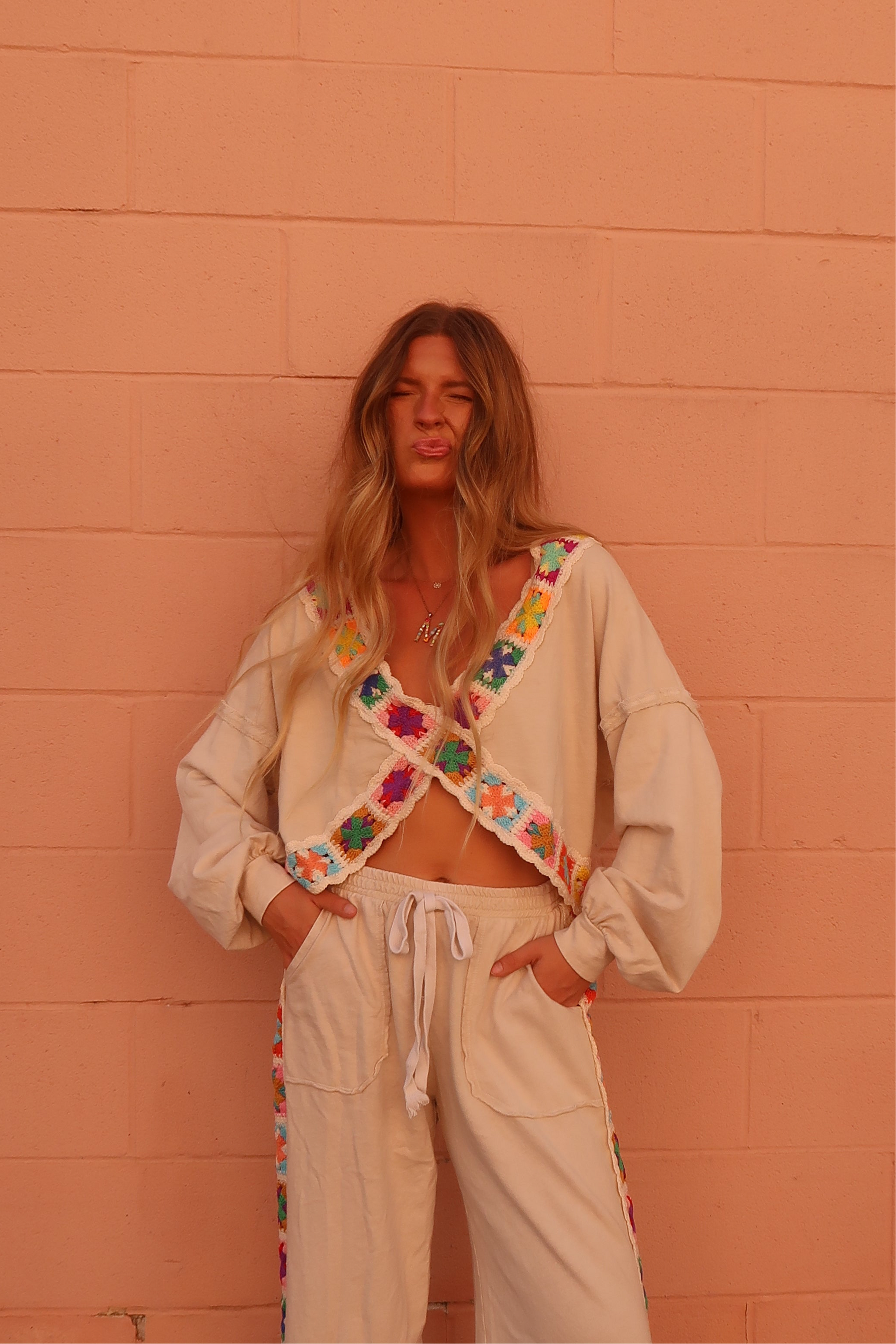 Step into comfort and fun with the Happy Stitch Crossover top. Featuring a cream base and vibrant multi-color granny square accents. this top blends cozy style with a playful pop of color. perfect for lounging or lively outings. Add a joyful twist to your wardrobe with these uniquely charming pants!