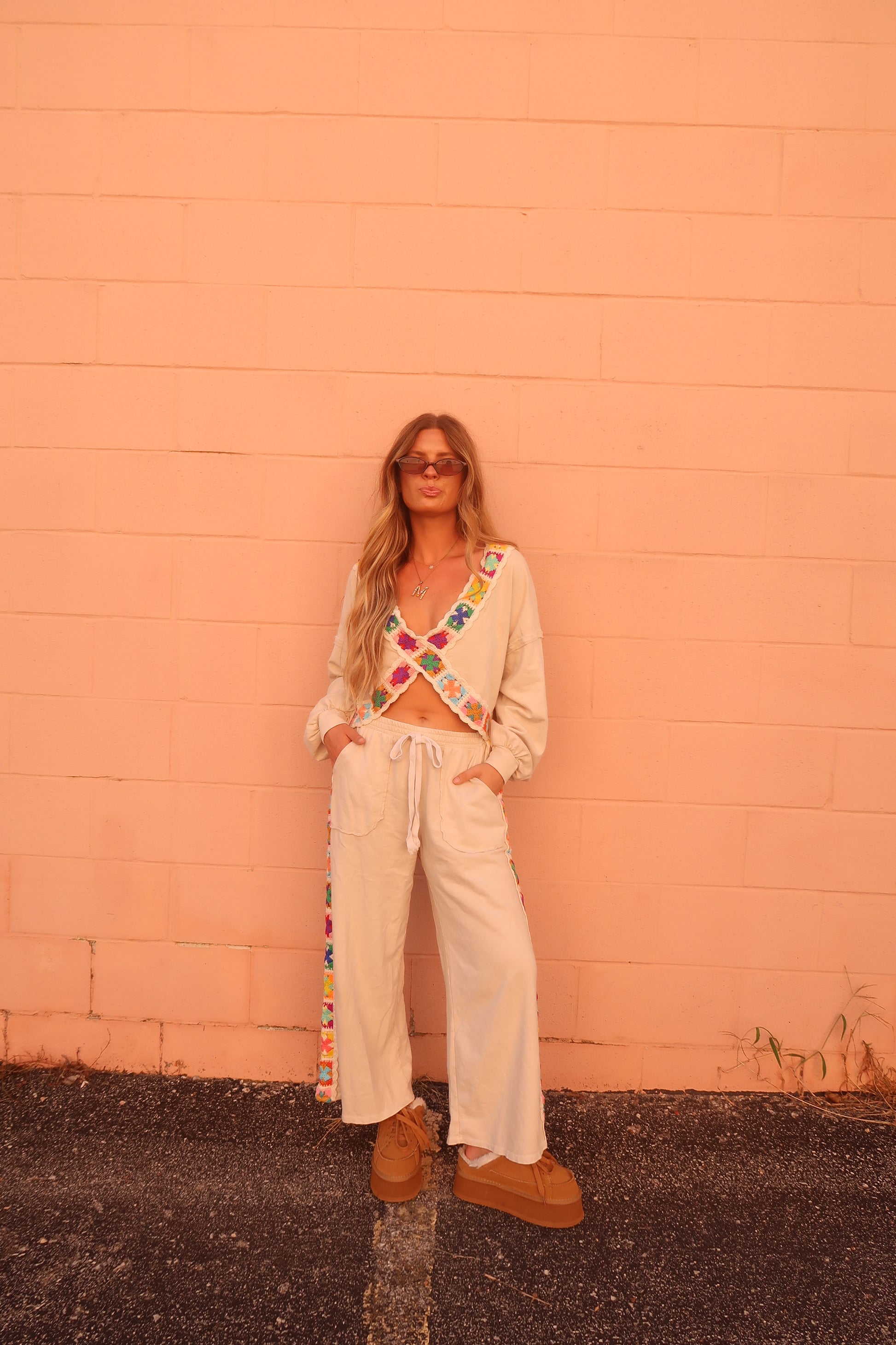 Step into comfort and fun with the Happy Stitch Wide Leg Pants. Featuring a cream base and vibrant multi-color granny square accents down the sides, these pants blend cozy style with a playful pop of color. The elastic waist ensures an easy, breezy fit, perfect for lounging or lively outings. Add a joyful twist to your wardrobe with these uniquely charming pants!