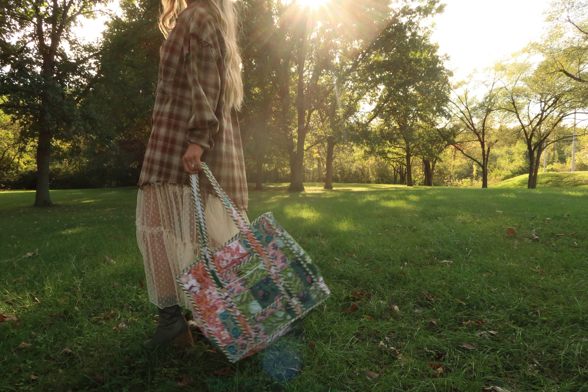 Our Hattie Quilted Dote Bag is a unique green, peachy and pink patchwork with a beautiful green and white stripe inside. Our dote bag is our newest style with the style of a tote bag and the functionality of a duffle. Each bag is handmade in India and no two are the same! Each piece of the Quilted Club are designed by and for MJ. All of our quilted bags are lightweight but structured. The tote bag has a pocket on the inside.