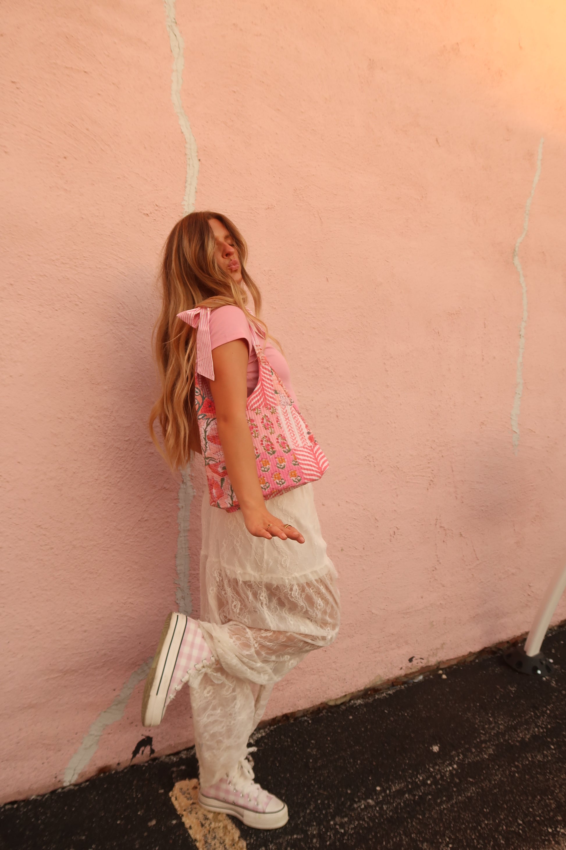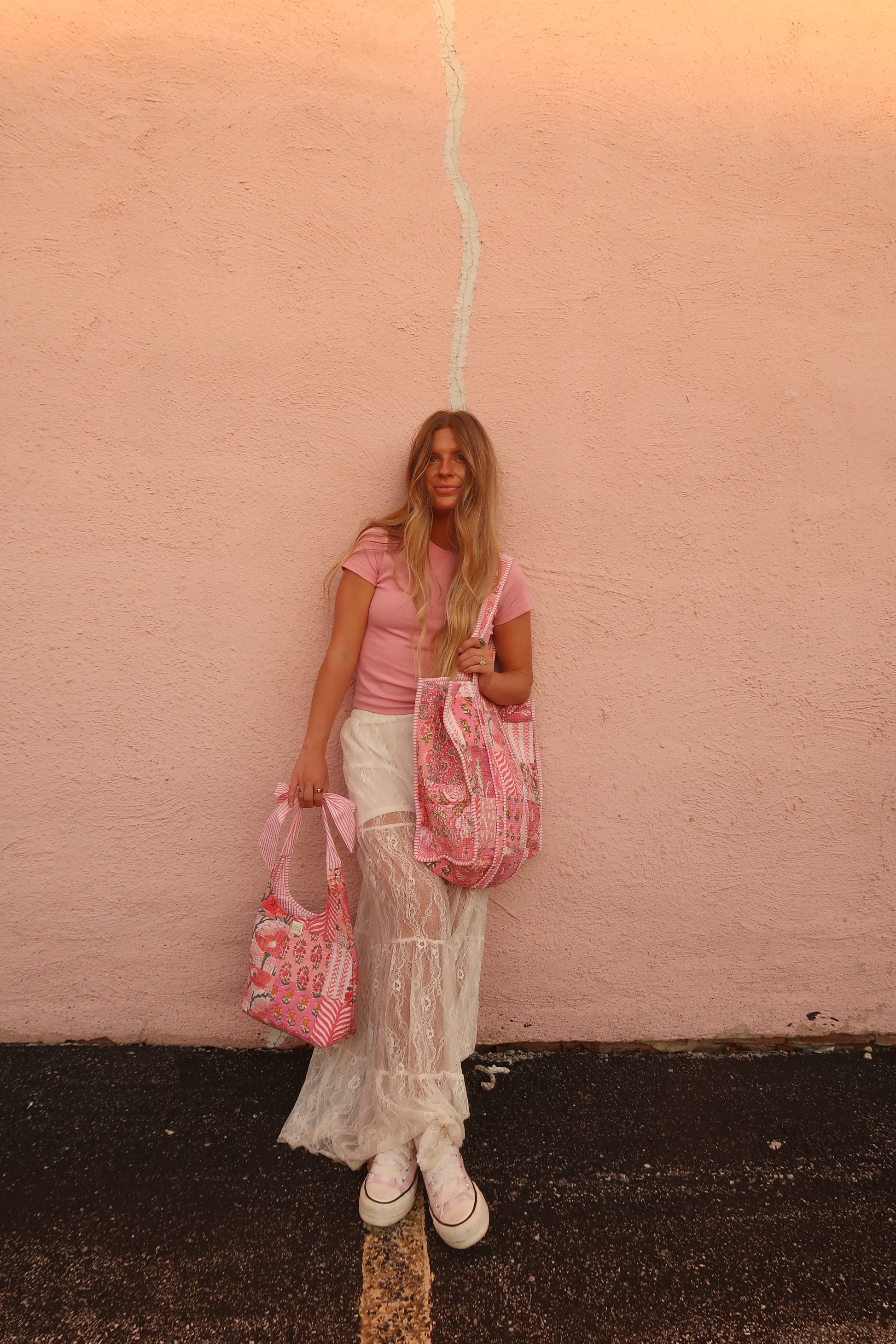 Our iris Quilted Bow Purse pinky floral patchwork print with a beautiful pink stripe contrast inside. Each bag is handmade in India and no two are the same! Each piece of the Quilted Club are designed by and for MJ. All of our quilted bags are lightweight but structured. The tote bag has a pocket on the inside.
