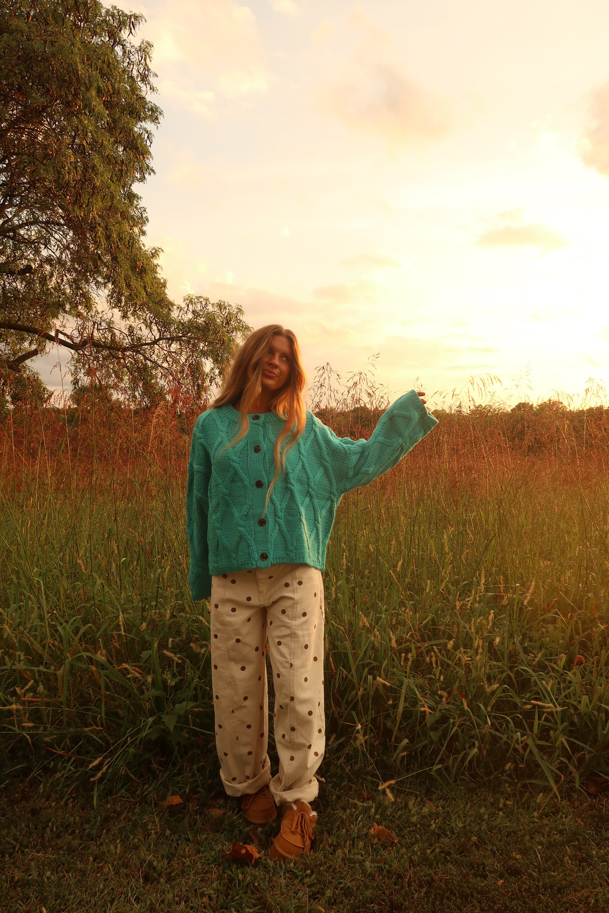 "Ready to make a statement? Look no further than our Latte dot barrel jeans, With delicate cream fabric and playful brown polka dots, these jeans will add a touch of whimsy to any outfit. Plus, the barrel leg fit ensure a comfortable and flattering fit for all body types. Get ready to turn heads with this oversized fashion statement!"