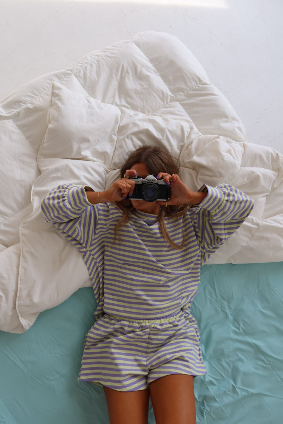 Slip into comfort with our Lavender Glow Set—a playful two-piece featuring an oversized long sleeve top in a dreamy lavender and bright green stripe. Pair it with matching elastic waist shorts for an effortlessly cool vibe. Perfect for lounging, running errands, or making a statement in your everyday rotation. Cozy meets style in this must-have set.