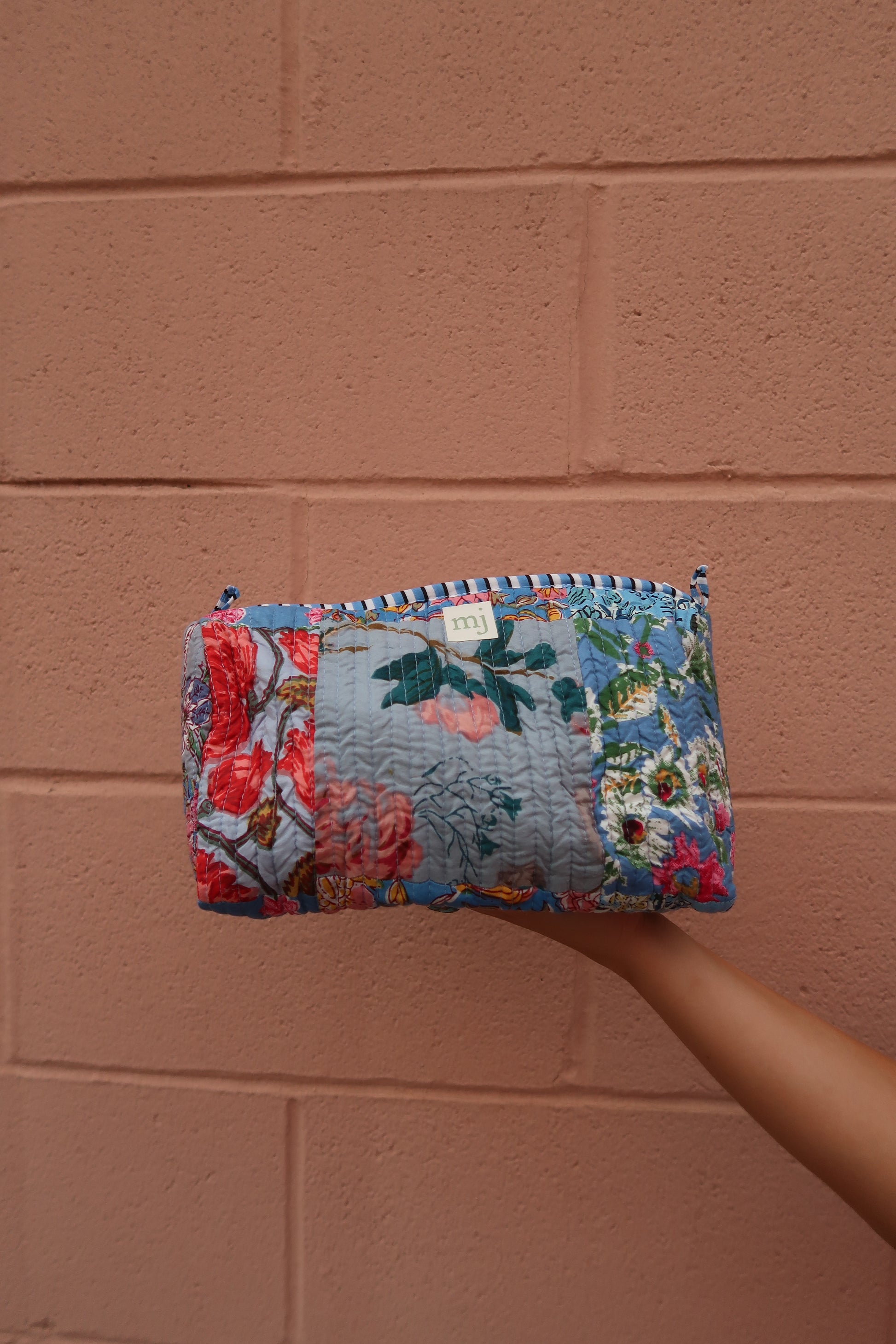 Introducing the must-have addition to our bestselling quilted clubs collection: our cosmetic bag! This catch all bag is perfect for organizing your beauty essentials. Mix and match with our other colorful bags or pair it with its coordinating bag for a matchy matchy look. Our best selling blue patchwork with a fun blue stripe lining, this one will be a fan fav for sure The plastic lining and pockets inside keep everything organized. Get ready to travel in style!