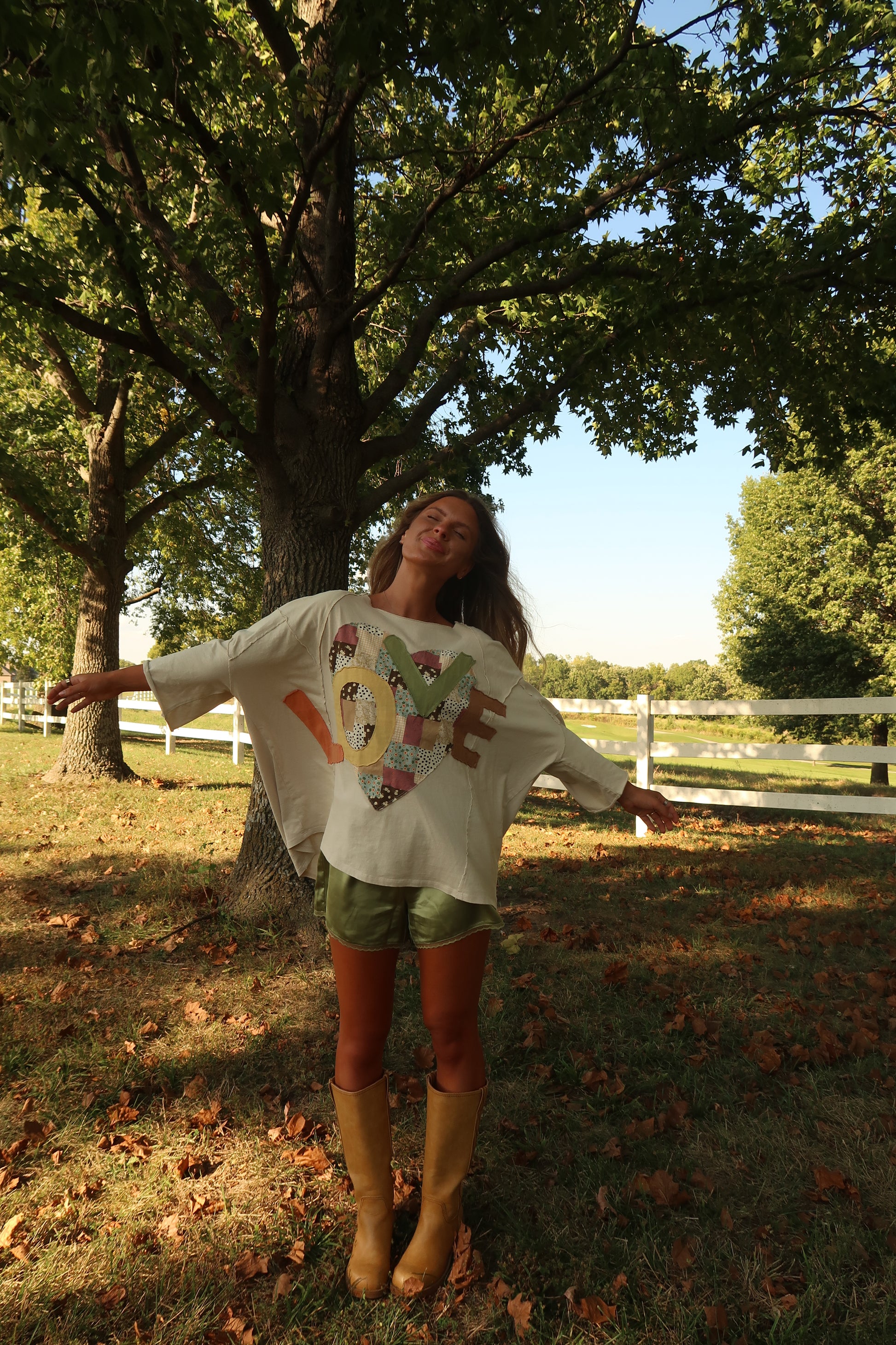 "Fall in love with our oversized cream top, complete with 3/4 length sleeves. Adorned with a playful patchwork heart and bold 'love' wording, it's the perfect way to show your affection for autumn. Embrace the season in style with this quirky piece. (Love at first sight? We think so!)"
