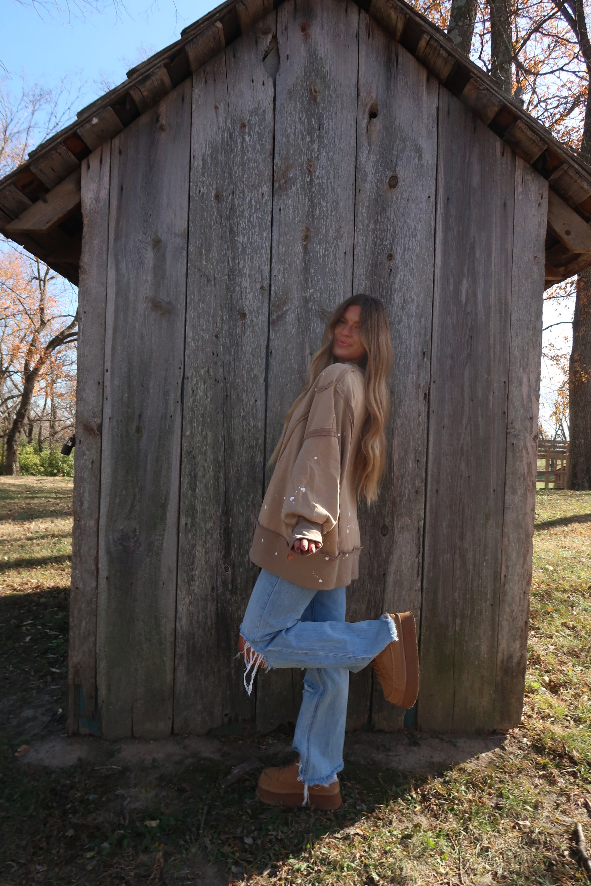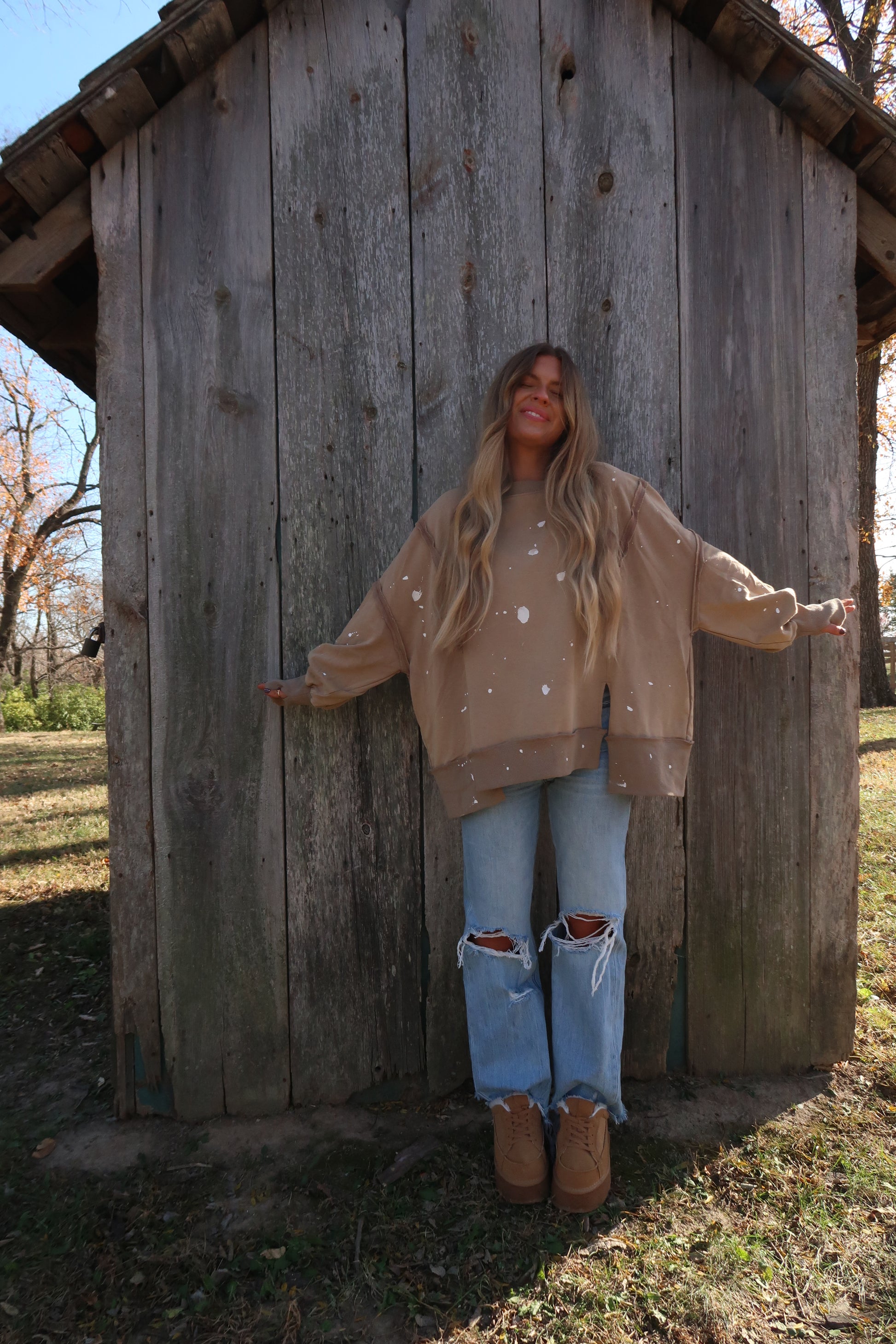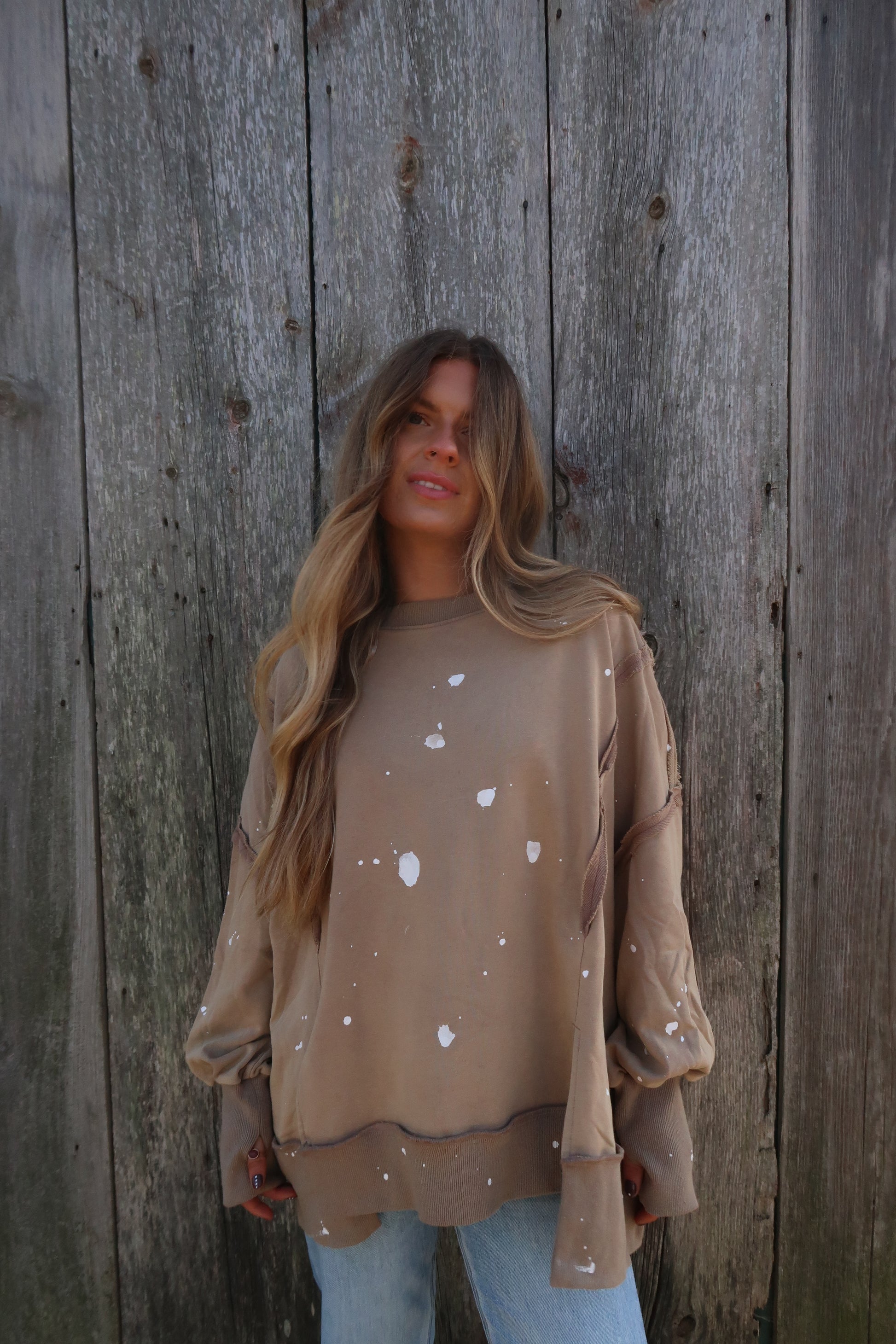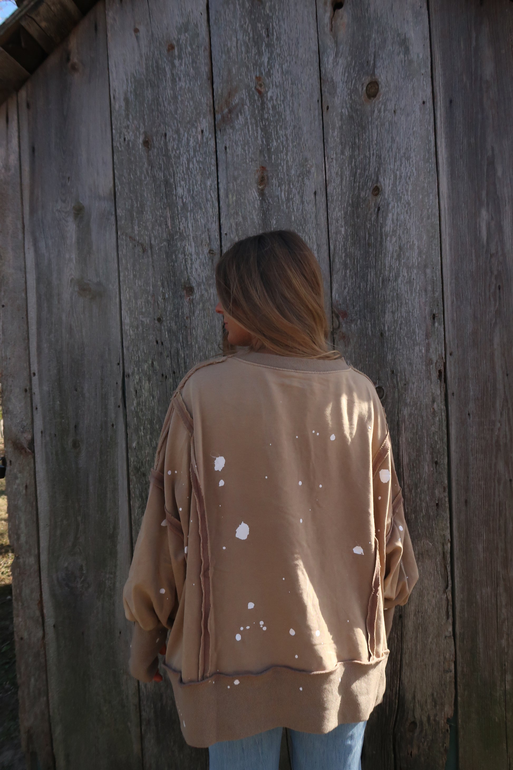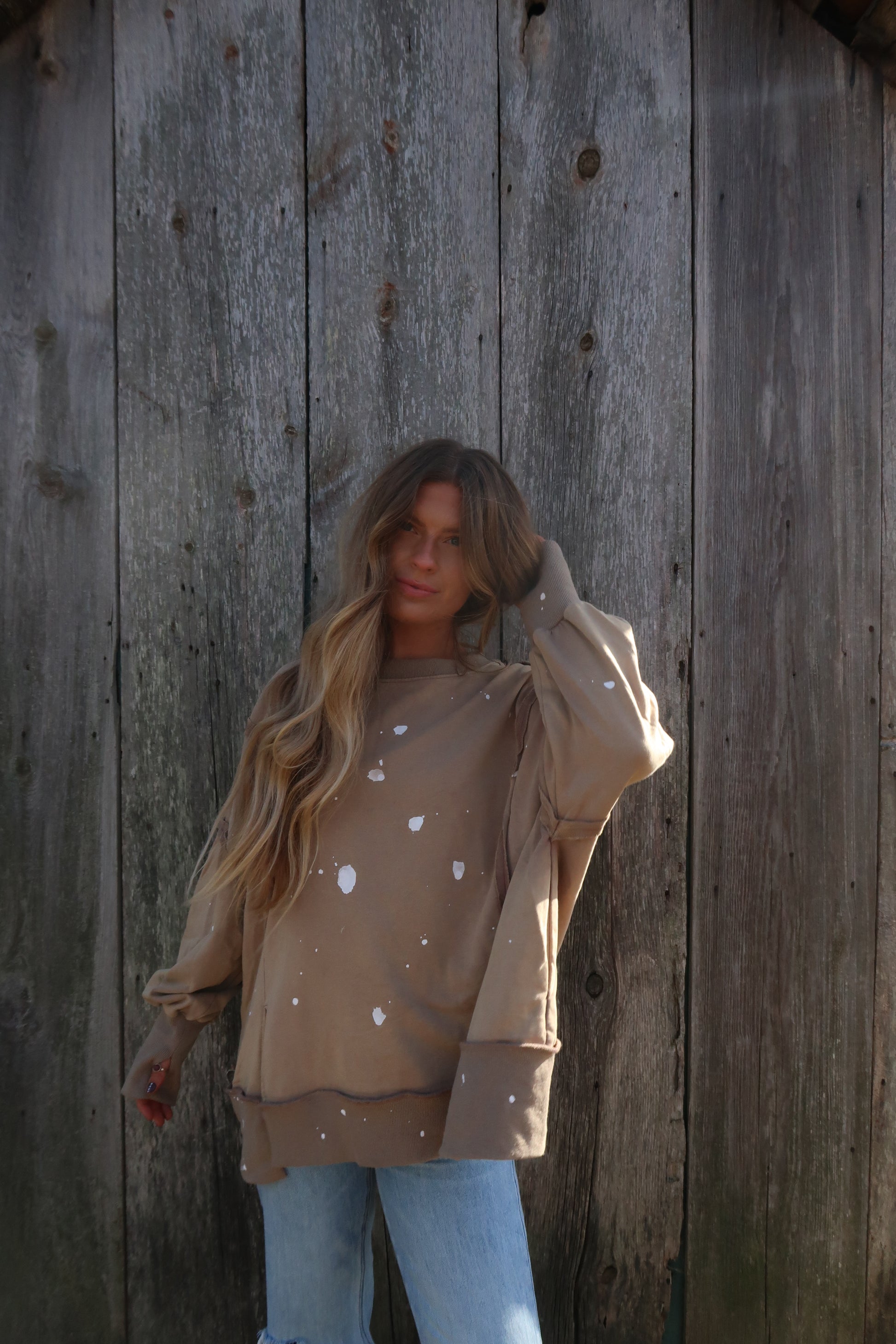 Make a statement with the Maple Splatter Crewneck—an oversized khaki canvas splattered with artistic flair. Designed for comfort and style, this cozy crewneck features practical thumb holes to keep your hands warm and your sleeves exactly where you want them. Perfect for those who love effortless, creative vibes. Throw it on over anything and instantly elevate your casual wardrobe with a touch of wearable art.