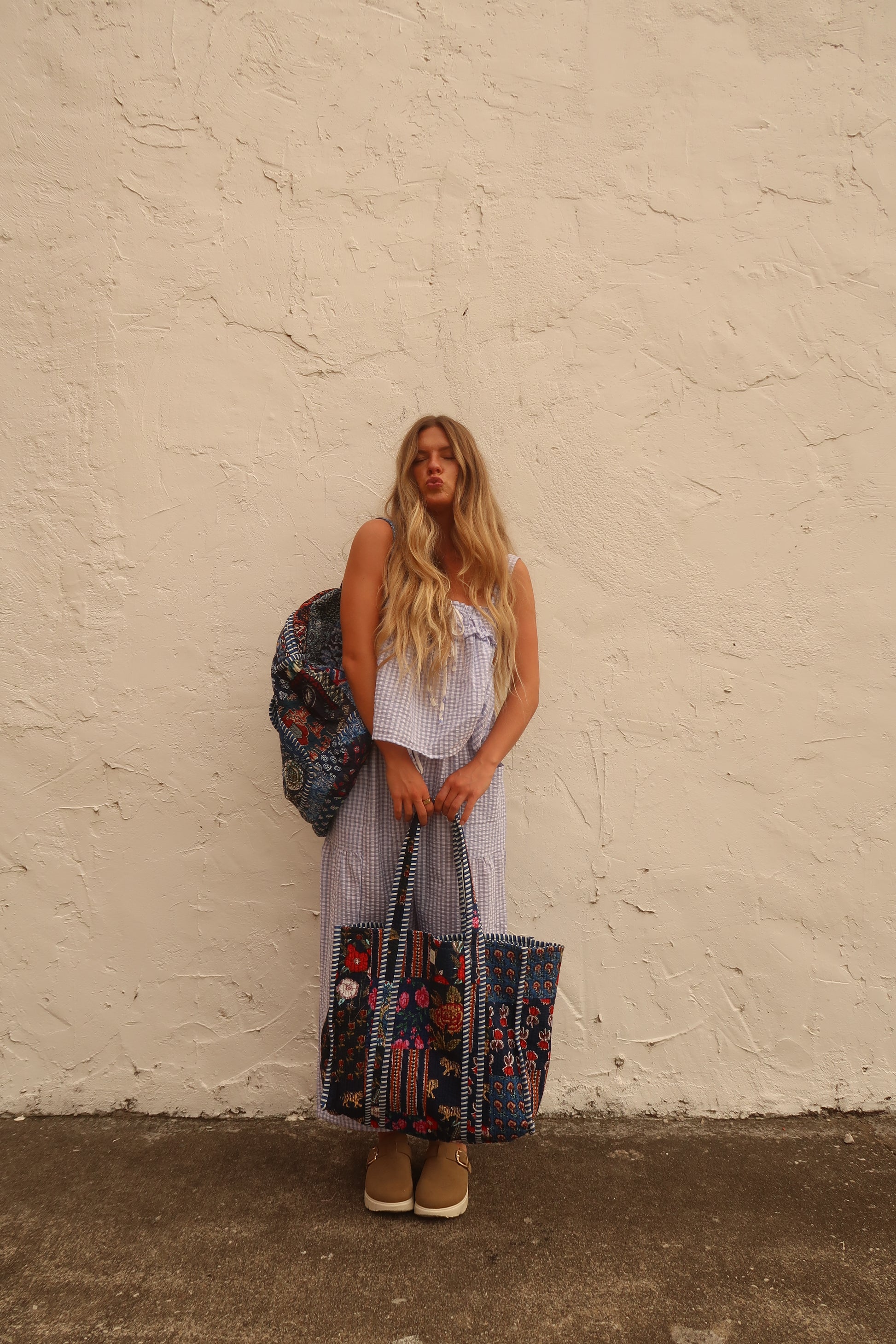 Our Sandi Quilted Backpack is a unique navy patchwork with a beautiful seersucker inside. Each bag is handmade in India and no two are the same! Each piece of the Quilted Club are designed by and for MJ. All of our quilted bags are lightweight but structured. The backpack has a pocket on the inside, outside as well as a zip closure and adjustable straps.