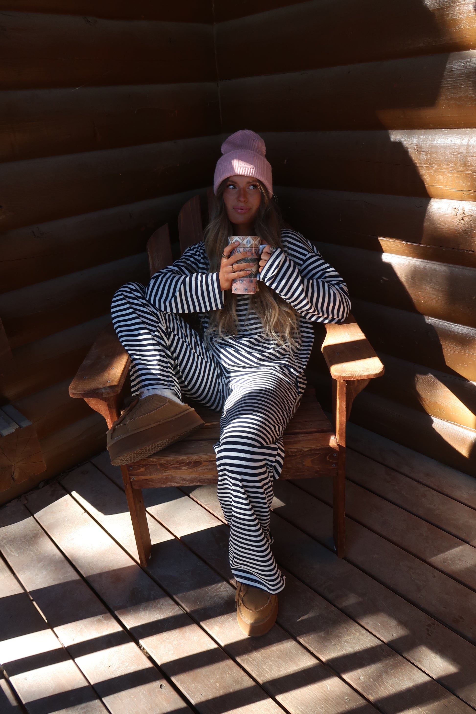 Effortless style meets comfort in this navy and white striped long sleeve top. The lightweight fabric keeps you cool while the classic stripe pattern works with everything in your closet. Rounded hem detail adds a subtle touch of modern flair. Perfect for layering or wearing solo, this versatile piece is your new go-to for casual days and relaxed weekends.