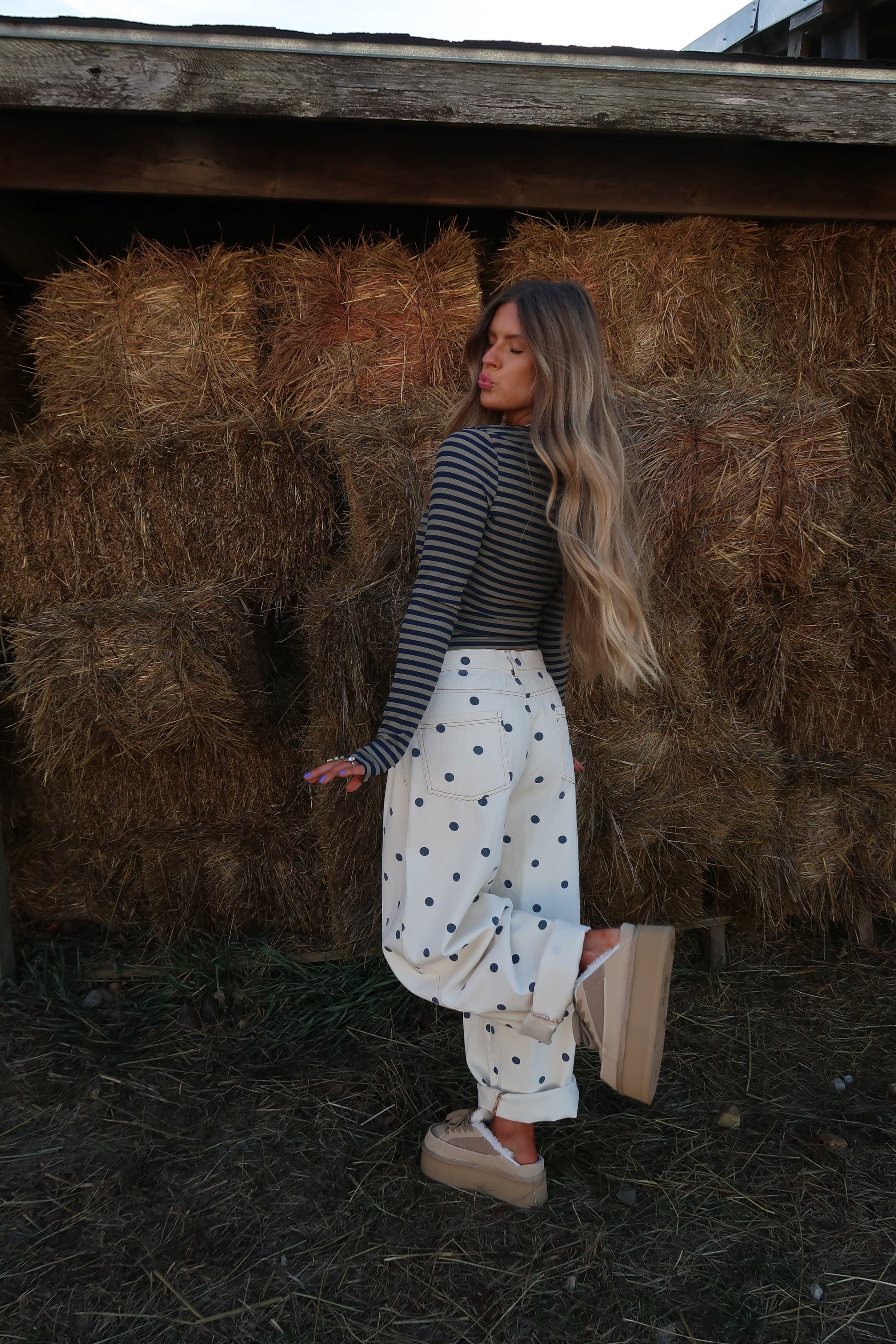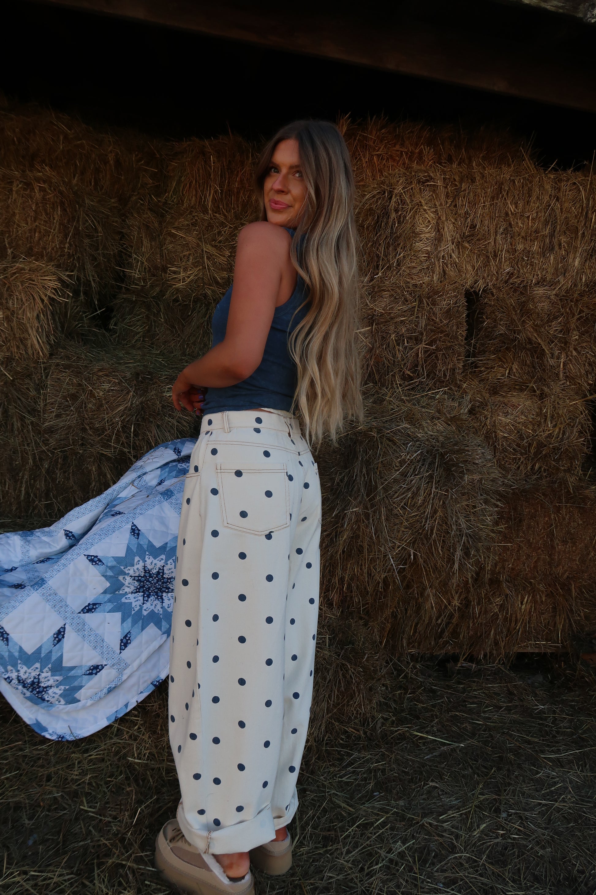 "Ready to make a statement? Look no further than our Latte dot barrel jeans, With delicate cream fabric and playful navy polka dots, these jeans will add a touch of whimsy to any outfit. Plus, the barrel leg fit ensure a comfortable and flattering fit for all body types. Get ready to turn heads with this oversized fashion statement!"