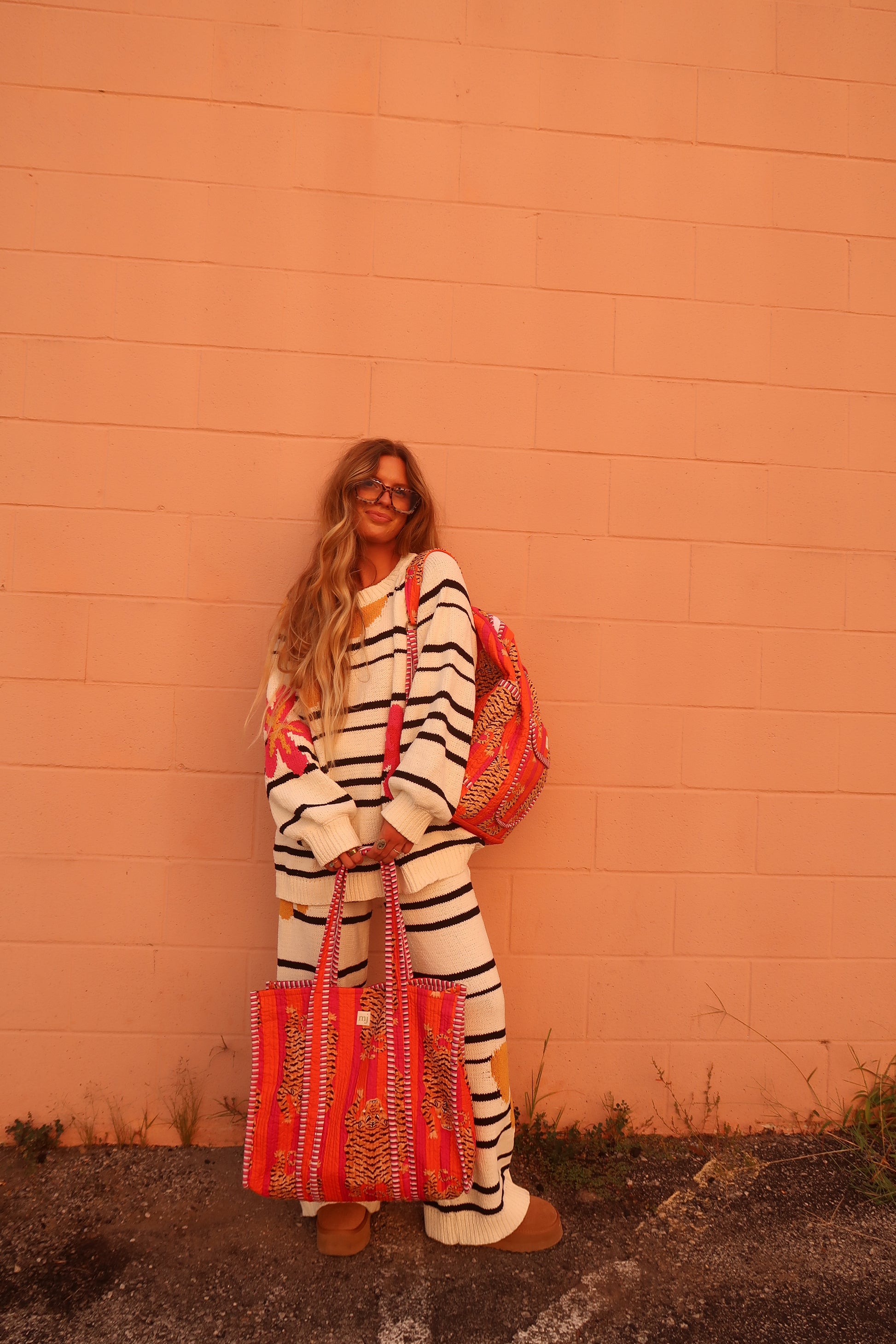Our Nova Quilted Backpack s a unique hot pink and orange stripe fabric with tigers printed and a hot pink seersucker inside. Each bag is handmade in India and no two are the same! Each piece of the Quilted Club are designed by and for MJ. All of our quilted bags are lightweight but structured. The backpack has a pocket on the inside, outside as well as a zip closure and adjustable straps.