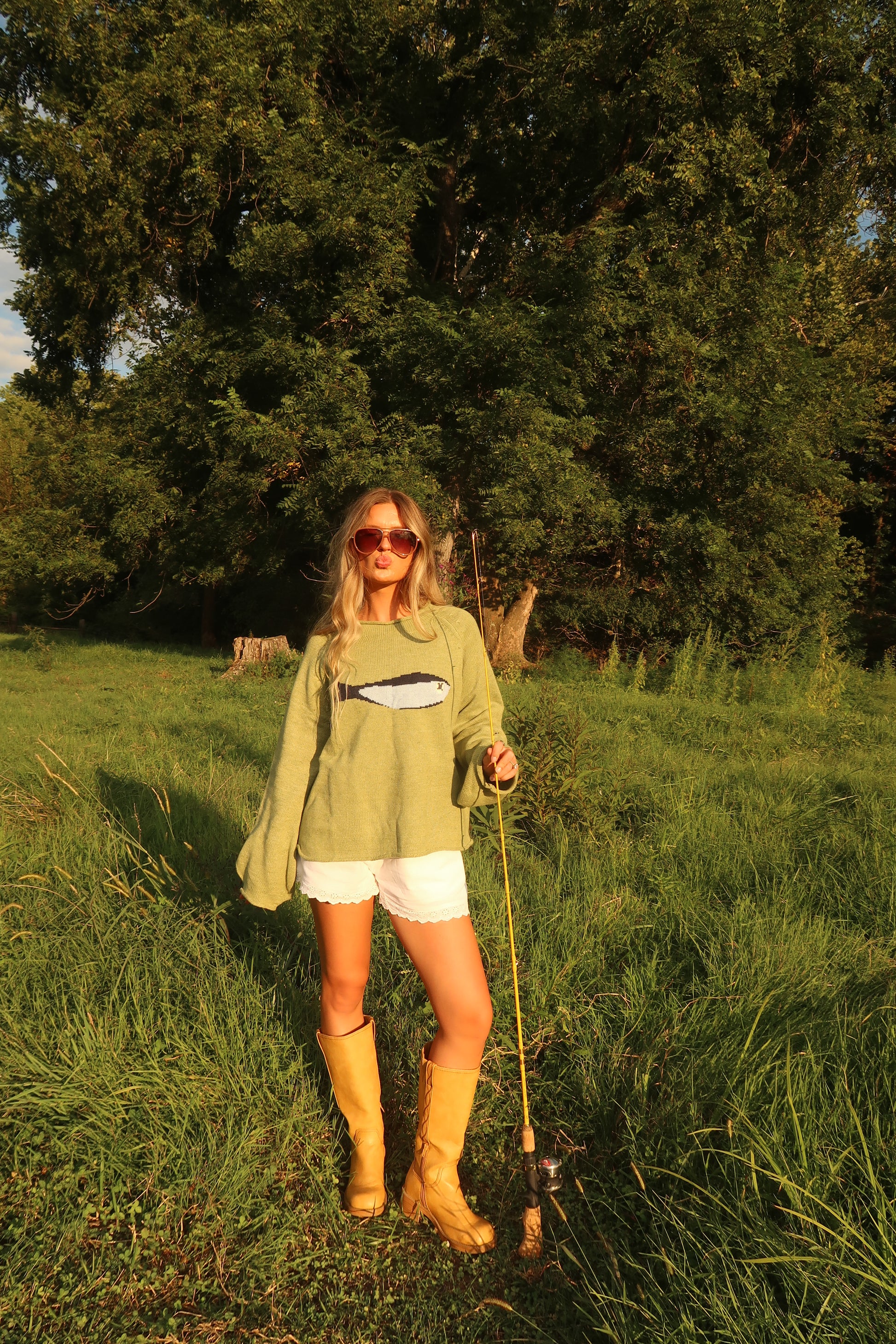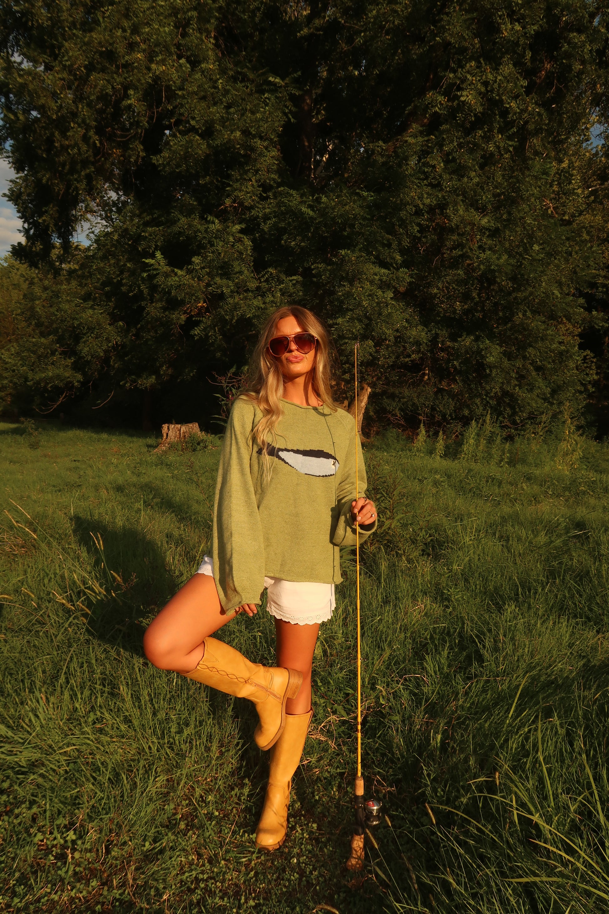 Dive into cozy charm with the On the Hook Sweater. This green sweater features a playful baby blue and navy fish design, adding a splash of fun to your wardrobe. Its slight oversized fit offers relaxed comfort, perfect for casual days or layering on chillier evenings. Embrace a comfortable, whimsical style that's as lively as your spirit.