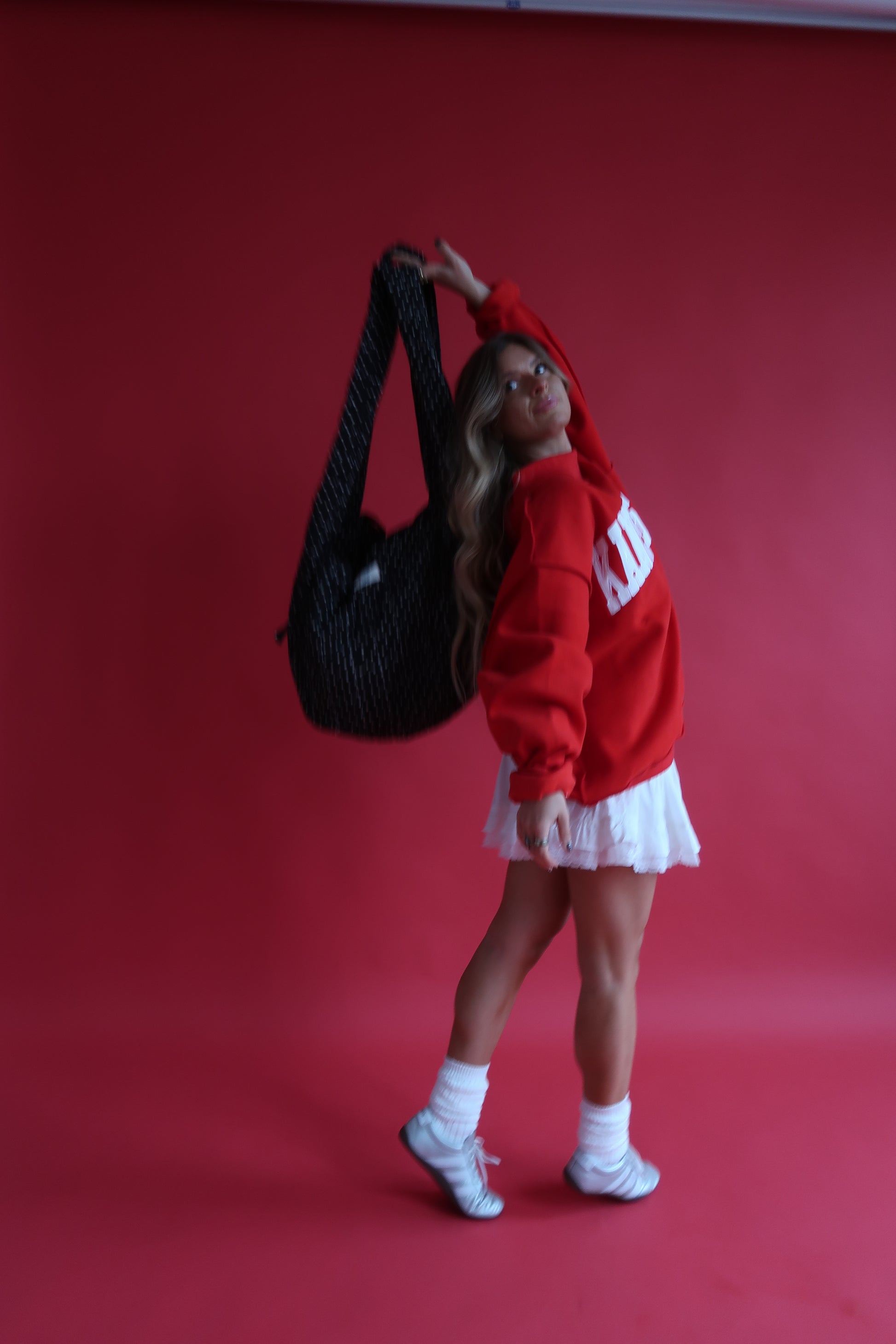 Meet our Pepper Quilted Sling Bag. Oversized and perfect for throwing everything in, this bag features a unique hand printed and sewn design. Each bag is one-of-a-kind, so you'll stand out from the crowd!"