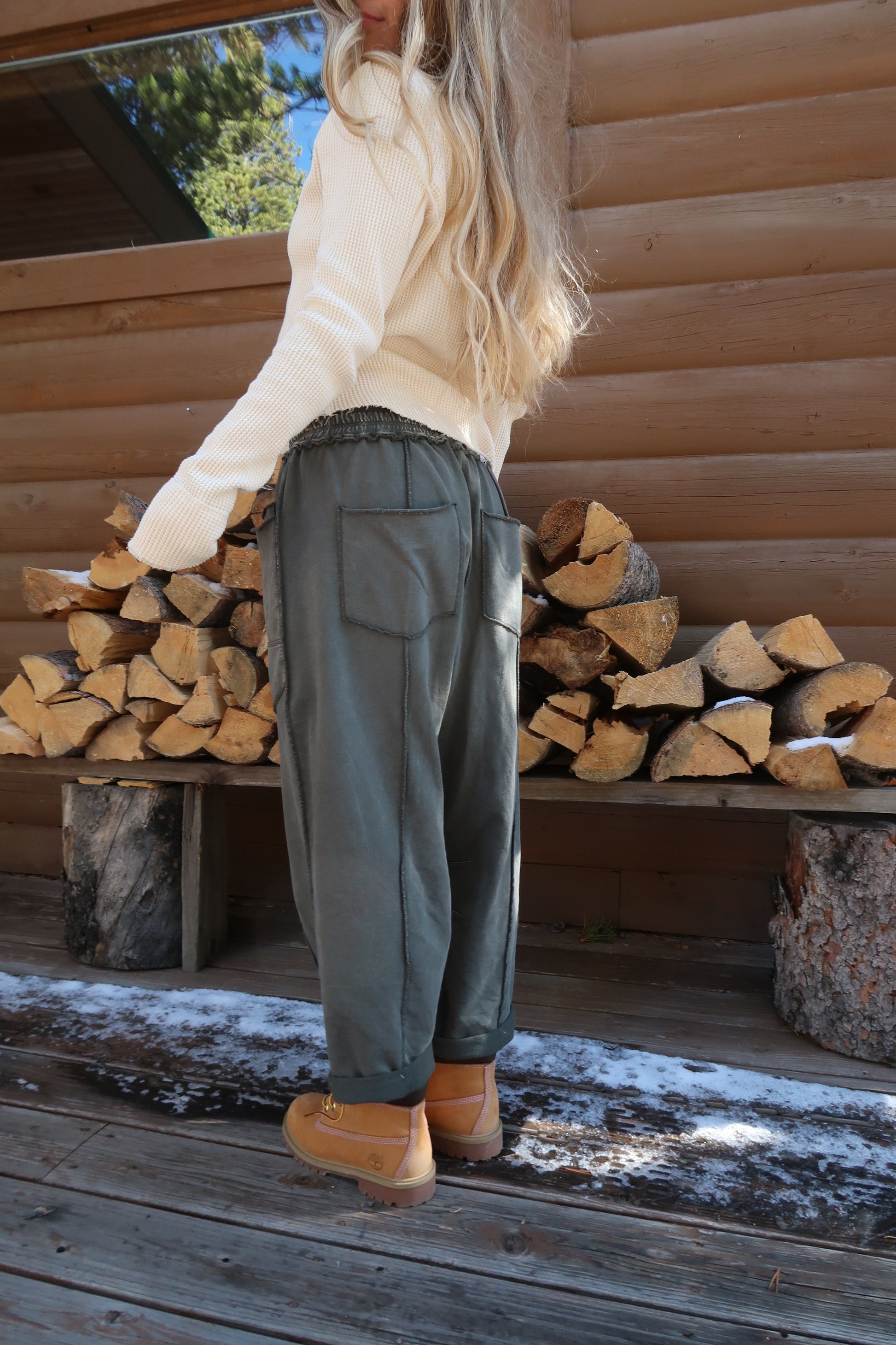 Glide into cozy comfort with these pine Barrel Sweats in a crisp dark green. Featuring a playful barrel leg cut and a snug crop fit, they bring relaxed style with a twist. The adjustable drawstring waist lets you dial in your perfect fit, making these terri knit sweatpants your go-to for lounging or casual adventures.