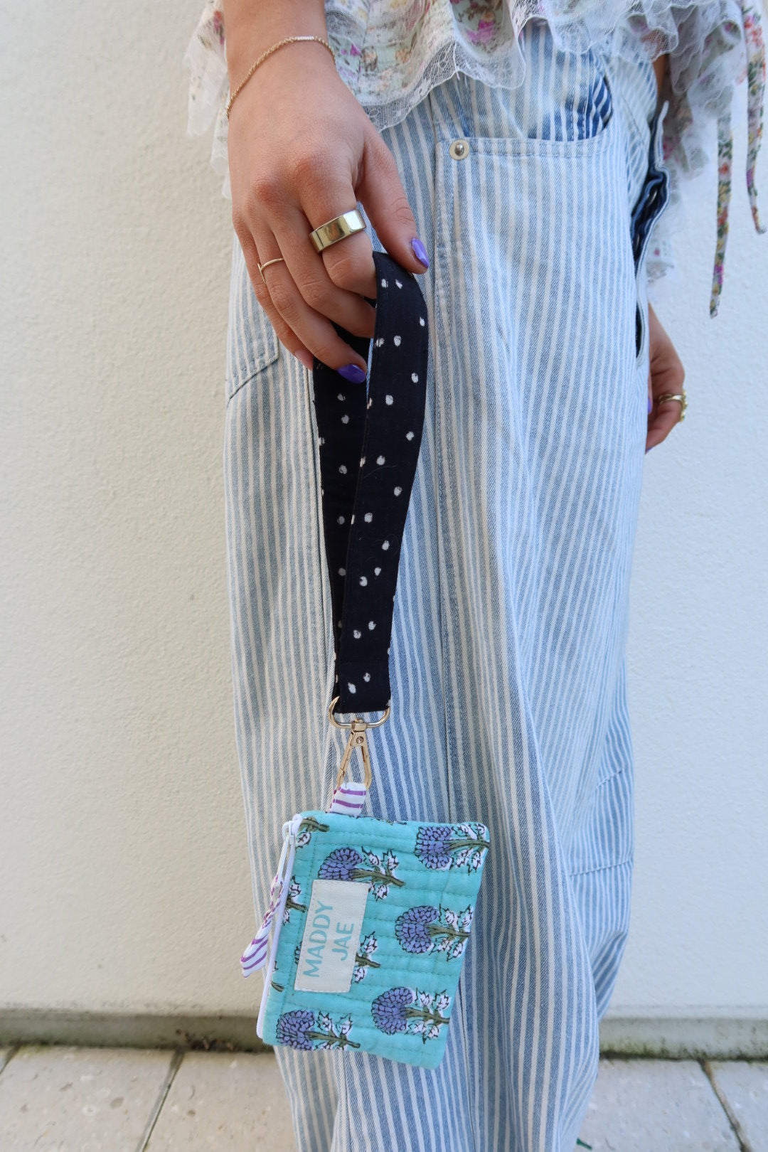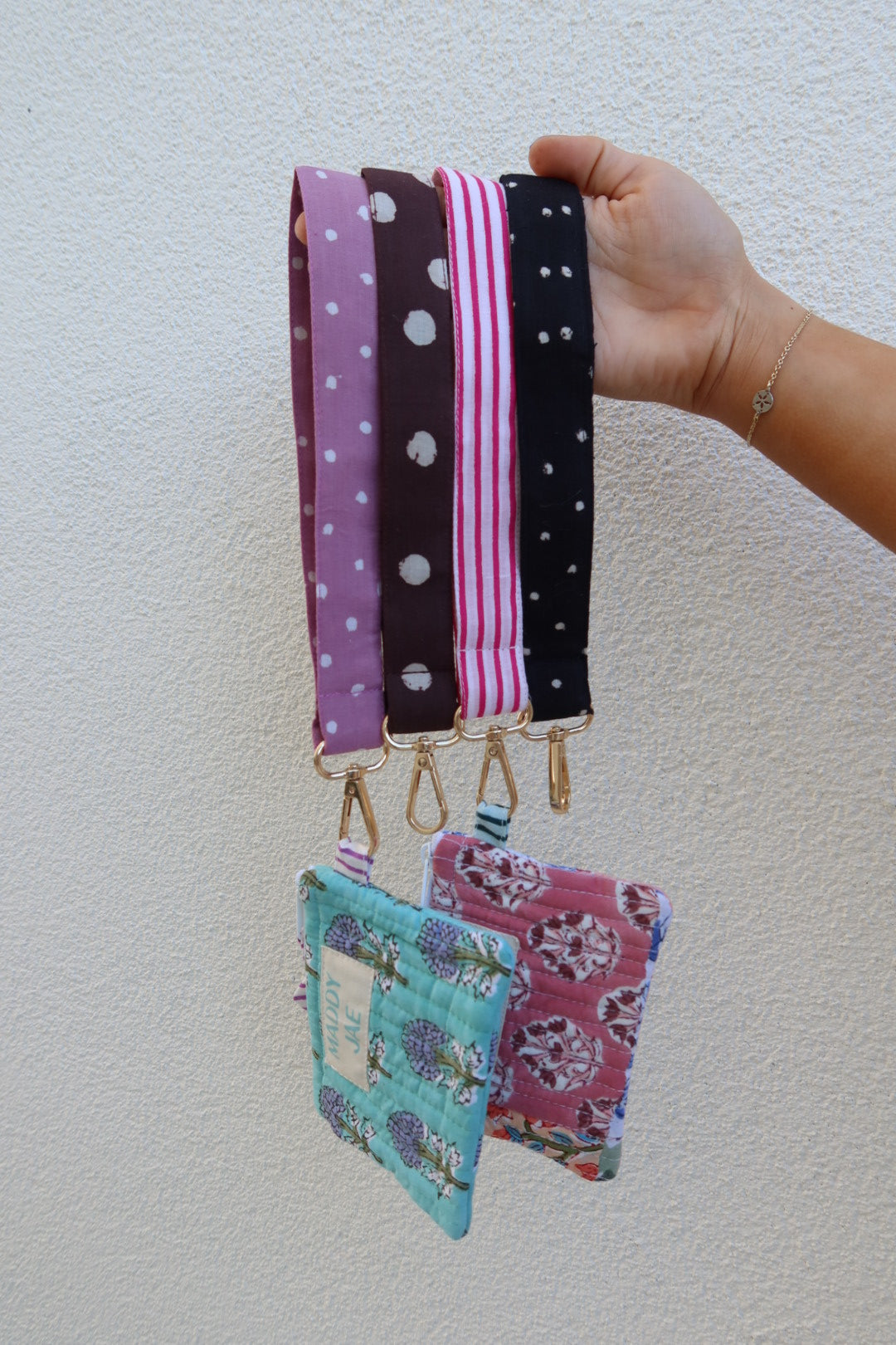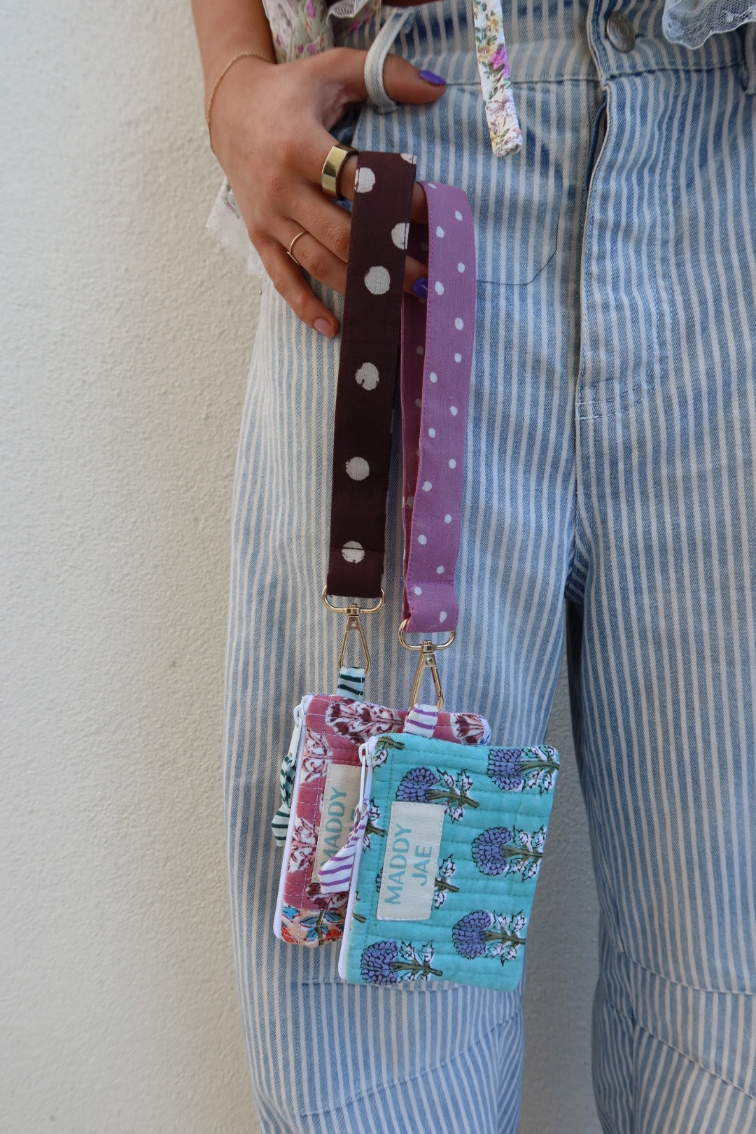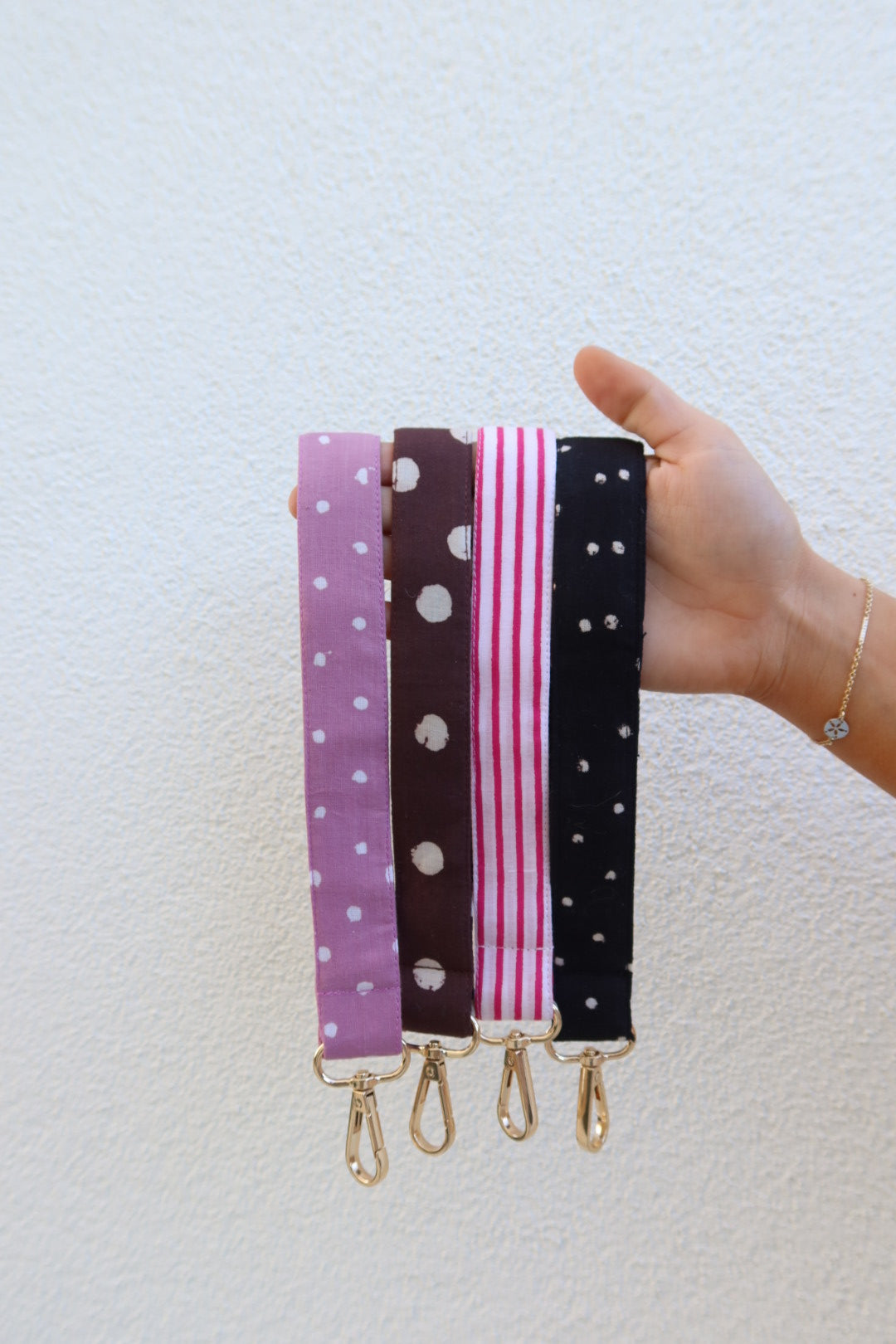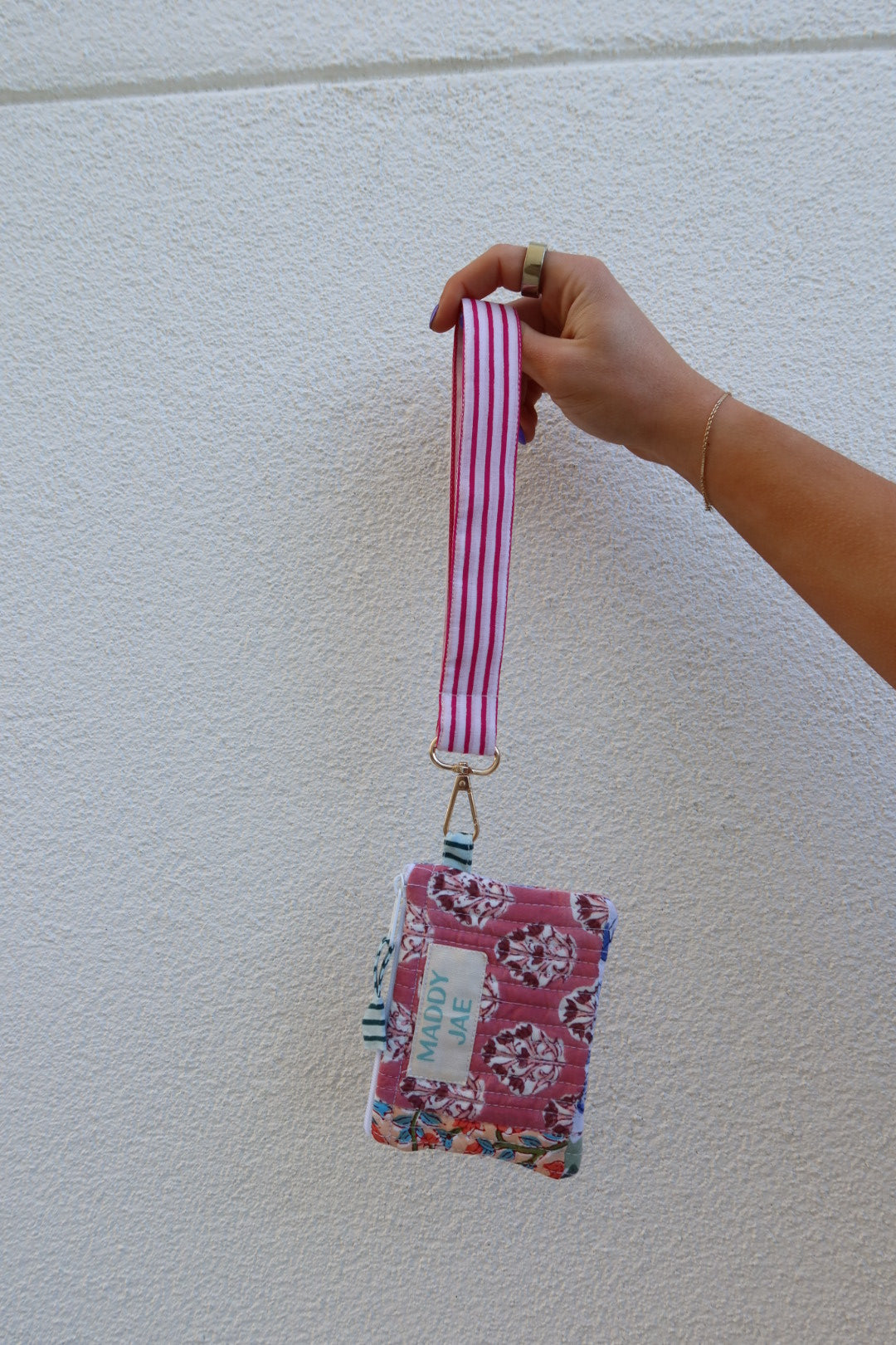 Carry your keys in style with the Pinky Stripe keychain, a charming hot pink and white stripe. Featuring sturdy brass hardware that adds a touch of vintage flair, this wrist keychain keeps your essentials within easy reach while making a fun fashion statement. Perfect for adding personality to your everyday carry, whether clipped to your bag or worn around your wrist.