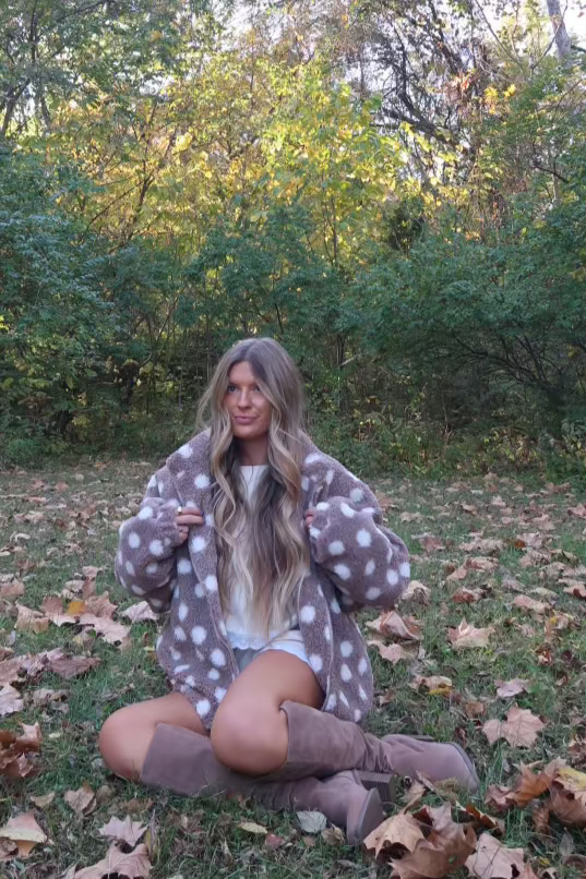 Get cozy this fall with our Cozi Polka Dot Sherpa Zip Up Jacket! The taupe polka dot print adds a touch of fun to this cozy sherpa jacket. Complete with a full zip up, it's perfect for achieving those cozy fall vibes.