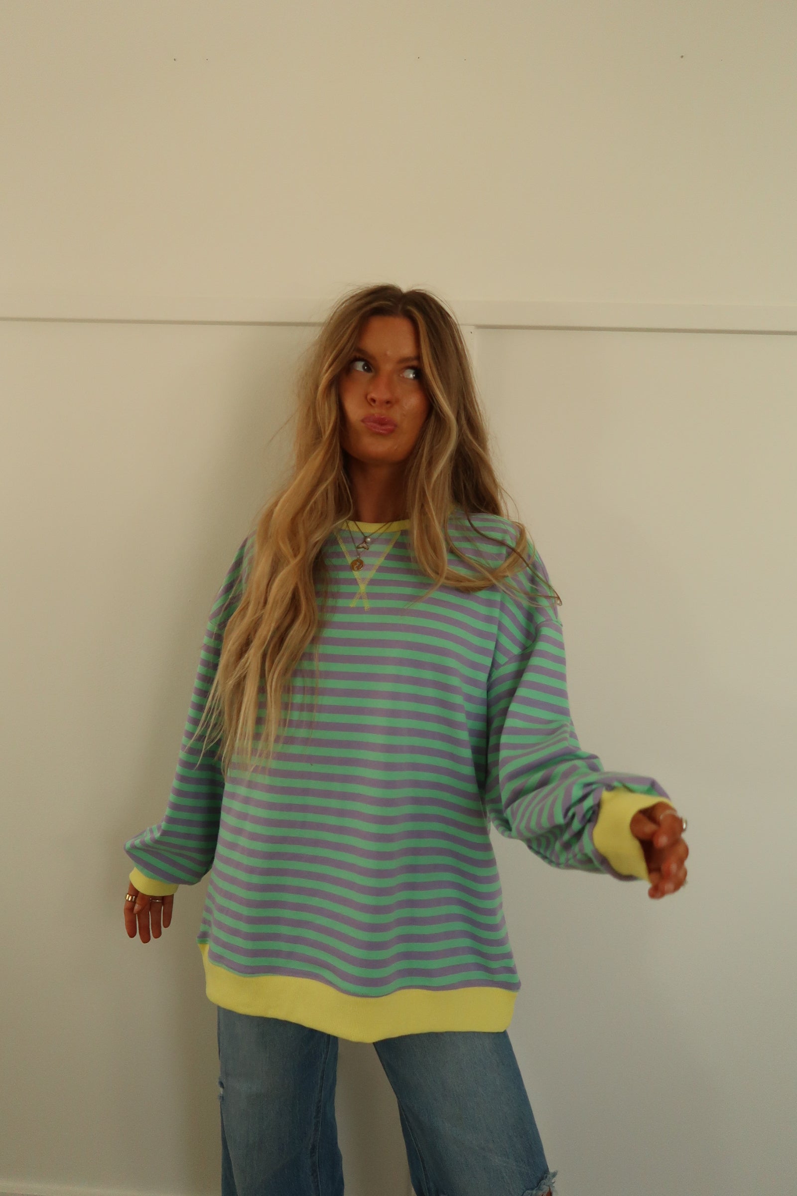Add some color to your wardrobe with our fun multi color stipe terry knit crewneck. The boxy oversized fit and lightweight material make it perfect for the transition into warmer weather