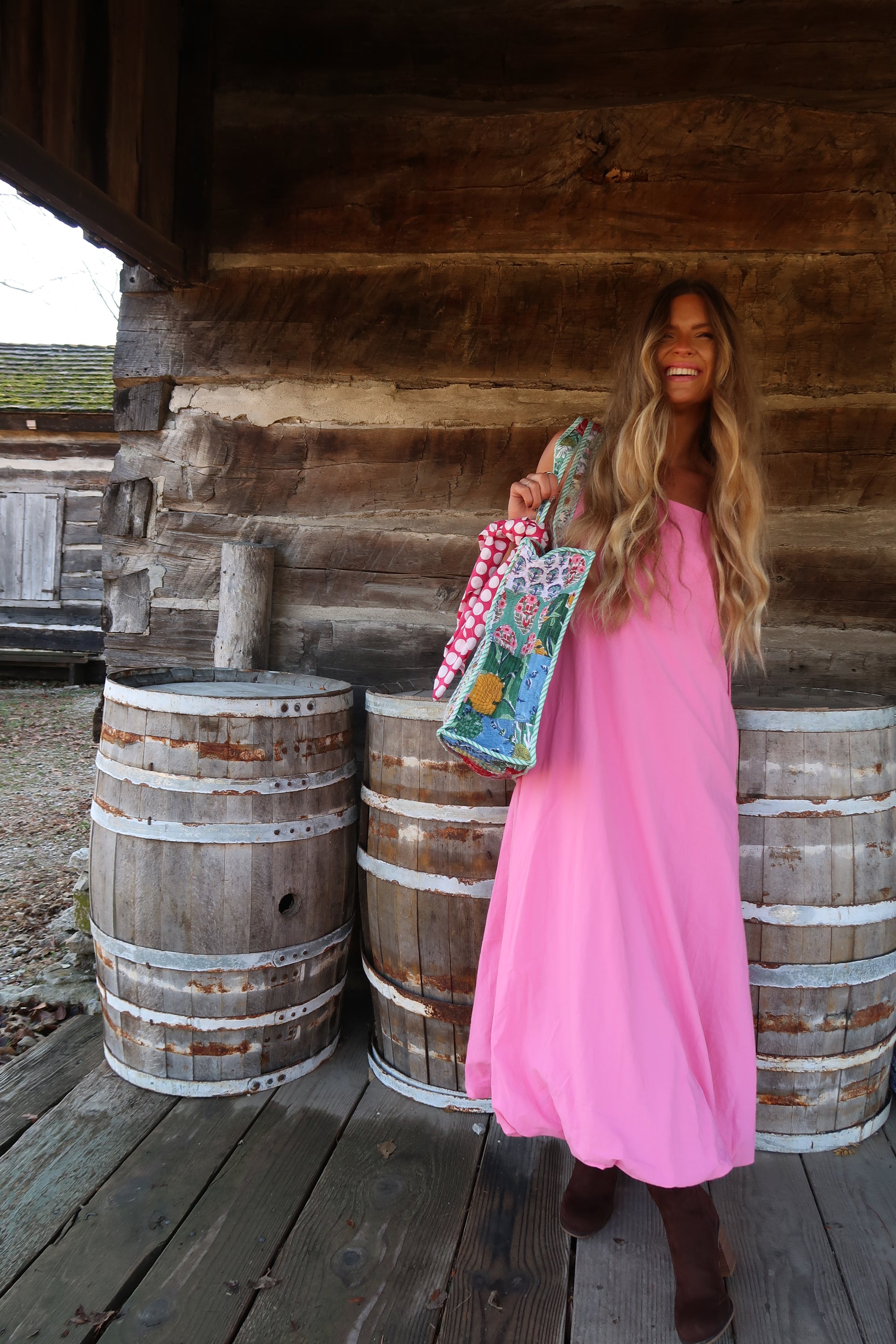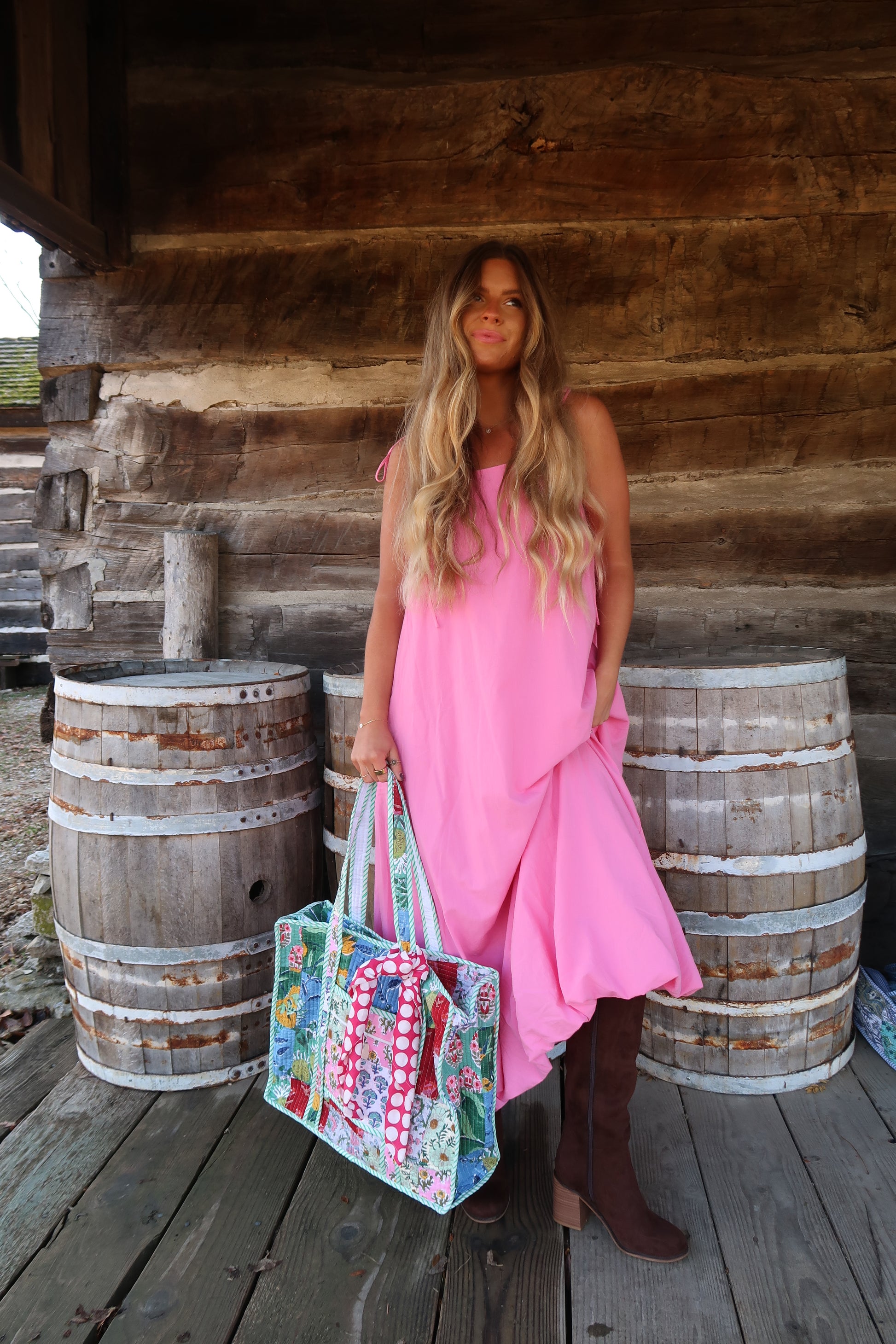 Our Poppy Quilted Dote Bag is a unique funky fun patchwor with pops of bright teal and a beautiful teal and white seersucker contrast inside. Our dote bag is our newest style with the style of a tote bag and the functionality of a duffle. Each bag is handmade in India and no two are the same! Each piece of the Quilted Club are designed by and for MJ. All of our quilted bags are lightweight but structured. The tote bag has a pocket on the inside.