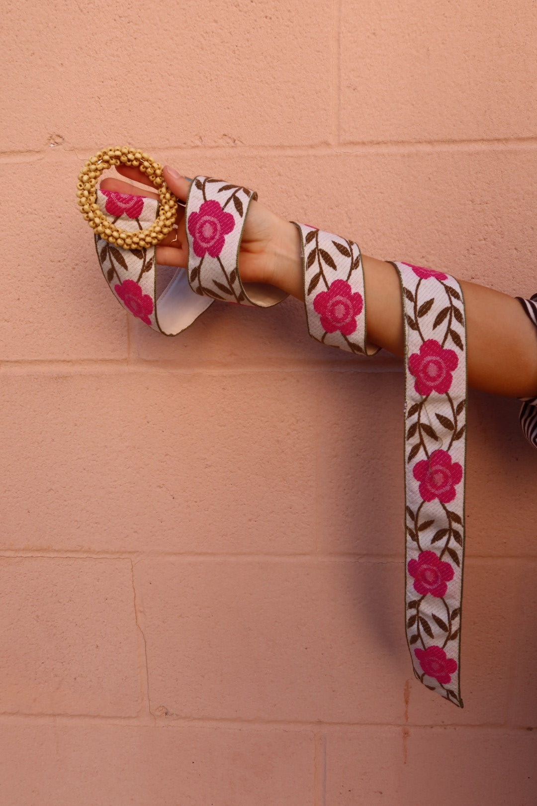 Cinch your waist with a touch of botanical charm! This vintage-inspired belt features delicate embroidered florals in soft pink stitching that brings garden-fresh style to any outfit. The natural wooden bead buckle adds an earthy, artisanal finish that pairs perfectly with dresses, skirts, or high-waisted jeans. A playful accessory that celebrates timeless design with a modern twist.