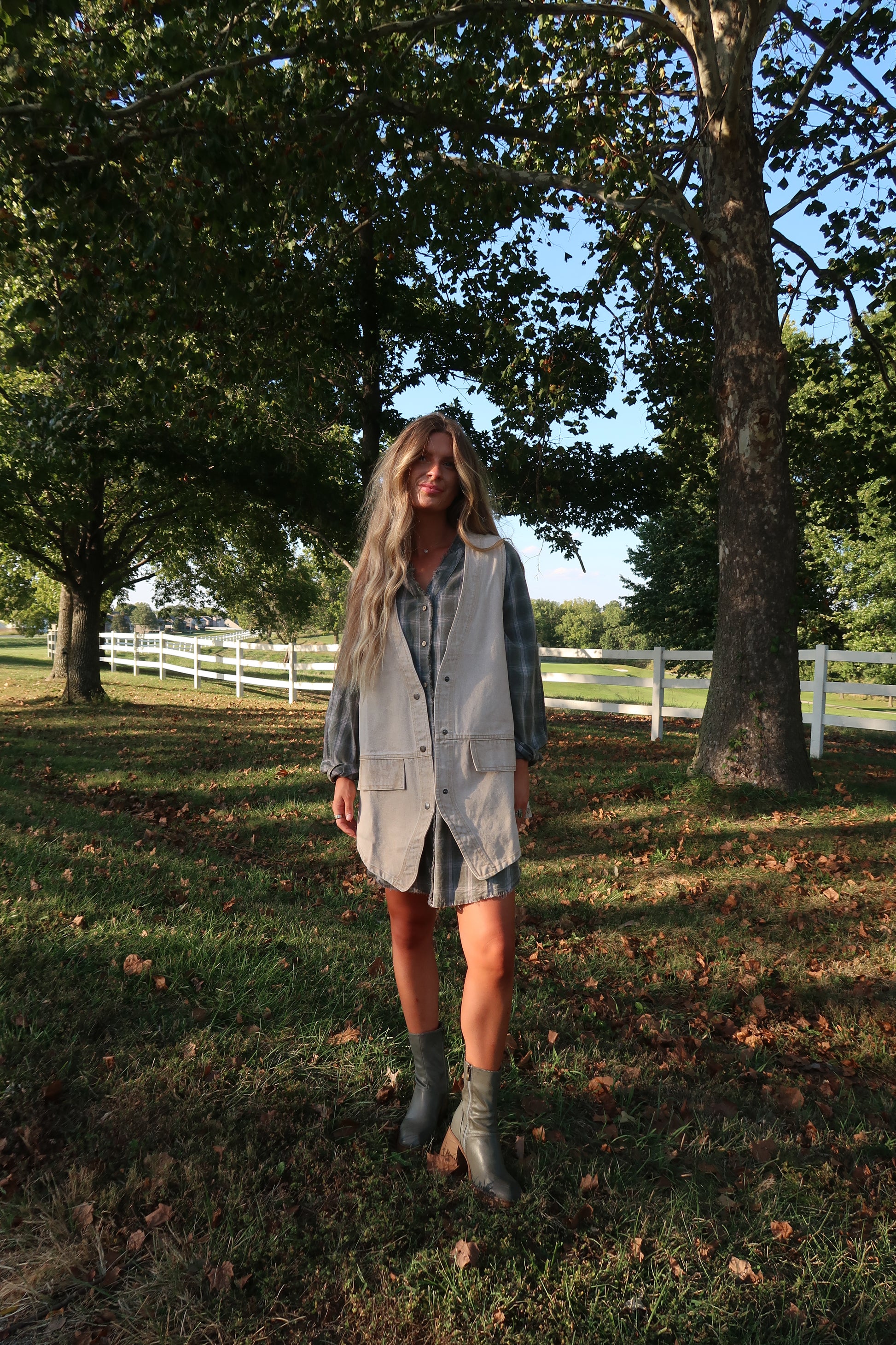 Embrace cool comfort with the tan Ridge Denim Vest. Crafted from light wash denim, its oversized fit and snap front details bring a fresh twist to everyday style. Perfect for layering over your favorite tees, this unique piece adds a playful edge to any outfit while keeping you effortlessly cool.