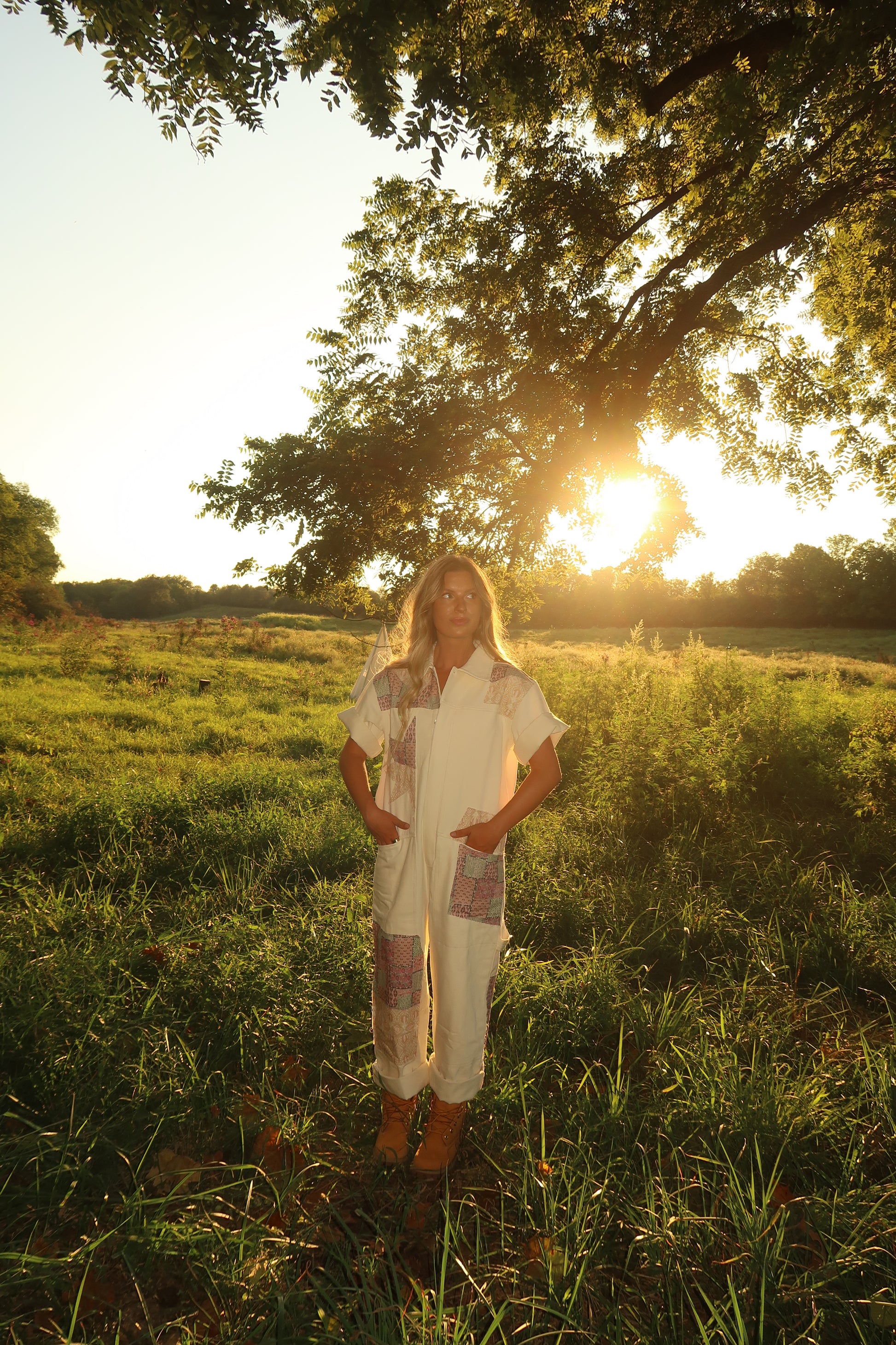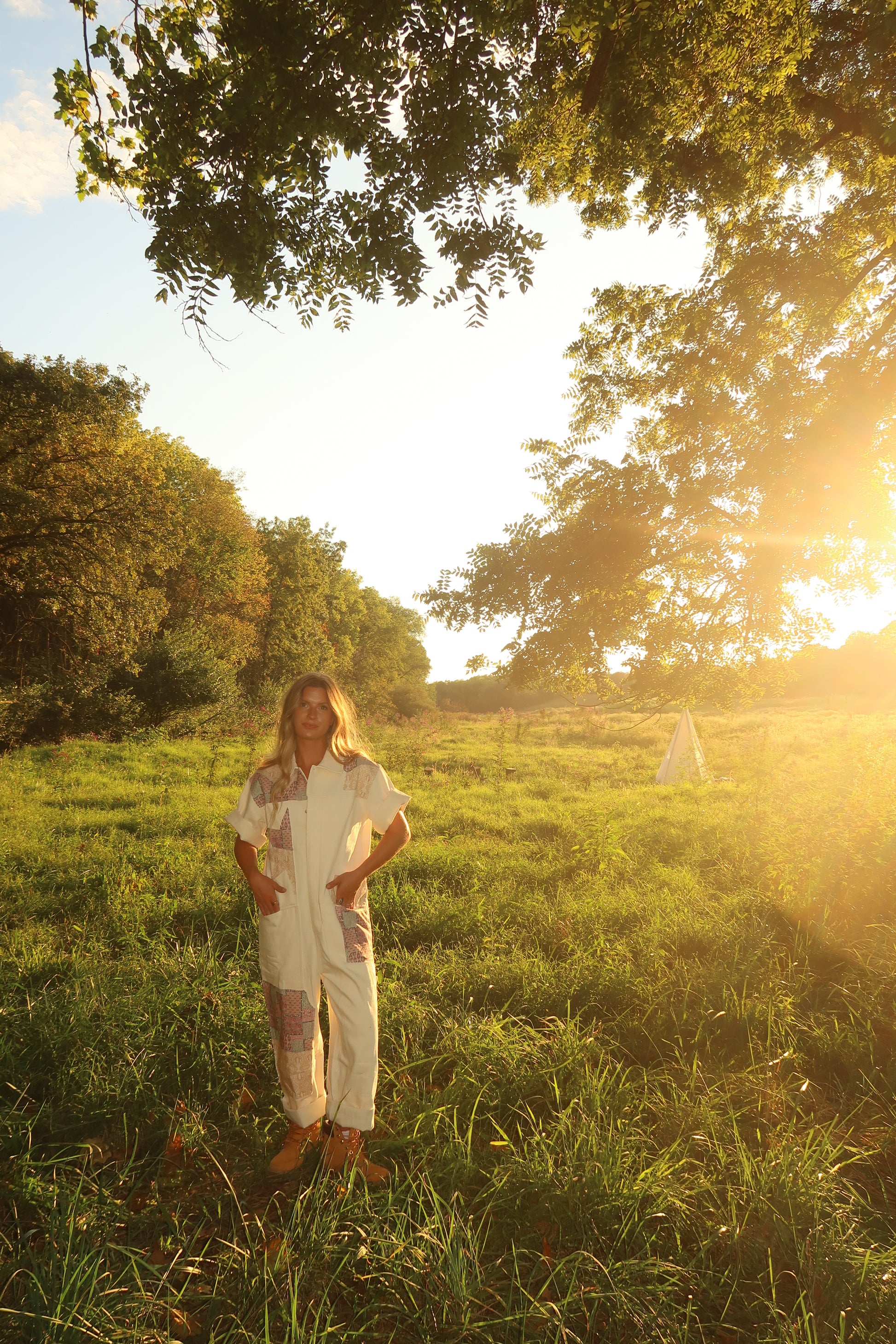 The Rose' Ranger Jumpsuit blends comfort and charm with its ivory soft wash fabric and playful mixed patchwork design. This cream utility style features short sleeves and a button-front closure, making it easy to wear all day long. Perfect for adding a bit of fun to your everyday look, it’s a versatile piece that pairs effortlessly with your favorite accessories.