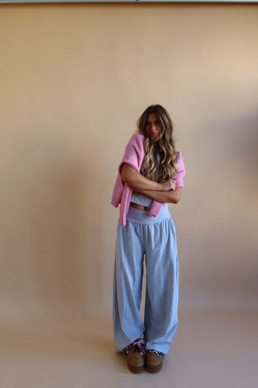 Sail away into warmth and comfort with this sail awaay sweater. The pink color and oversized boxy fit make it perfect for lounging, while the soft and cozy material will keep you warm all day. Complete with brown lettering and trim, this sweater is a must-have for any fun and quirky wardrobe.