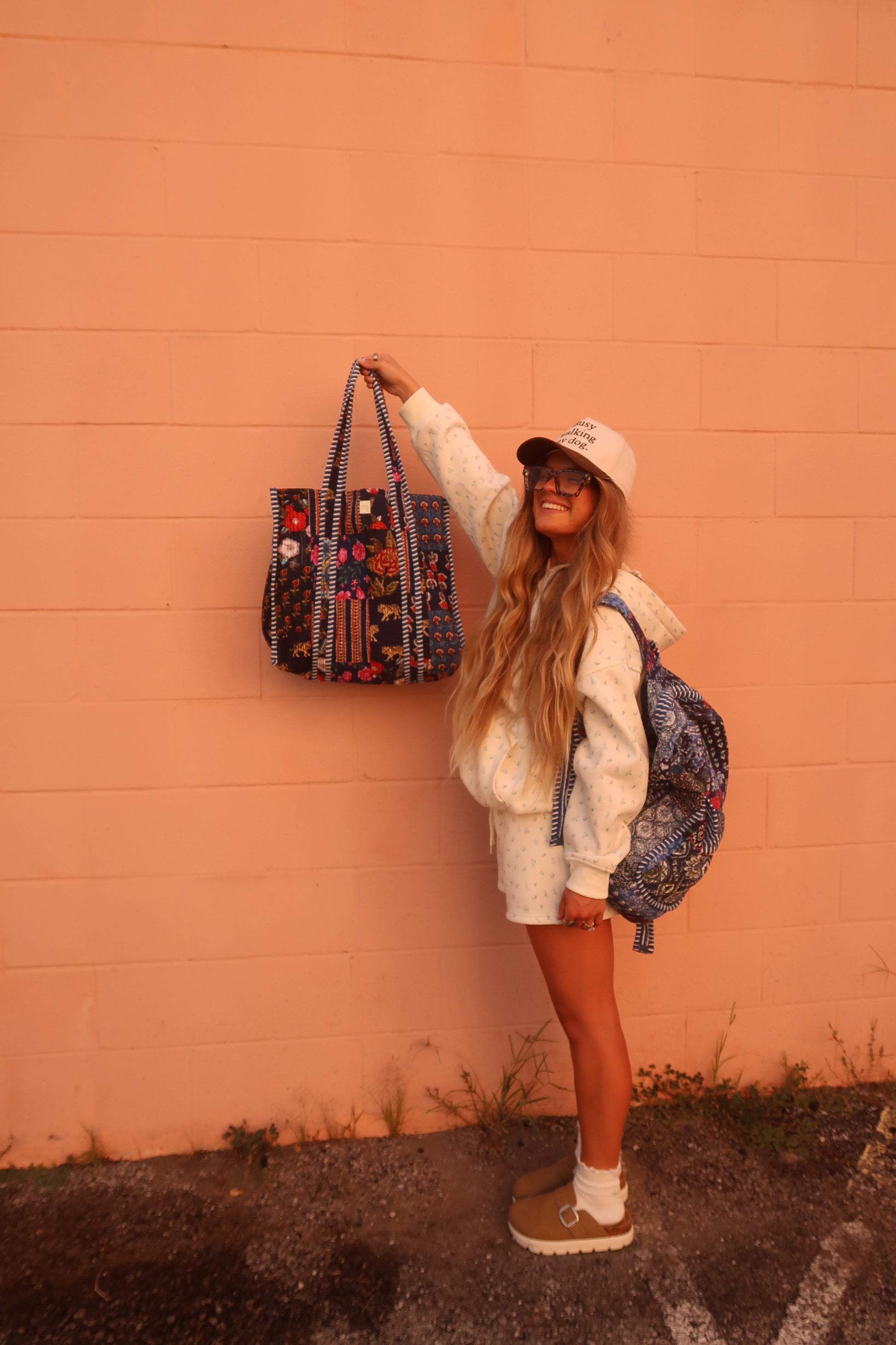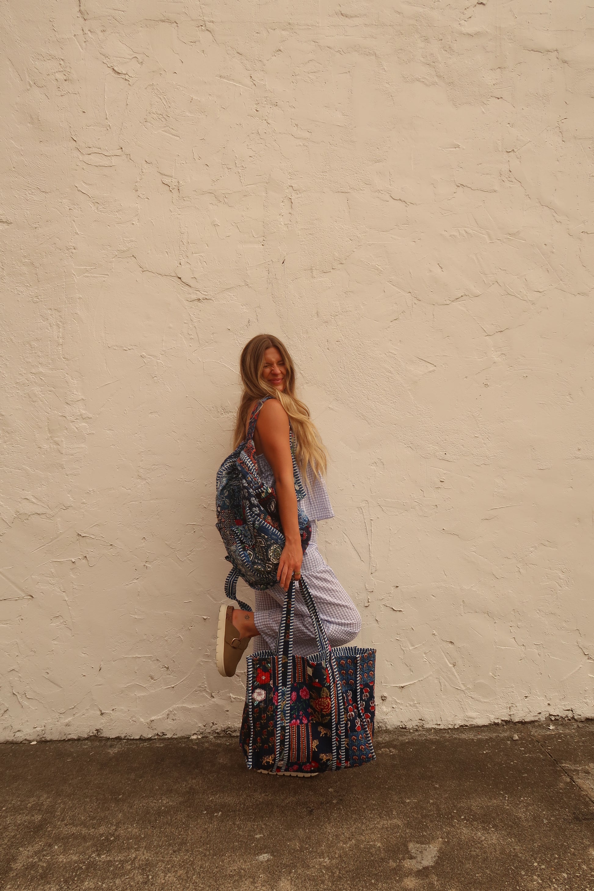 Our Sandi Quilted Tote Bag is a unique navy patchwork with a beautiful contrast inside. Each bag is handmade in India and no two are the same! Each piece of the Quilted Club are designed by and for MJ. All of our quilted bags are lightweight but structured. The tote bag has a pocket on the inside.