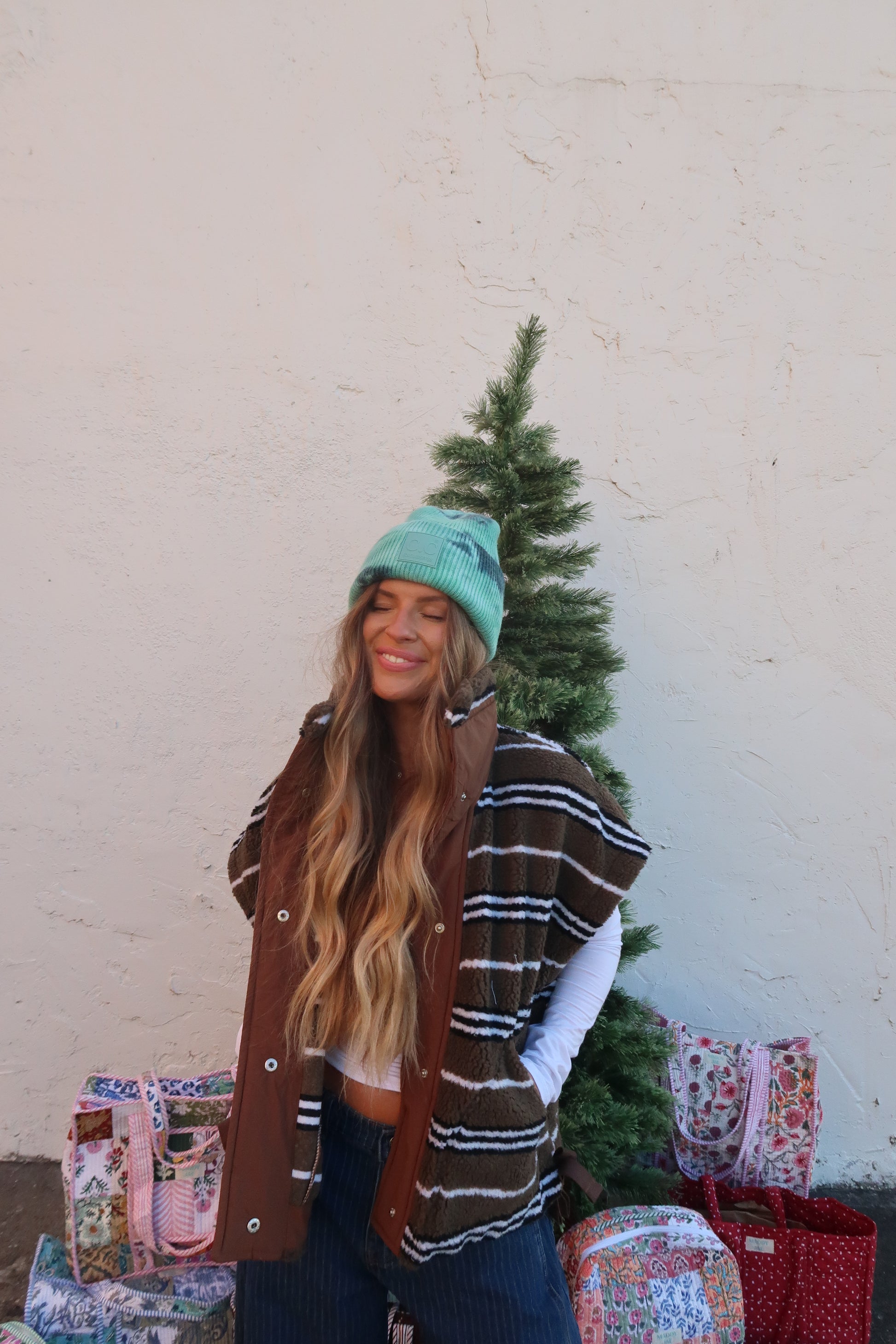 Wrap yourself in cozy comfort with this adorable brown oversized sherpa vest! Featuring a chic high neck and charming bow tie details on the sides, it's the perfect layering piece for any season. The convenient button snaps make it easy to slip on and off, while crisp white and black stripes add a fun pop of contrast. Whether you're lounging at home or heading out for a casual adventure, this sherpa vest brings warmth and whimsy to your everyday style.