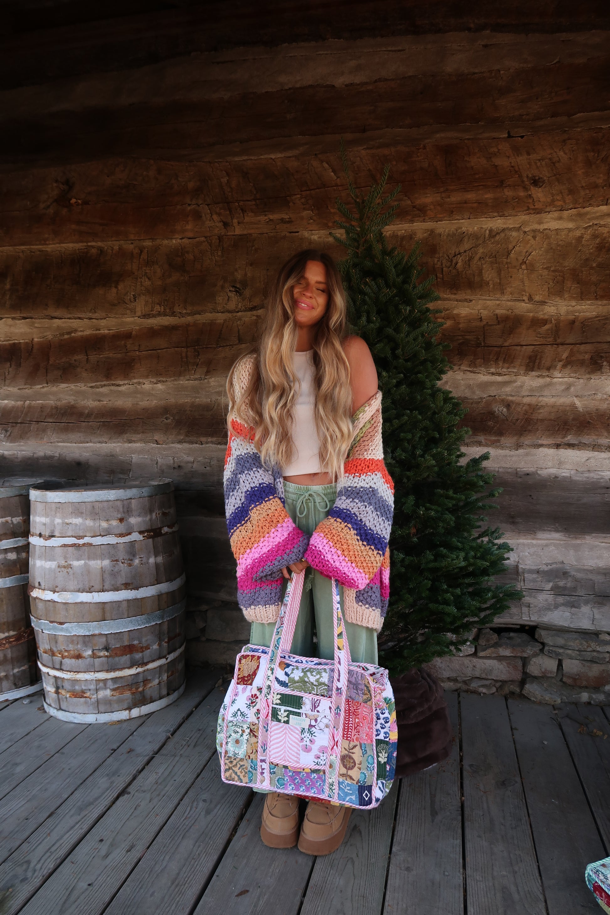 Our Shylo Quilted Dote Bag is a unique funky fun patchwork with pops of pink and a beautiful pink and white seersucker contrast inside. Our dote bag is our newest style with the style of a tote bag and the functionality of a duffle. Each bag is handmade in India and no two are the same! Each piece of the Quilted Club are designed by and for MJ. All of our quilted bags are lightweight but structured. The tote bag has a pocket on the inside.