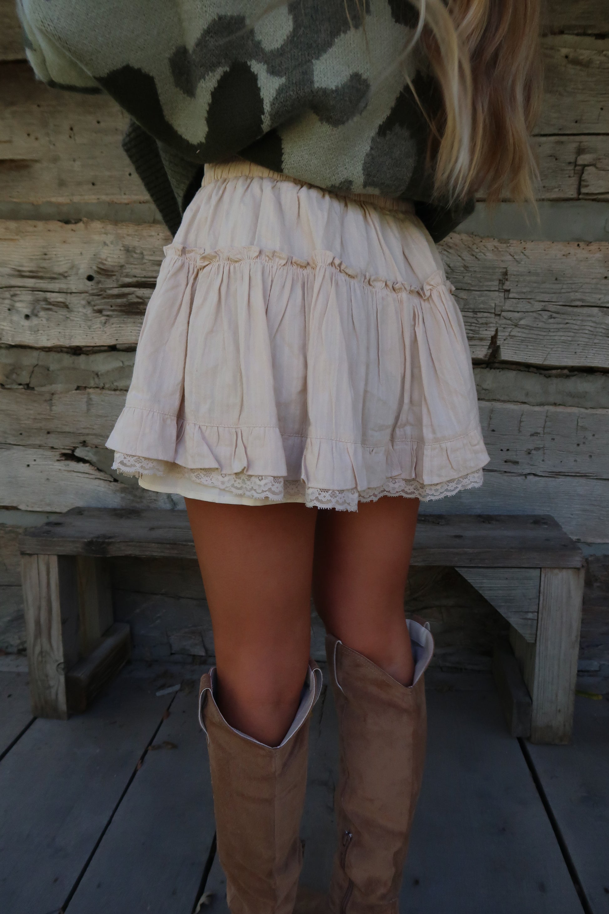This playful beige mini skirt features delicate lace trim and charming ruffle tiers that add a flirty bounce to your step. The elastic waist ensures a comfy fit, while the sweet bow detail at the waist brings a cute finishing touch. Perfect for sunny days or casual outings, it’s a fun and feminine piece to brighten your wardrobe.