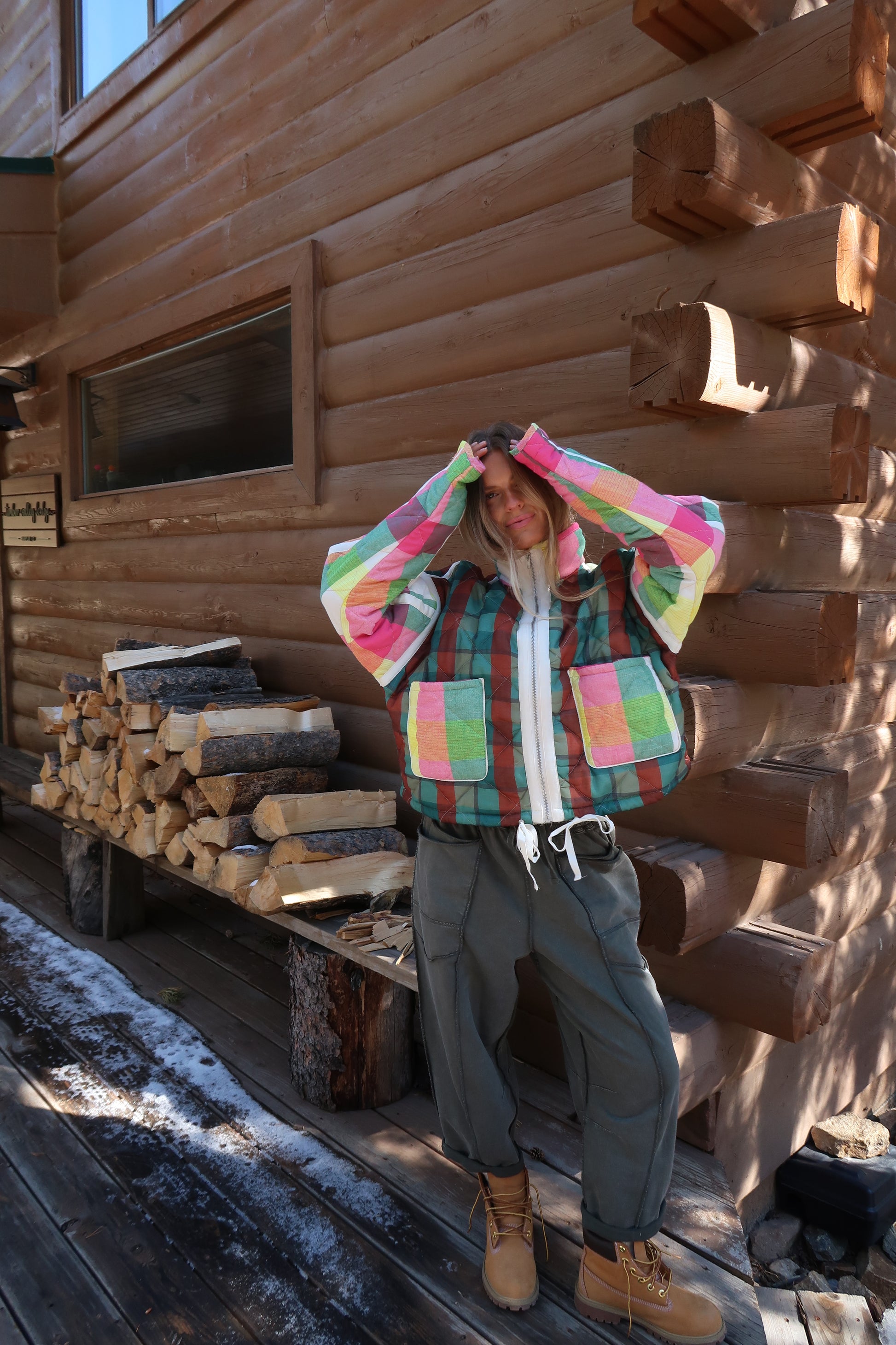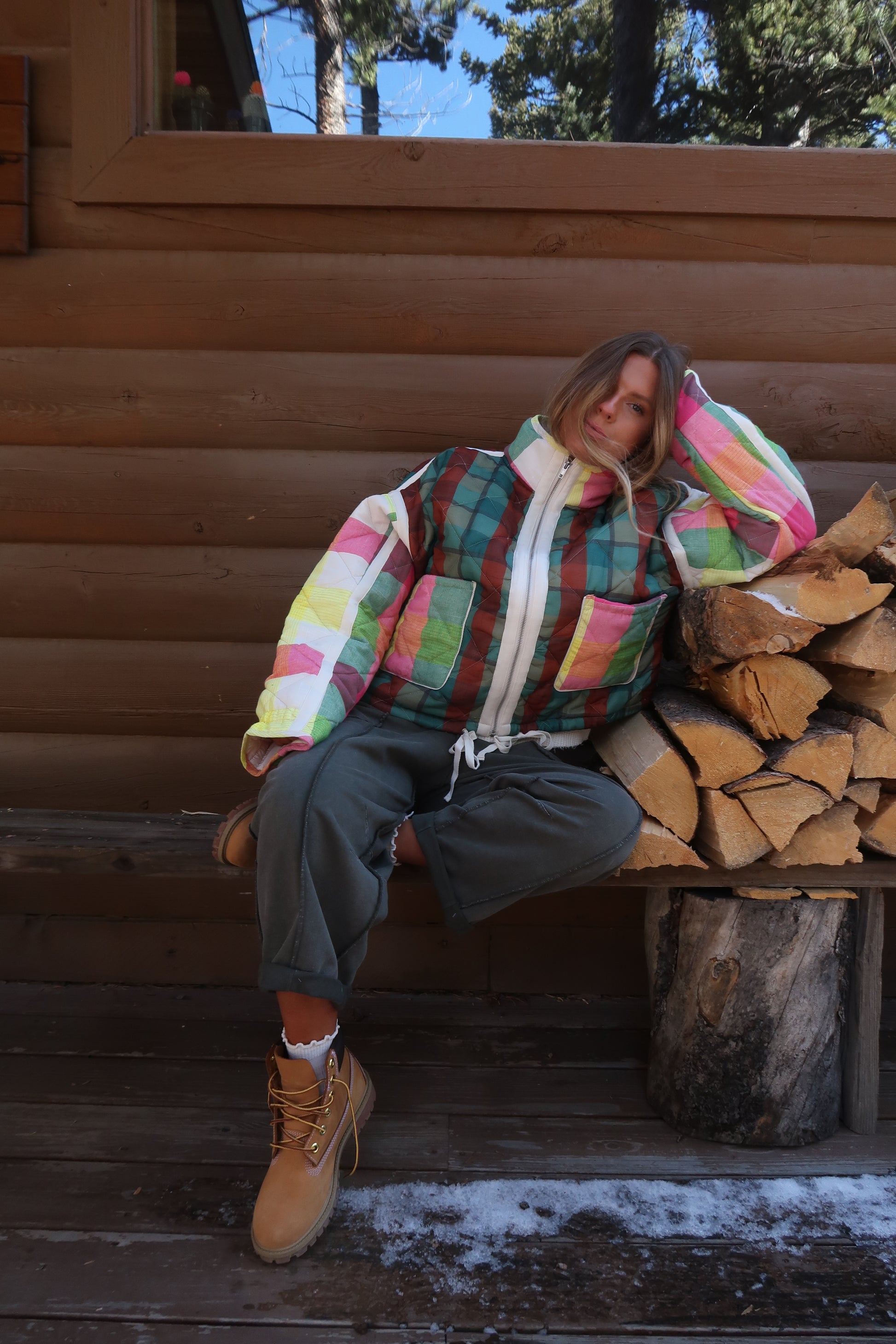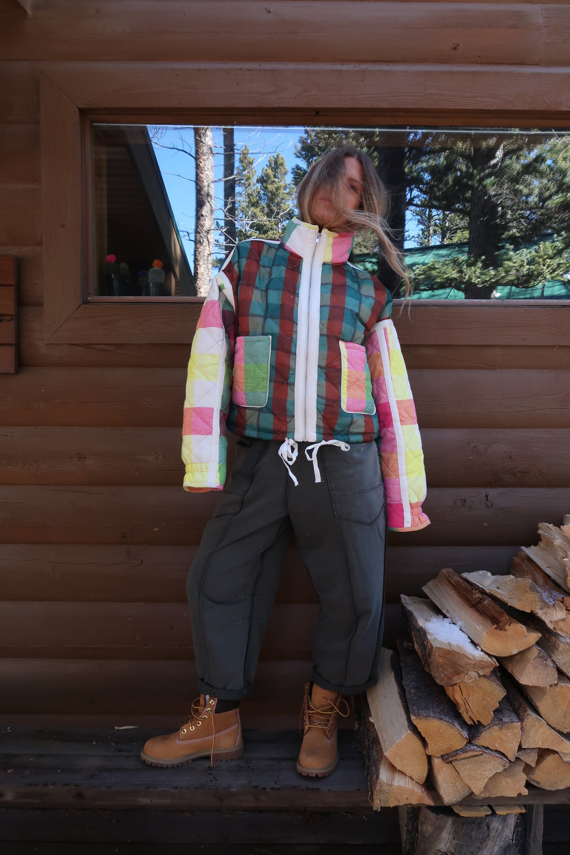 Layer up with our Stained Glass Jacket—a lightweight puffer that's as fun as it is functional. This multi-color plaid beauty features a mixed plaid design that catches the light just right, while adjustable waist strings let you customize the fit to your vibe. Perfect for those days when you want warmth without the bulk. Stay cozy, stay stylish.
