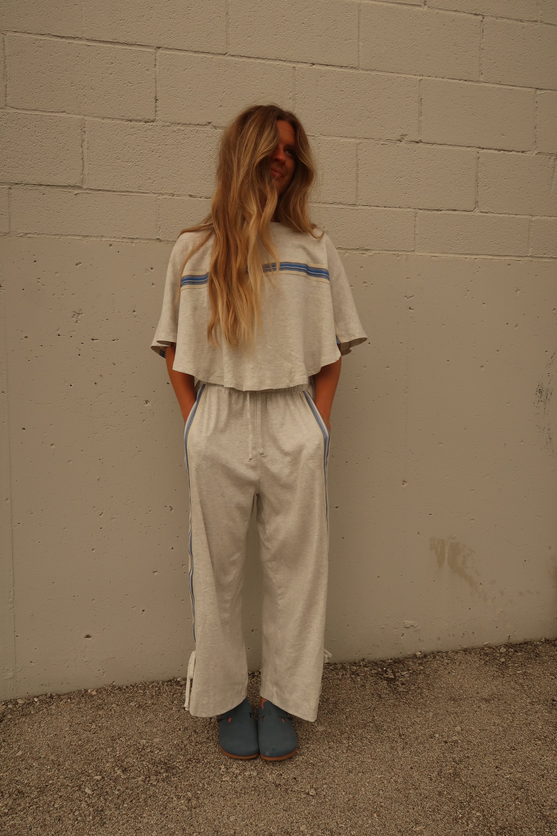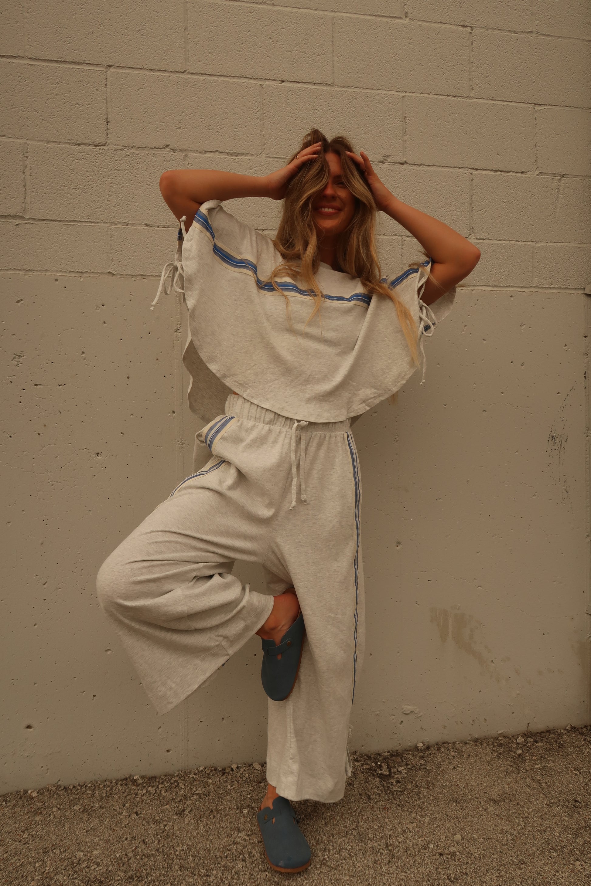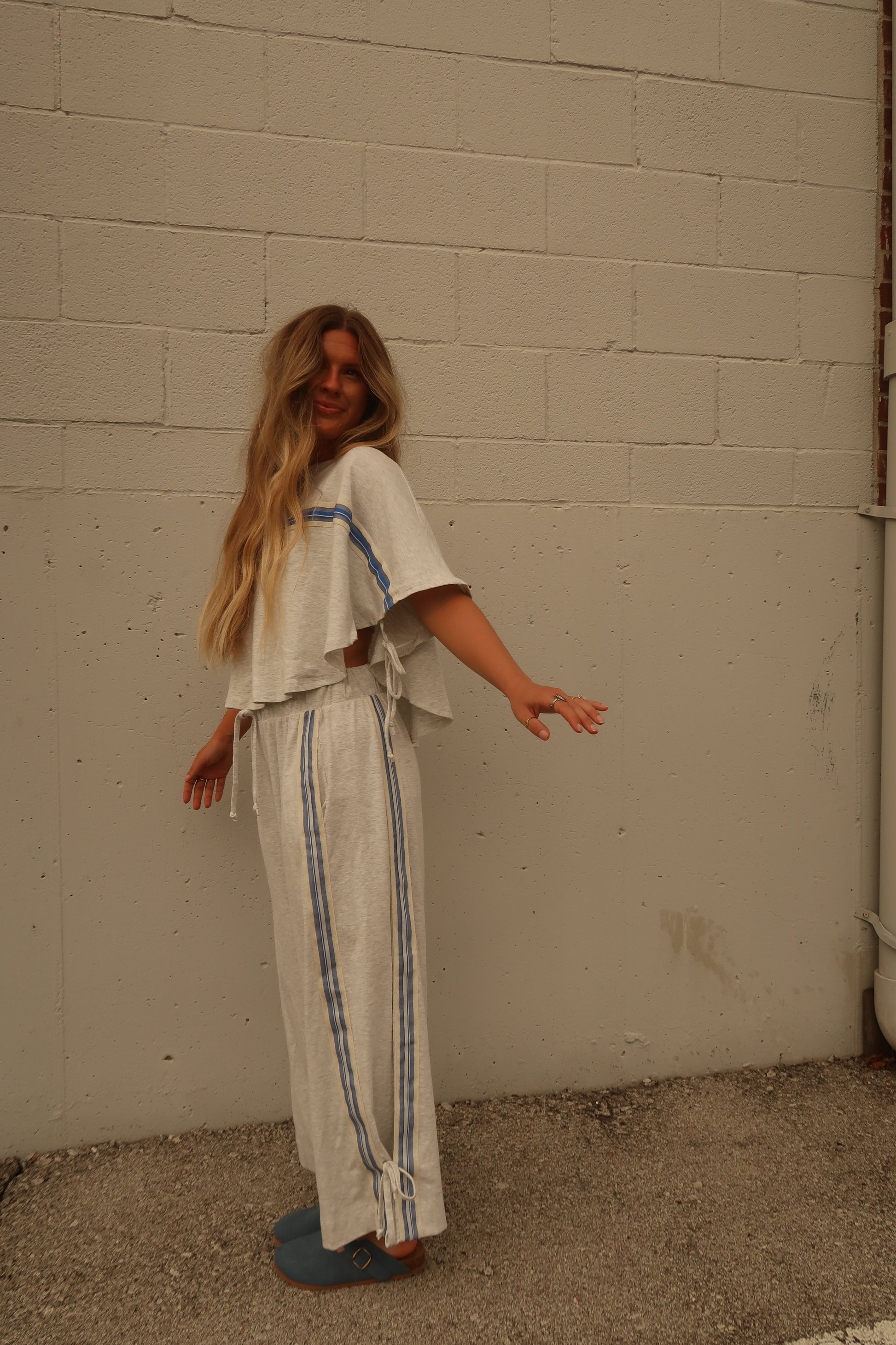 Step into effortless style with the Sunday Slay Set. This light heathered grey ensemble features a flowy top accented by vibrant cobalt blue and cream striping, complete with playful tie strings on the sides. The adjustable elastic waist pants offer a comfy fit, finished with matching tie details for extra flair. Perfect for lounging or casual adventures, this set combines comfort and charm in one chic package.