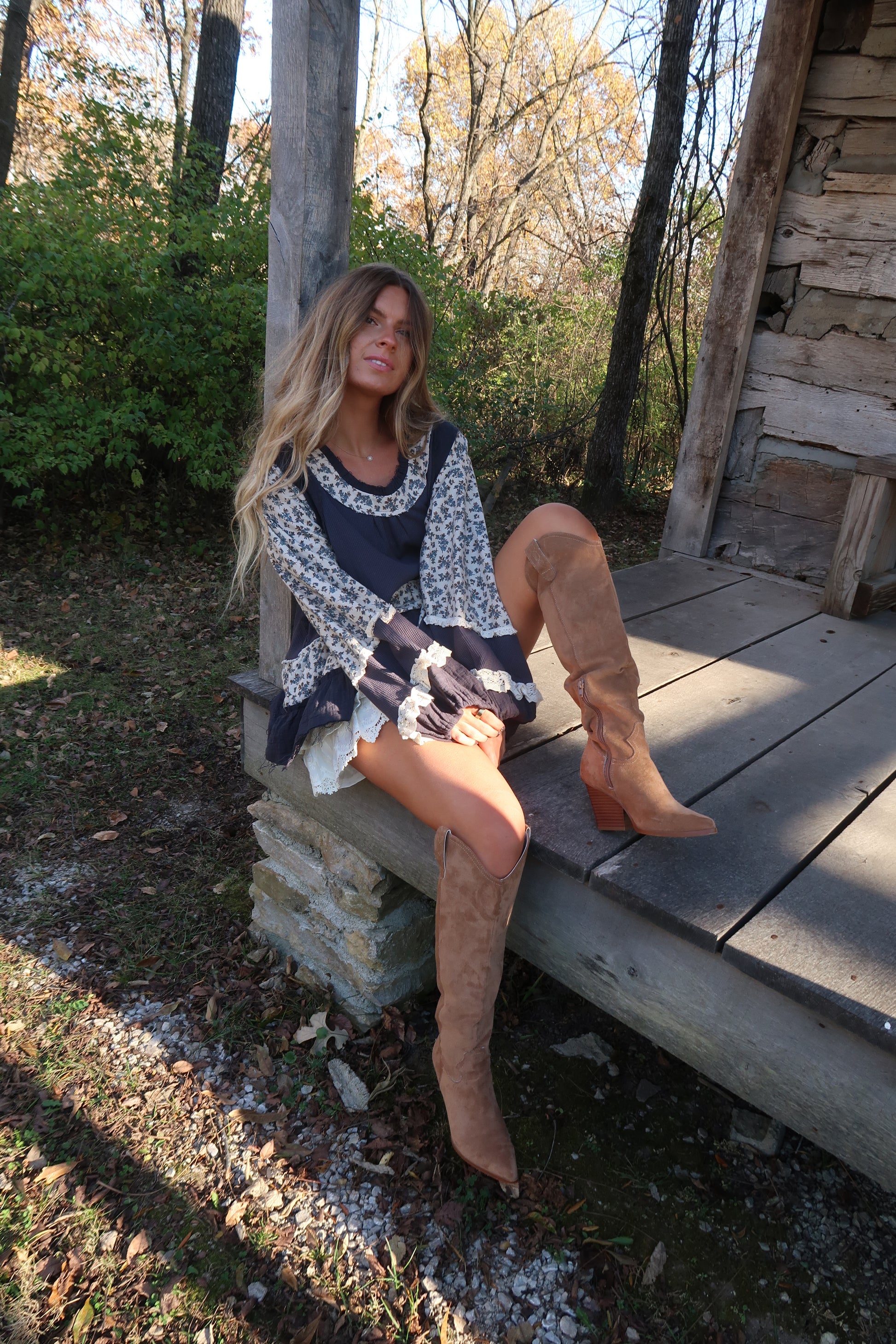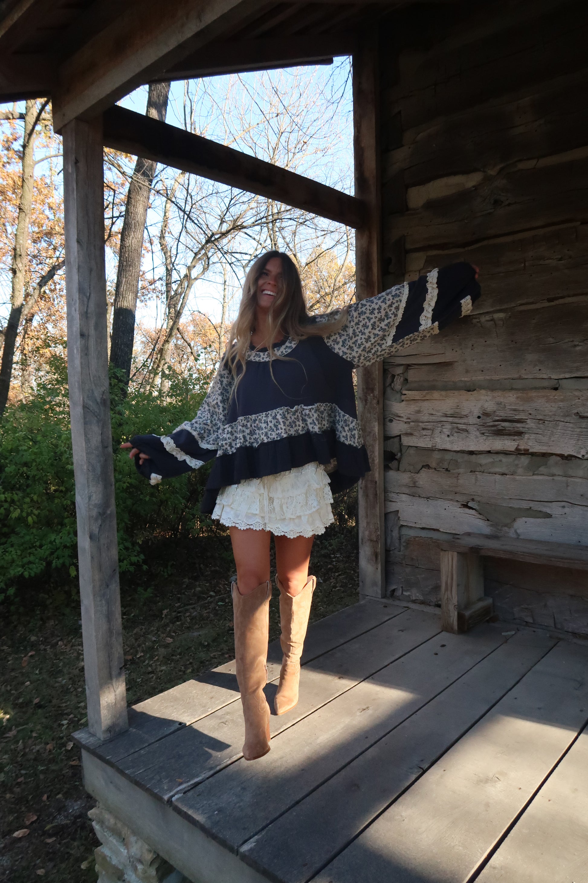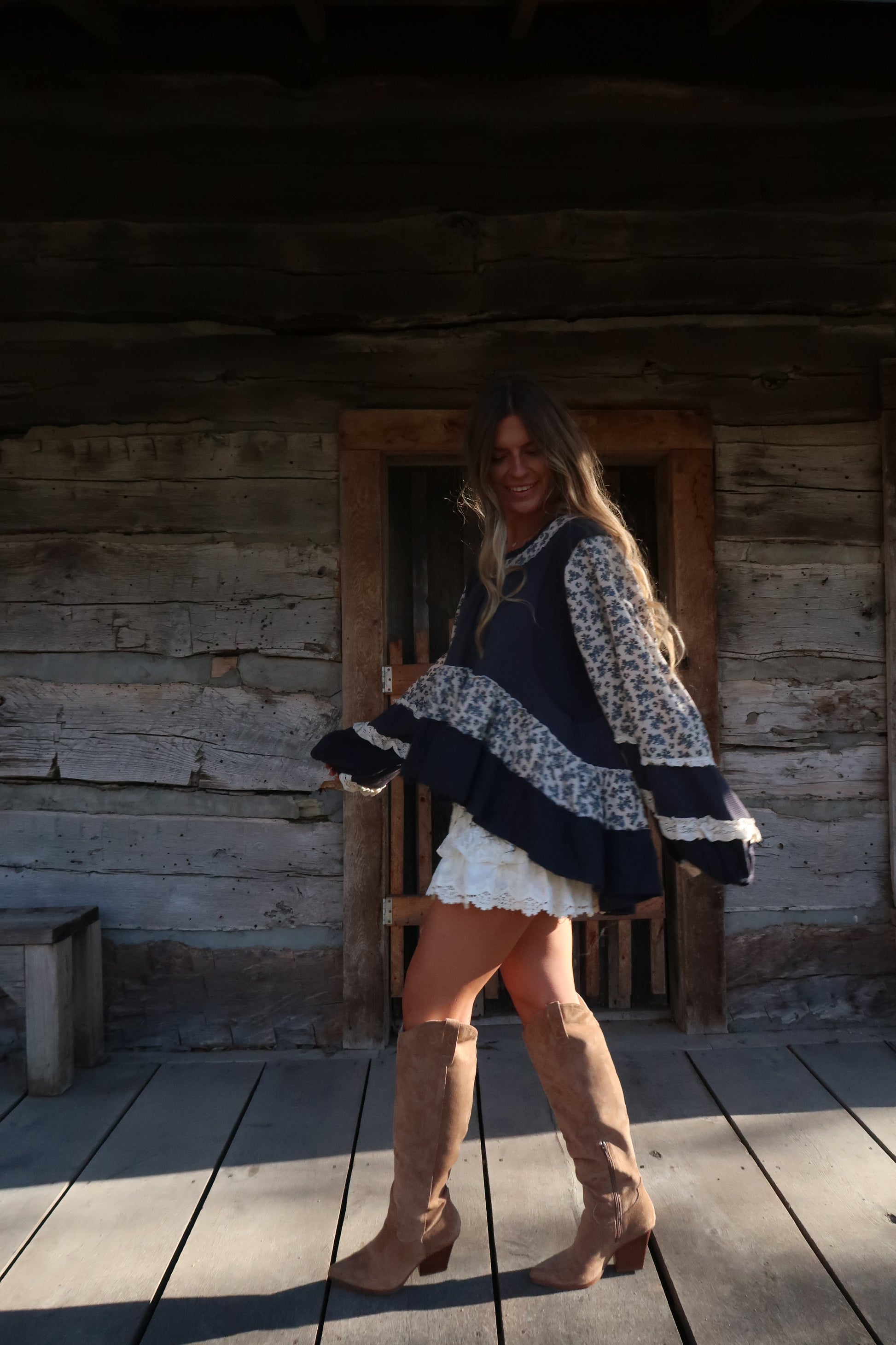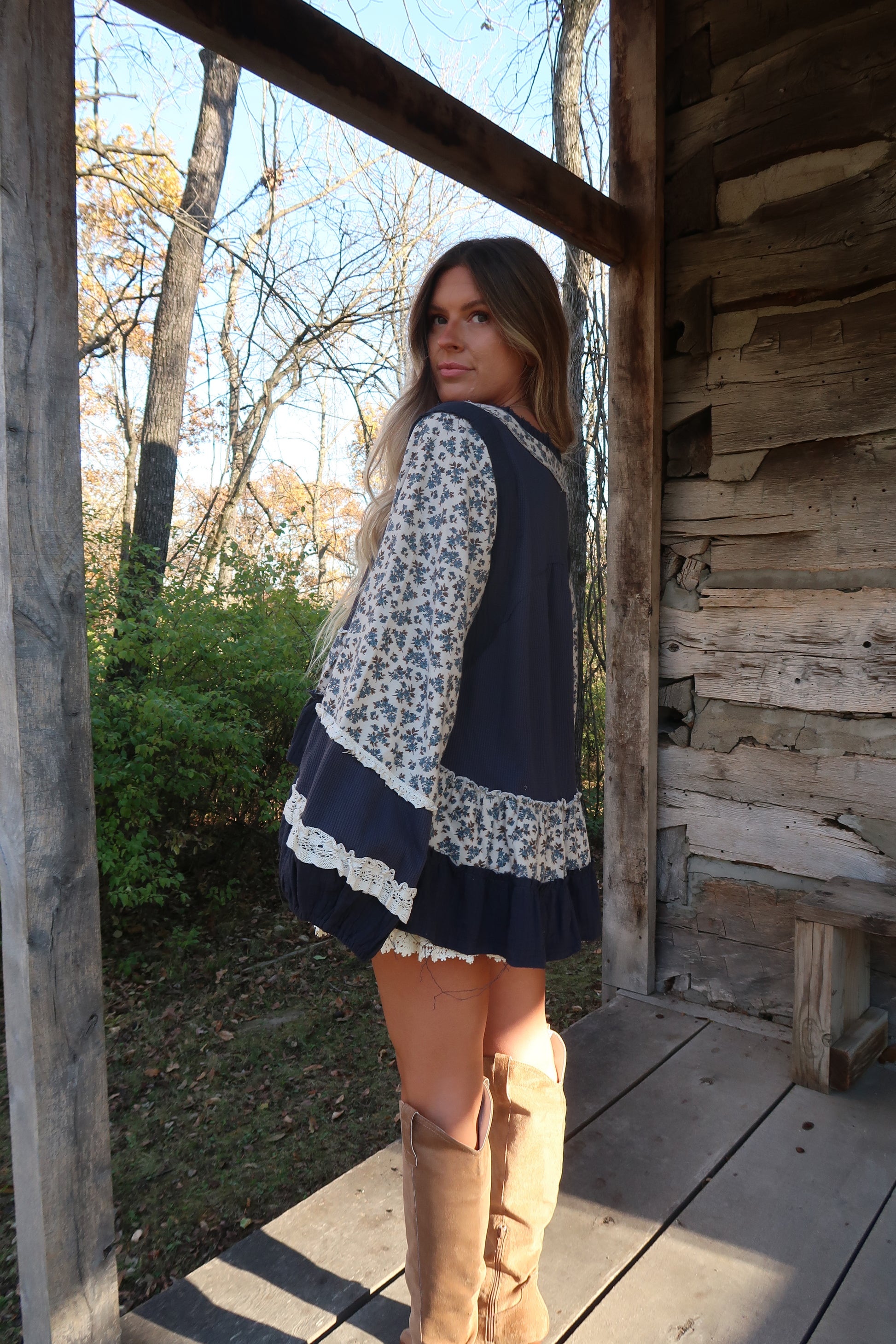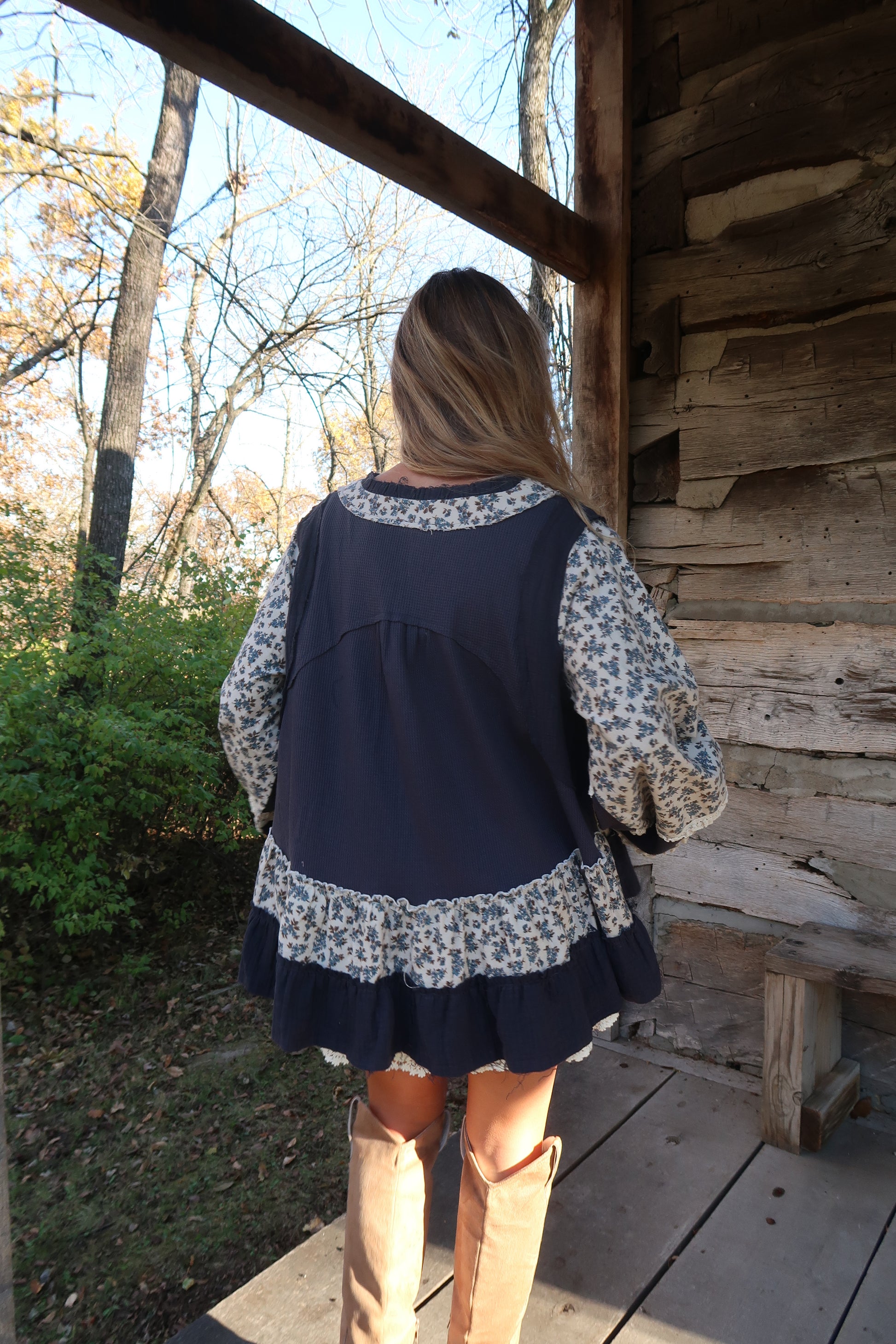Layer up with this playful babydoll top featuring a fun mix of indigo and charcoal patchwork panels. The relaxed silhouette and mixed fabric design create an effortlessly cool vibe that works solo or styled over your favorite basics. Perfect for adding texture and personality to any casual outfit.