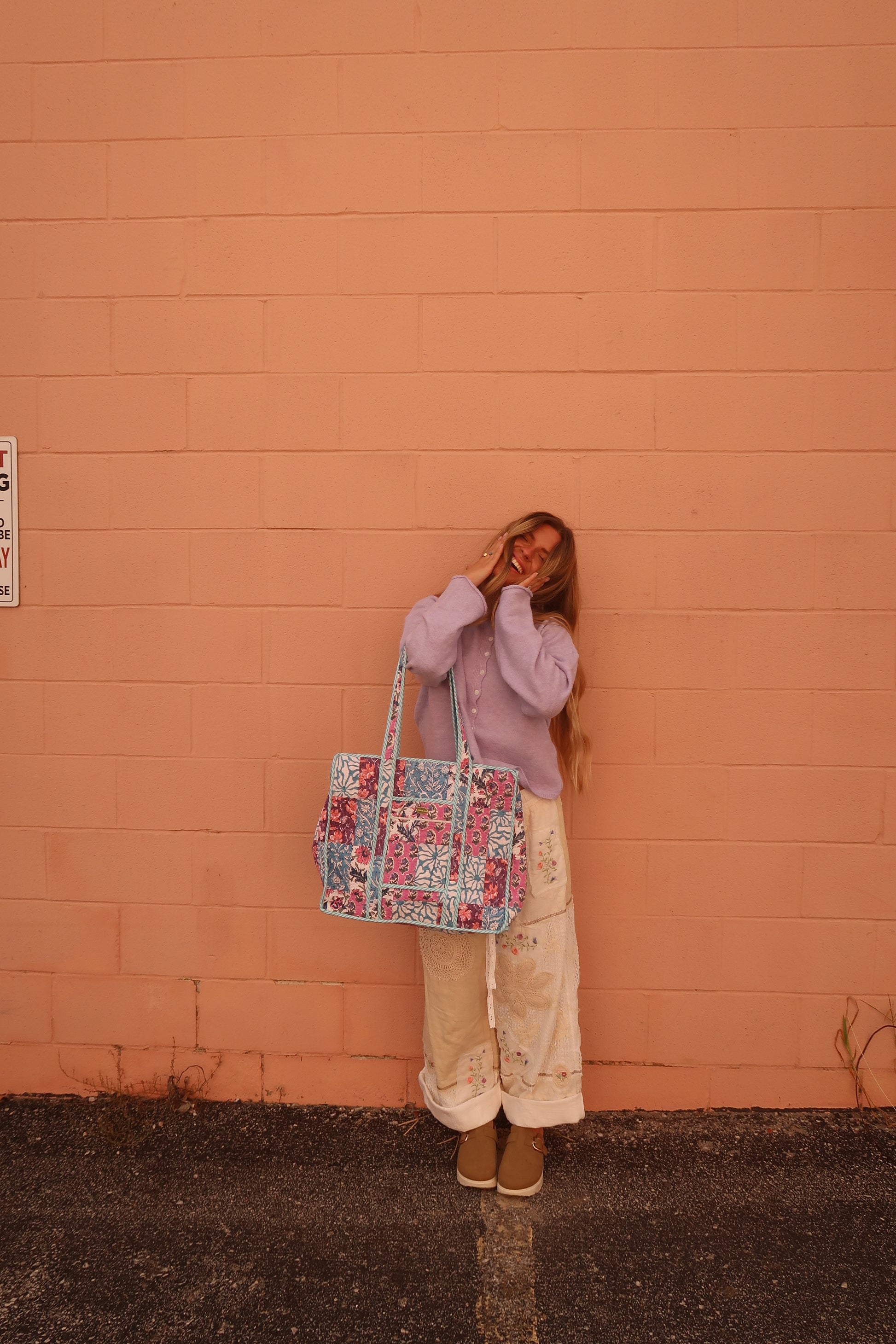 Our sylvia Quilted Dote Bag is a unique purple and teal and patchwork with a beautiful blue and white stripe inside. Our dote bag is our newest style with the style of a tote bag and the functionality of a duffle. Each bag is handmade in India and no two are the same! Each piece of the Quilted Club are designed by and for MJ. All of our quilted bags are lightweight but structured. The tote bag has a pocket on the inside.