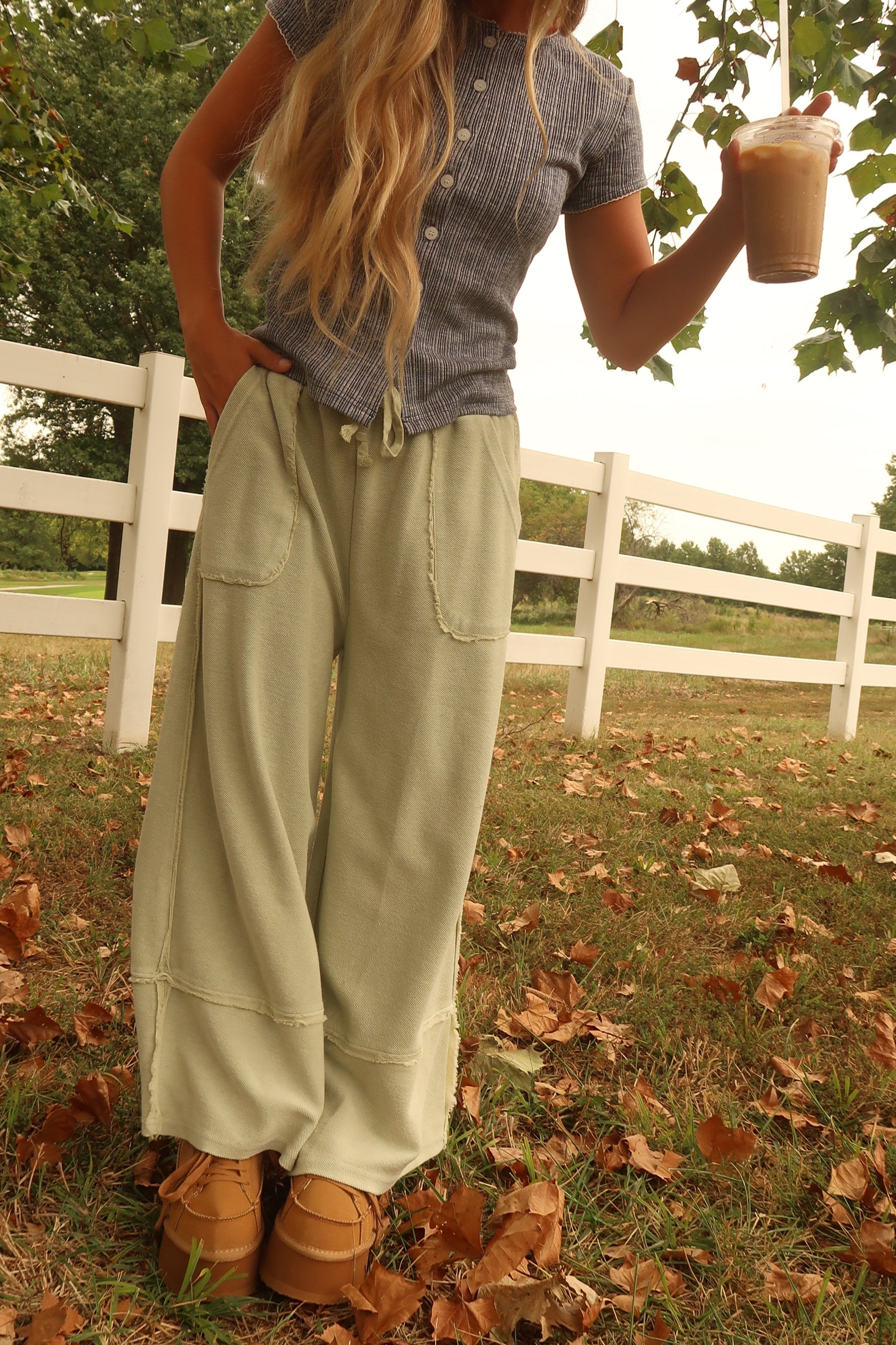 Slip into easy comfort with the Tea Green Wide Leg Crop Pant. Crafted from mineral-washed terry knit, these pants offer a lightly faded green hue that adds a subtle vintage vibe. The wide-leg cut brings effortless style and freedom to your look, while the soft fabric keeps you cozy all day long. Perfect for lounging or casual adventures, these pants blend playful charm with unbeatable comfort.