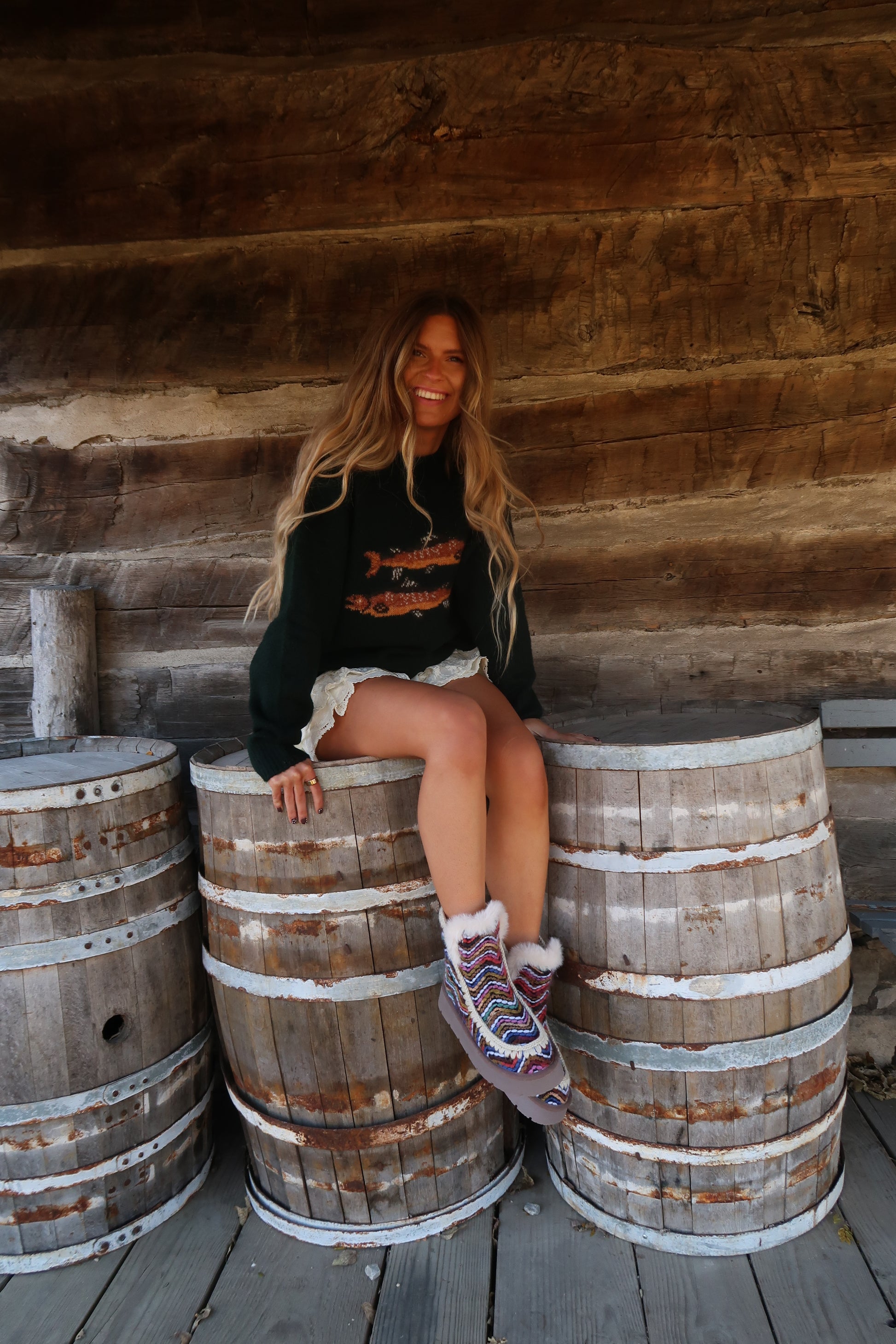 Reel in compliments with this hunter green boxy sweater showcasing a charming brown trout design. The relaxed, oversized fit delivers cozy comfort while the nature-inspired graphic adds personality and a hint of outdoor adventure to your wardrobe. Whether you're a fishing enthusiast or just love quirky knitwear, this sweater is sure to make a splash.