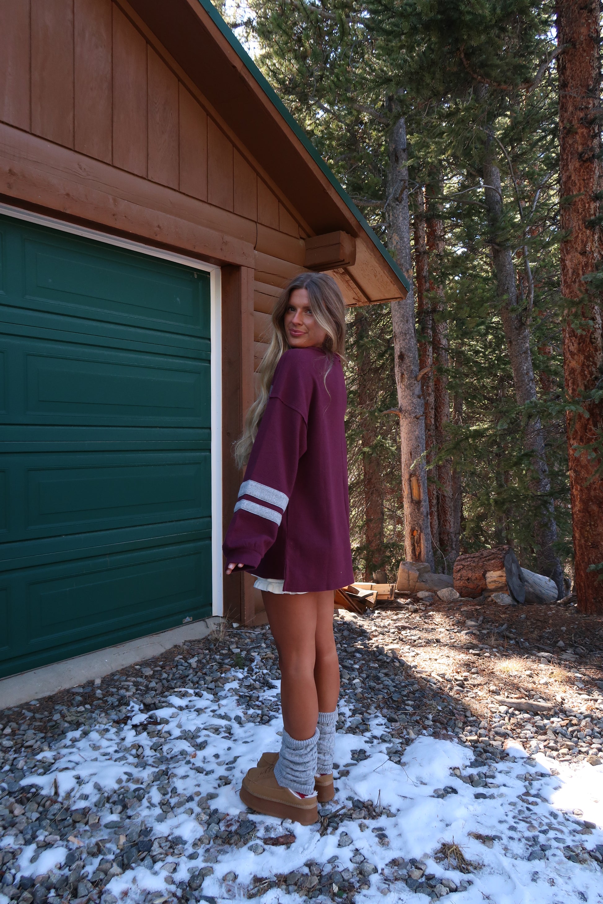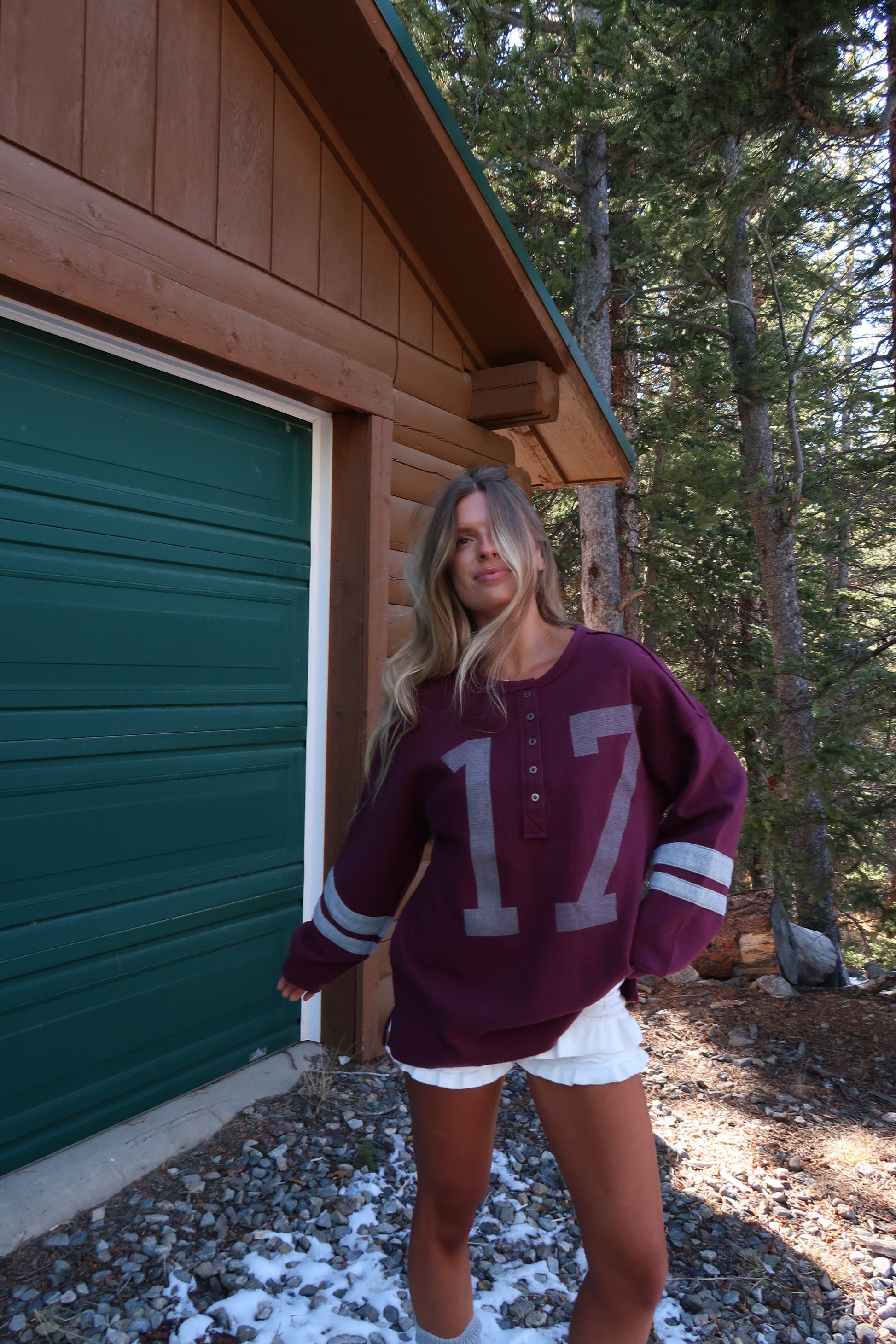Throw it back to your varsity days with this oversized henley that's giving major vintage energy. Burgundy body with grey sleeves and contrast details creates that effortless, just-rolled-out-of-the-gym aesthetic. The relaxed fit makes it perfect for layering or going solo—pair it with your favorite jeans and you're basically a walking mood board. Comfort meets nostalgia in one seriously cool piece.