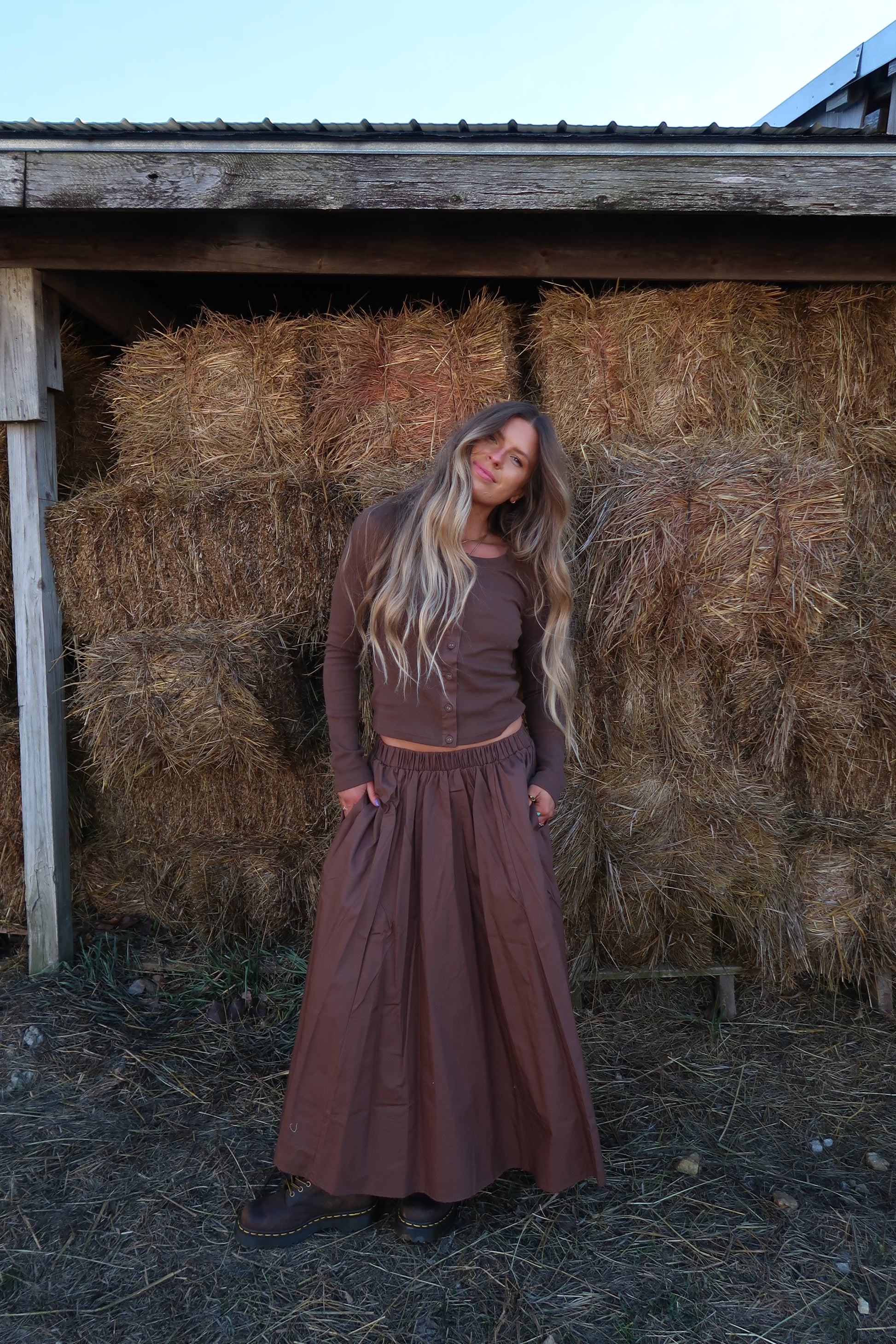 Slip into effortless style with our Walnut Midi Skirt—a wardrobe essential that checks all the boxes. This rich, dark walnut brown beauty features a comfortable elastic waist that moves with you, a flattering midi length, and the cherry on top: functional pockets. Perfect for everything from casual coffee runs to weekend adventures, this skirt pairs beautifully with your favorite tees, sweaters, or blouses. Comfort meets chic in one irresistible package.